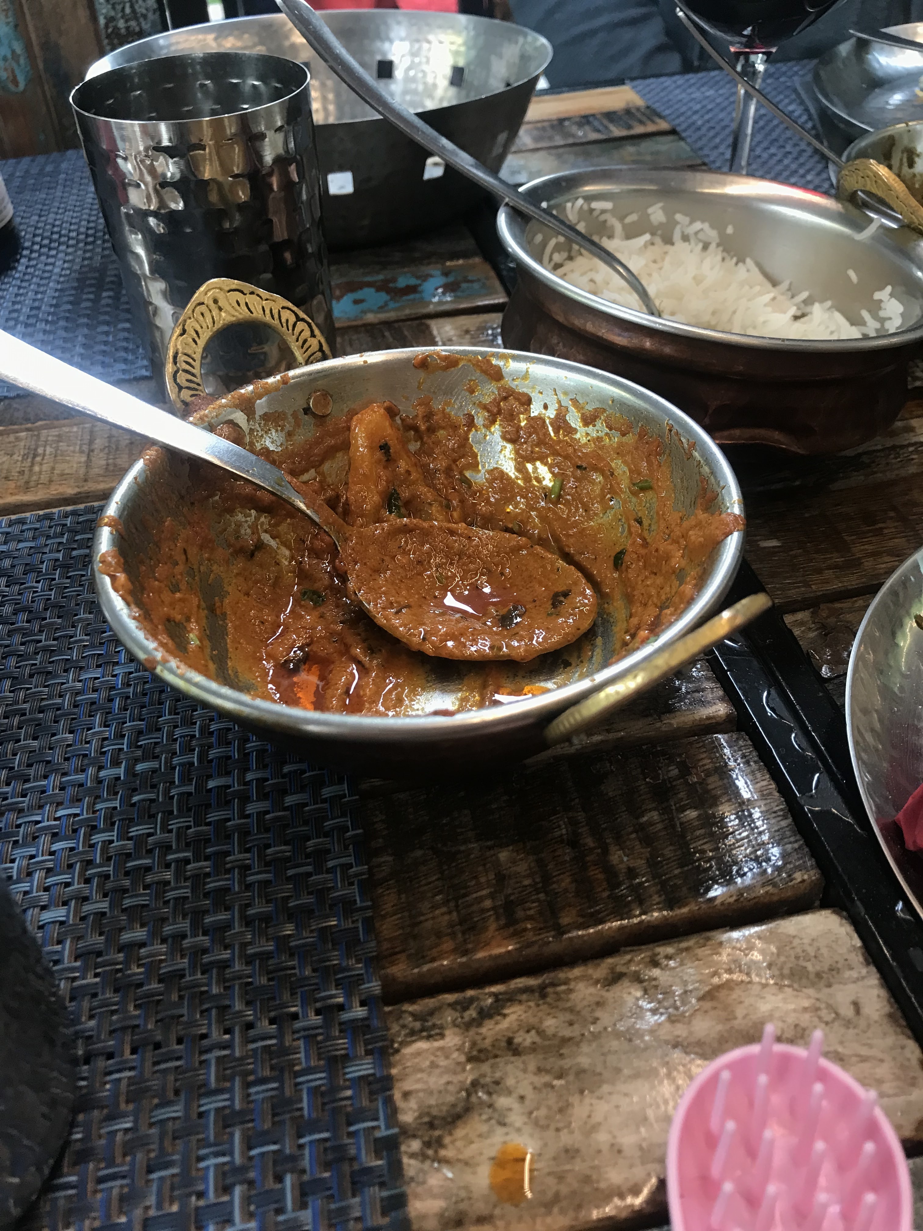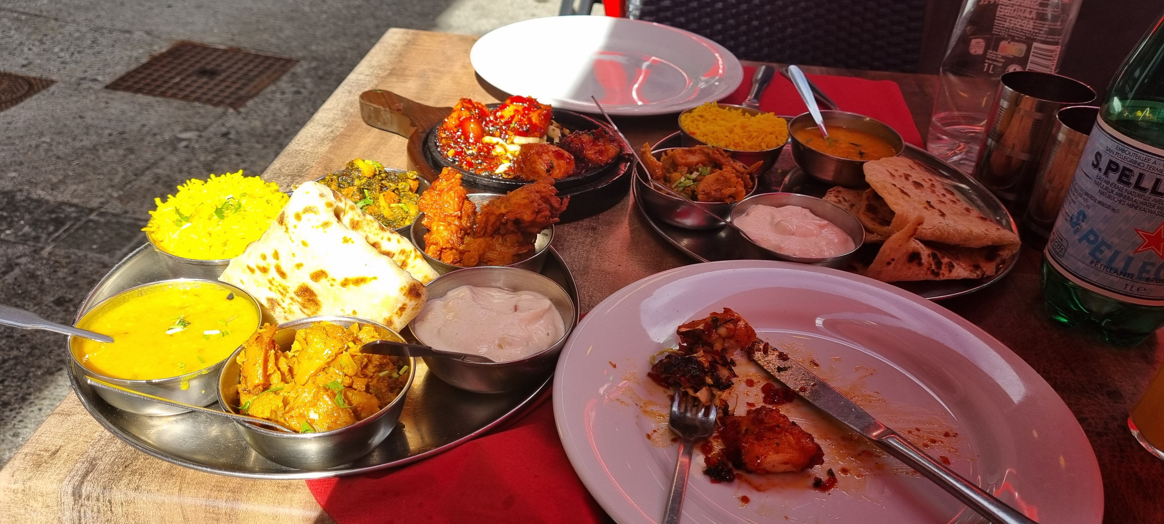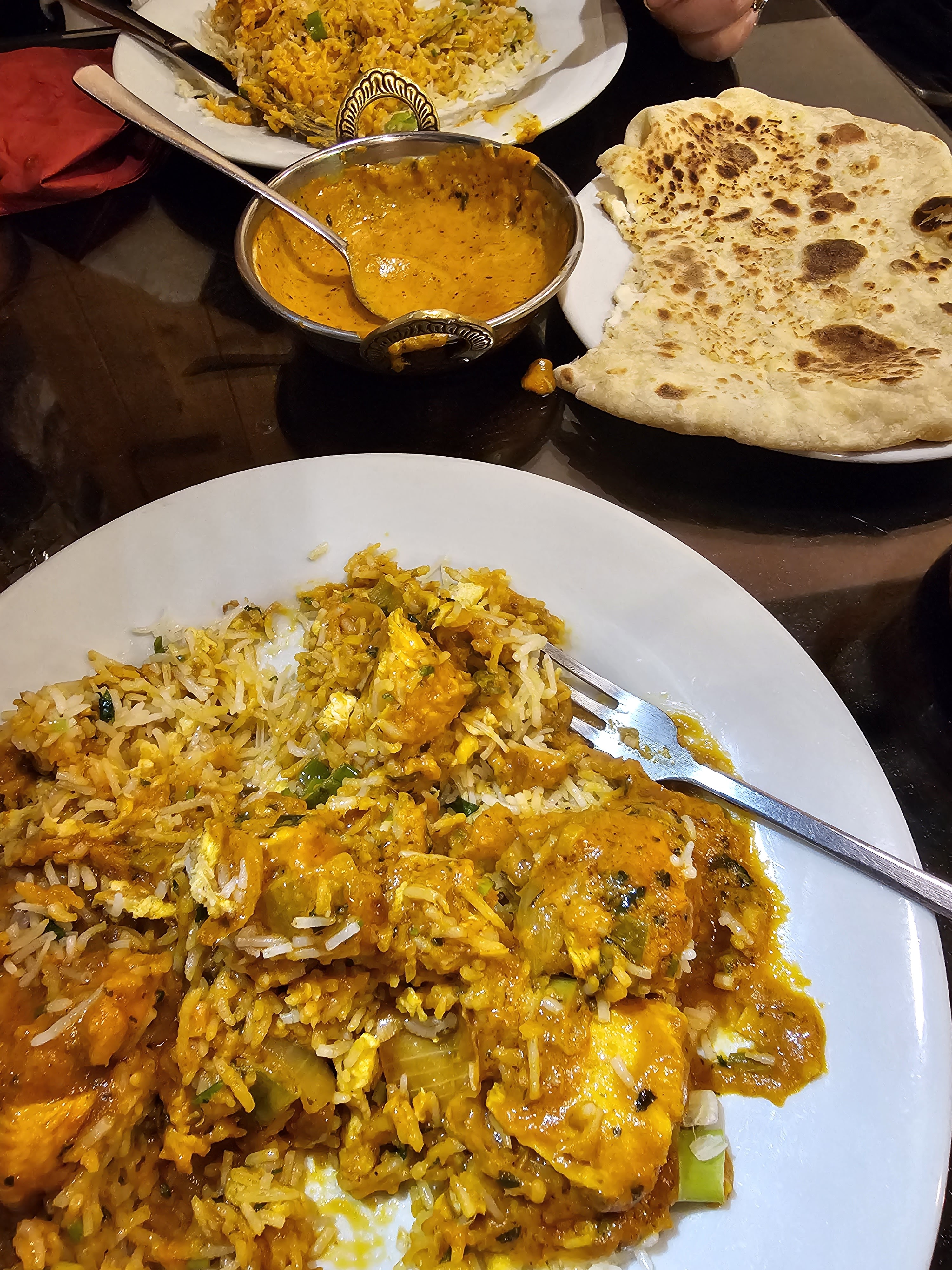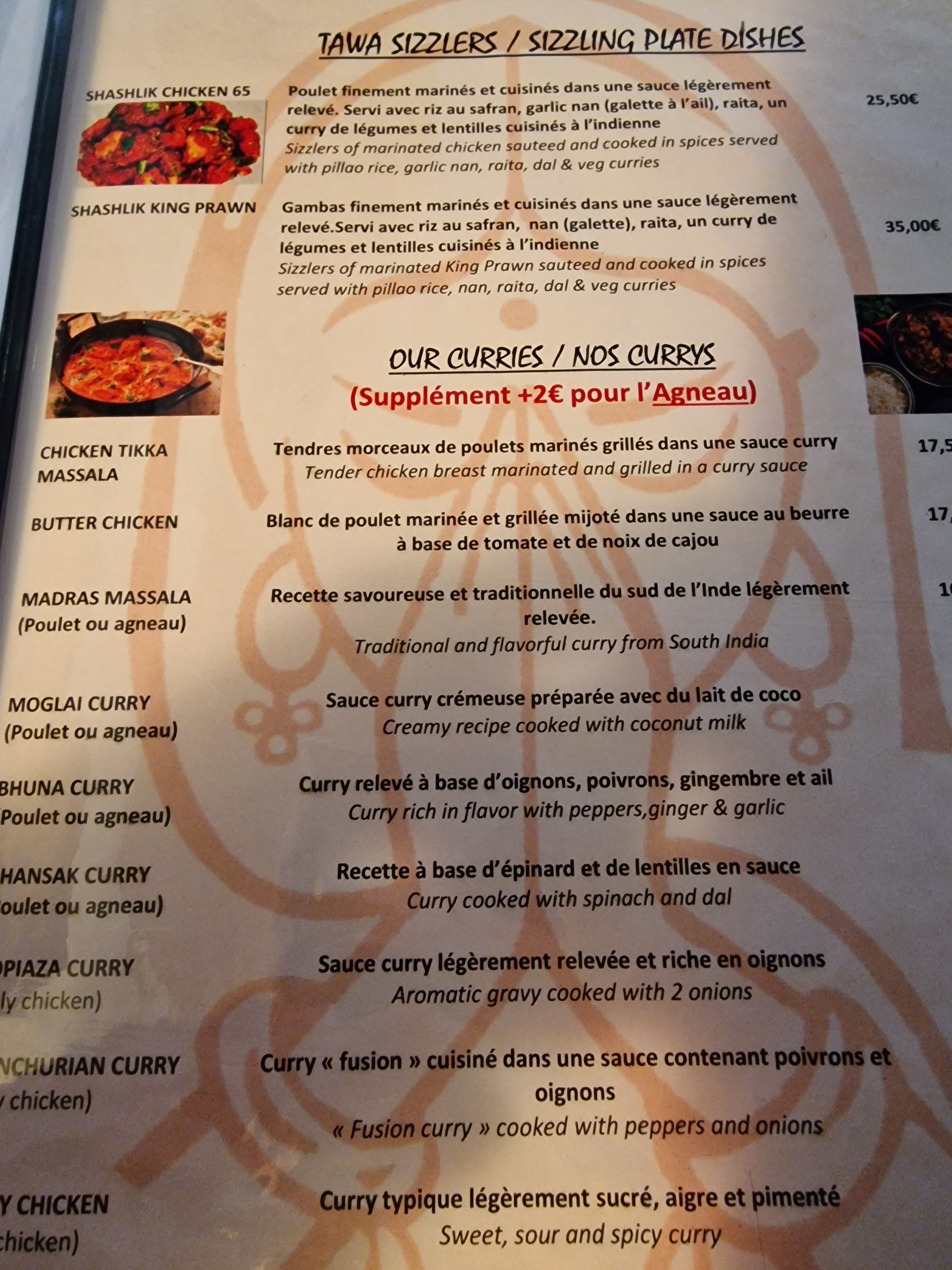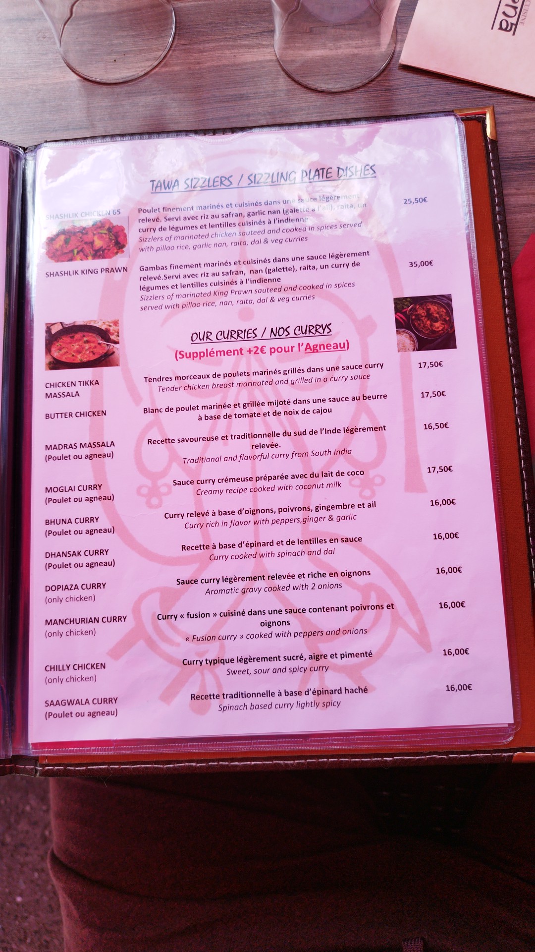 N'étant aucun fans des plats relevés, nous avions choisi des plats non renseignés comme spicy. Cependant mon fils et moi avons ingurgité les 2 carafes d'eau, le raita gentiment offert par le serveur voyant mon teint rouge vif, pour survivre 😅. Néanmoins, c'était très bon. Le fait que les plats n'incluent pas les accompagnements (assez chers et en petites quantités: 7 euros pour une petite petite salade, 3 euros pour une cuillère à soupe de chutney... ) implique que l'addition devient finalement elle aussi assez épicées.