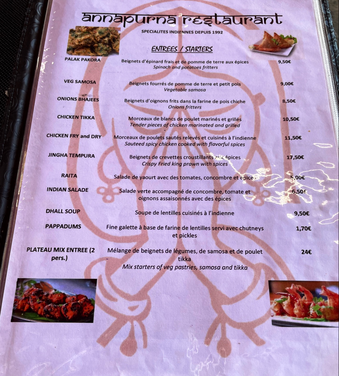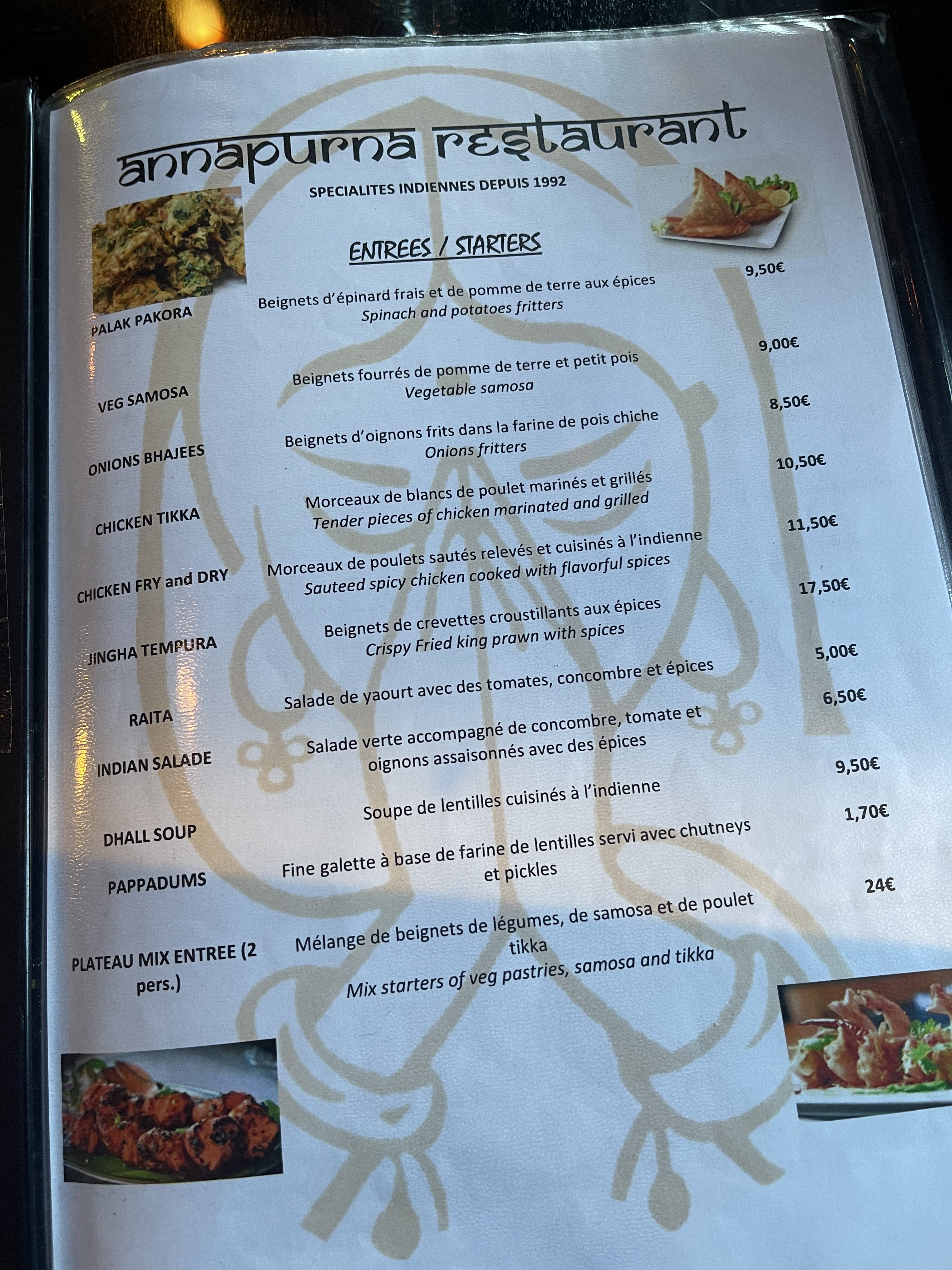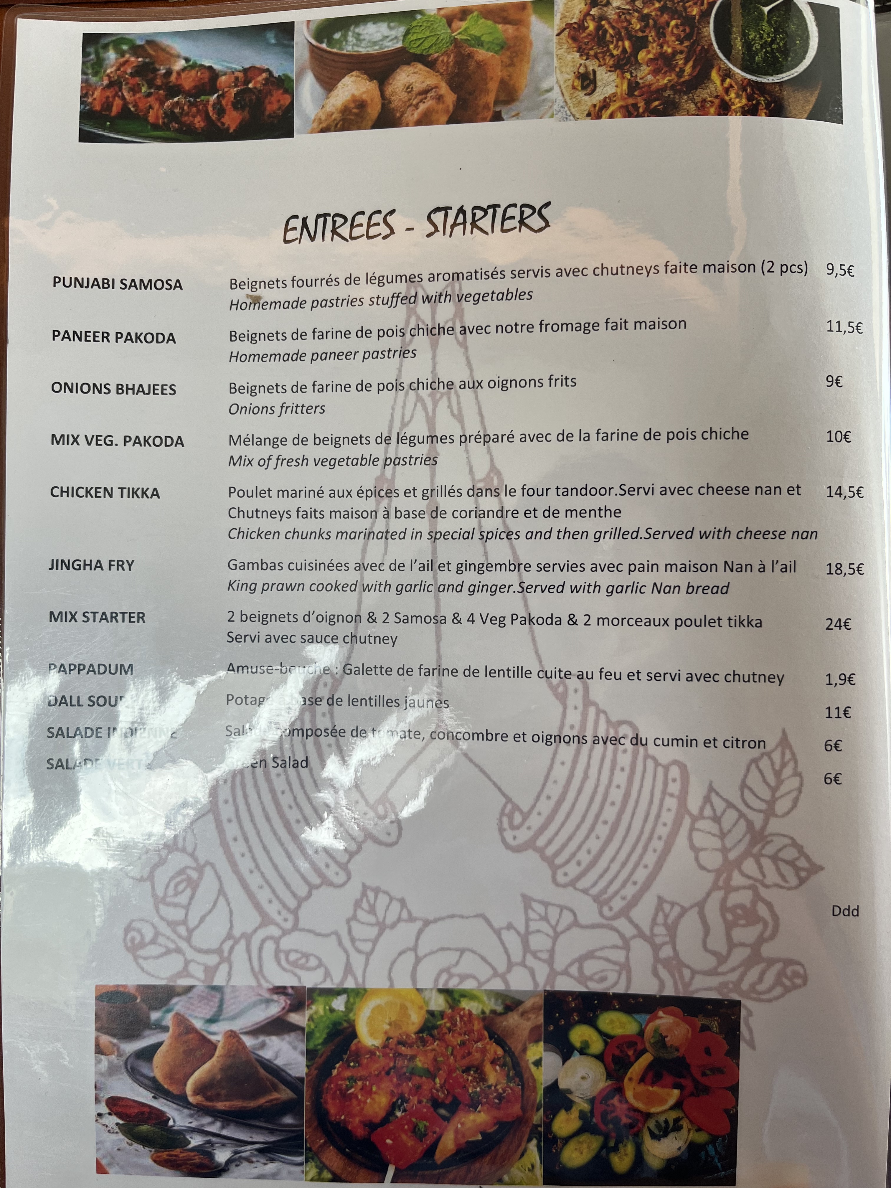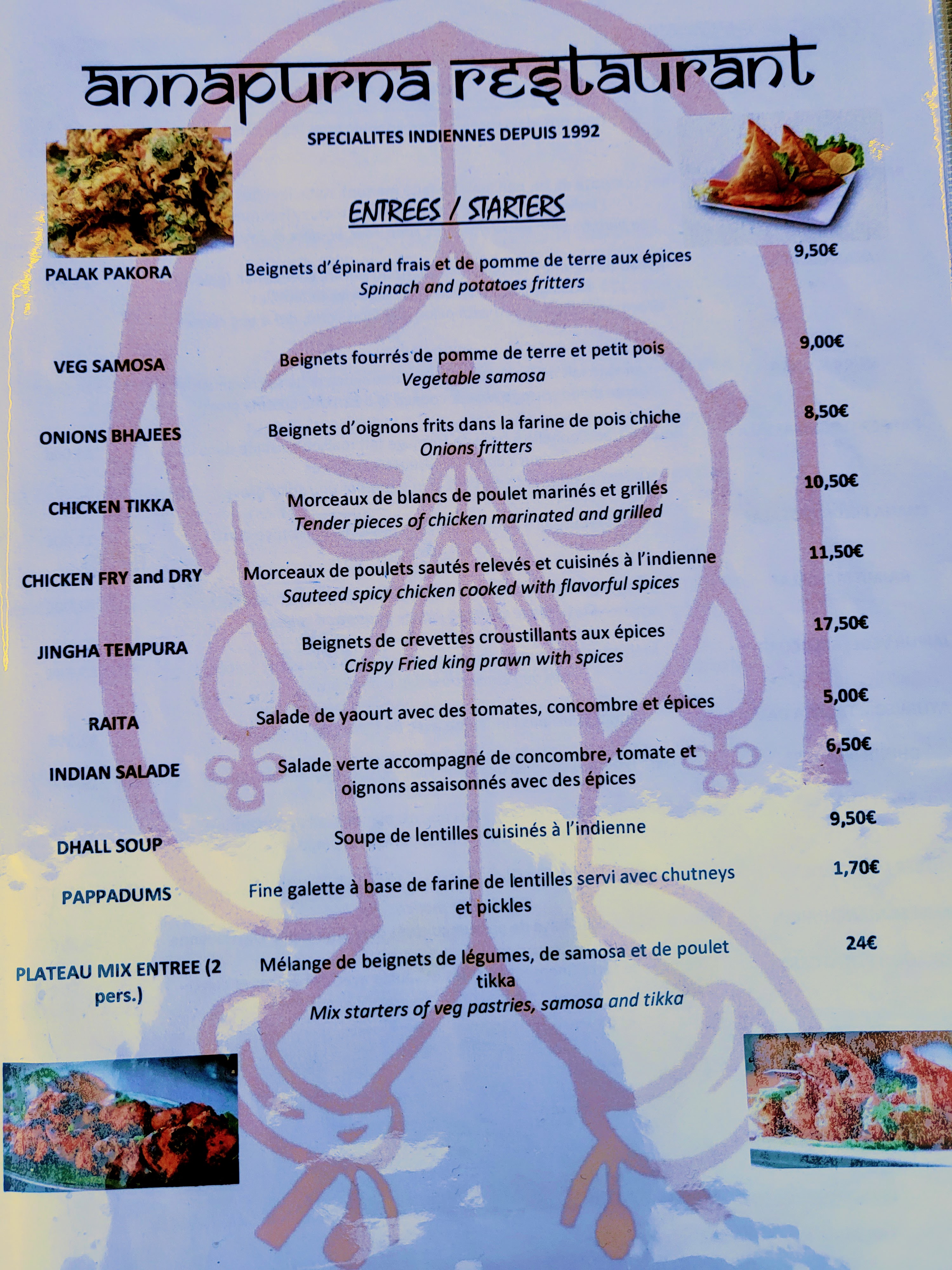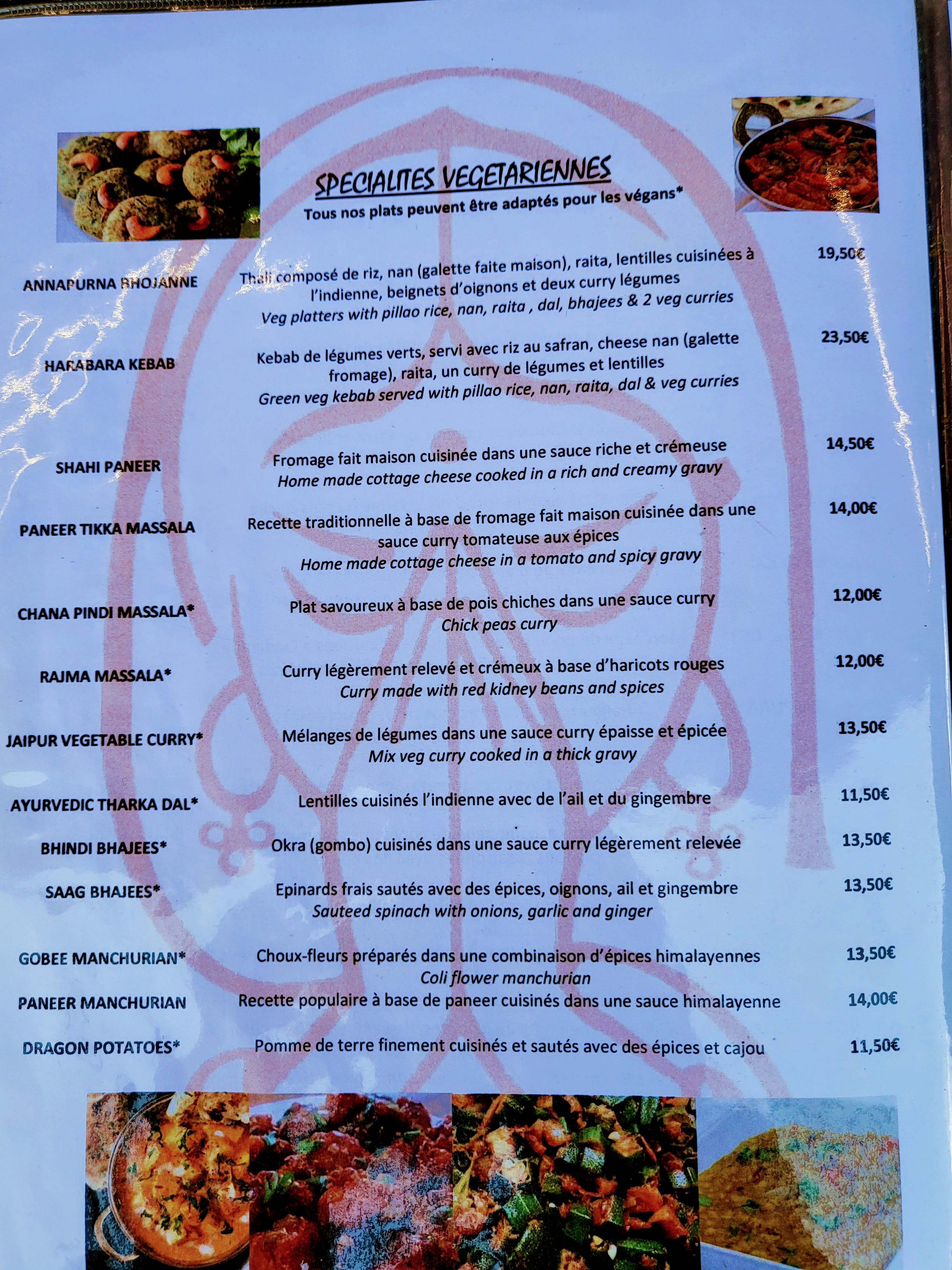 La qualité est vraiment moyenne. Le serveur n'a pas l'air d'aimer son travail. Il exige de savoir votre choix même si vous dites que vous êtes en train de voir le menu. Il nous demande de parler tantôt en Français tantôt en Anglais. Des petites portions, ça n'a rien avoir avec un vrai menu Indien. Je comprend que c'est un lieu touristique, mais une portion de riz nature à 4 euros c'est abusé et c'est trop chers pour ce que c'est surtout que la qualité et les saveurs n'étaient pas présents.