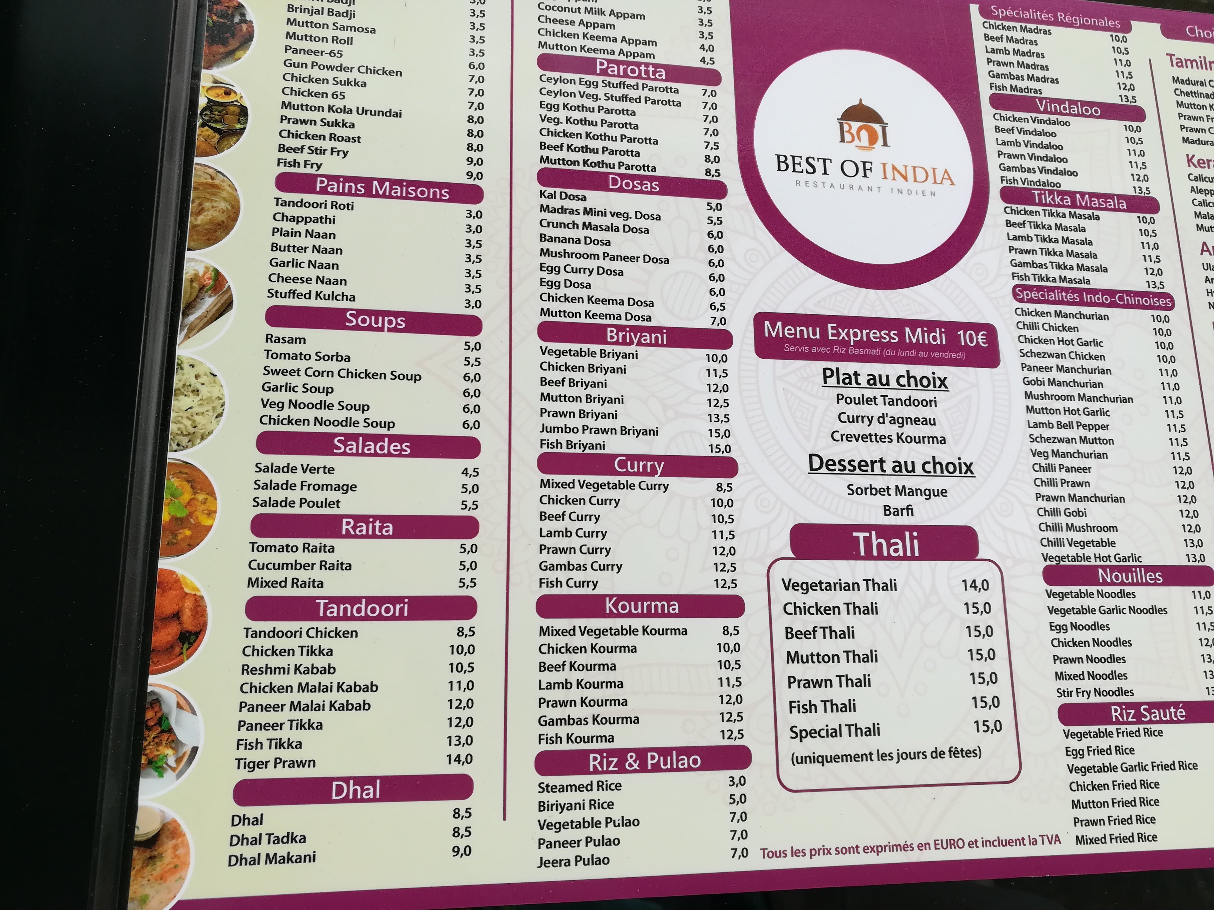 L'accueil est chaleureux et la Vindaloo très chaud !! Nous avons mangé à deux à midi, à la carte : pakora d'oignon, naan au fromage et tomato raïta suivi par beef vindaloo et poulet Muchadai. Restaurant agréable et propre - consignes sanitaires respecté. Le serveur très poli et accueillant ...à recommander chaleureusement (surtout le vindaloo) !!