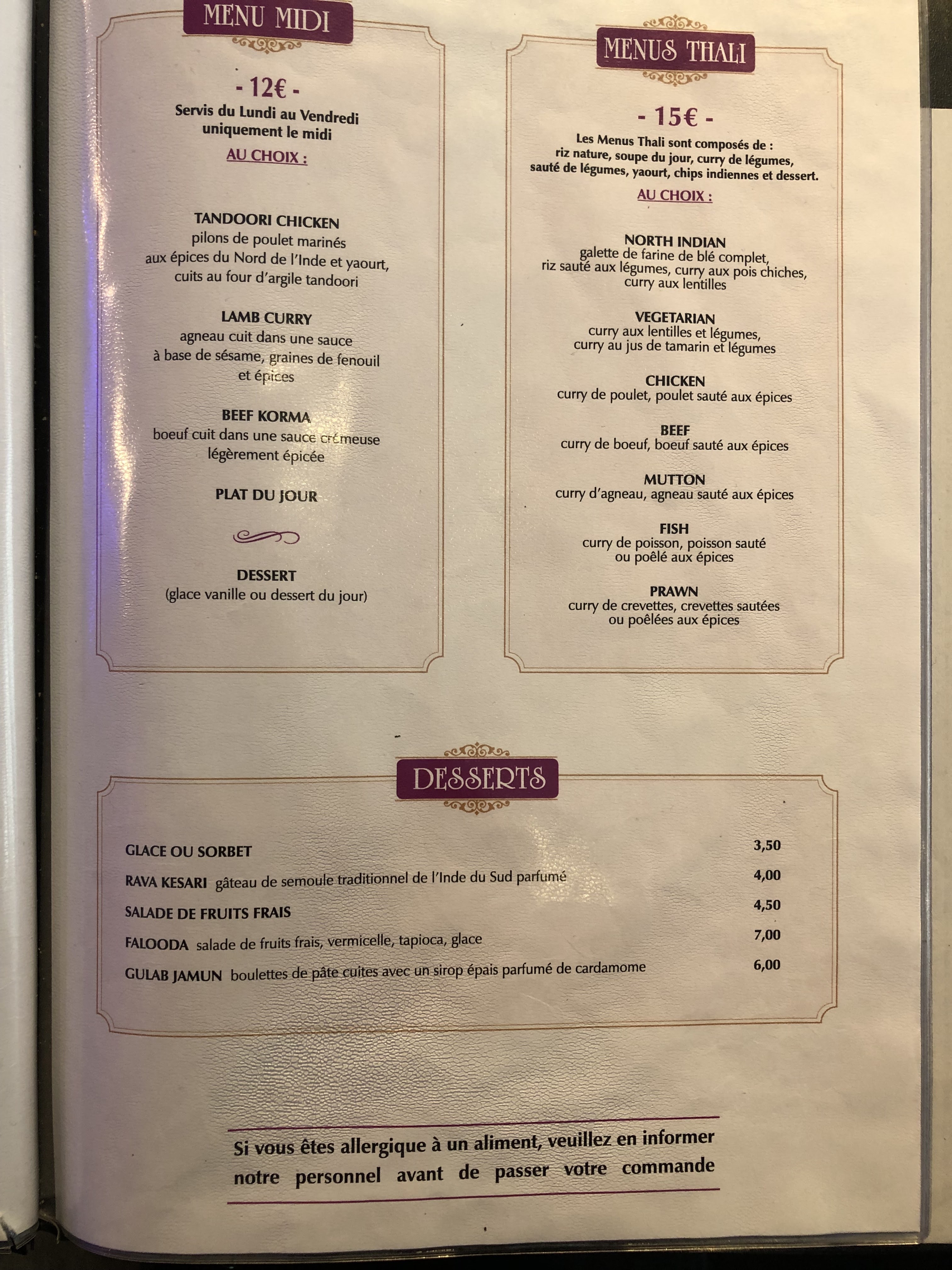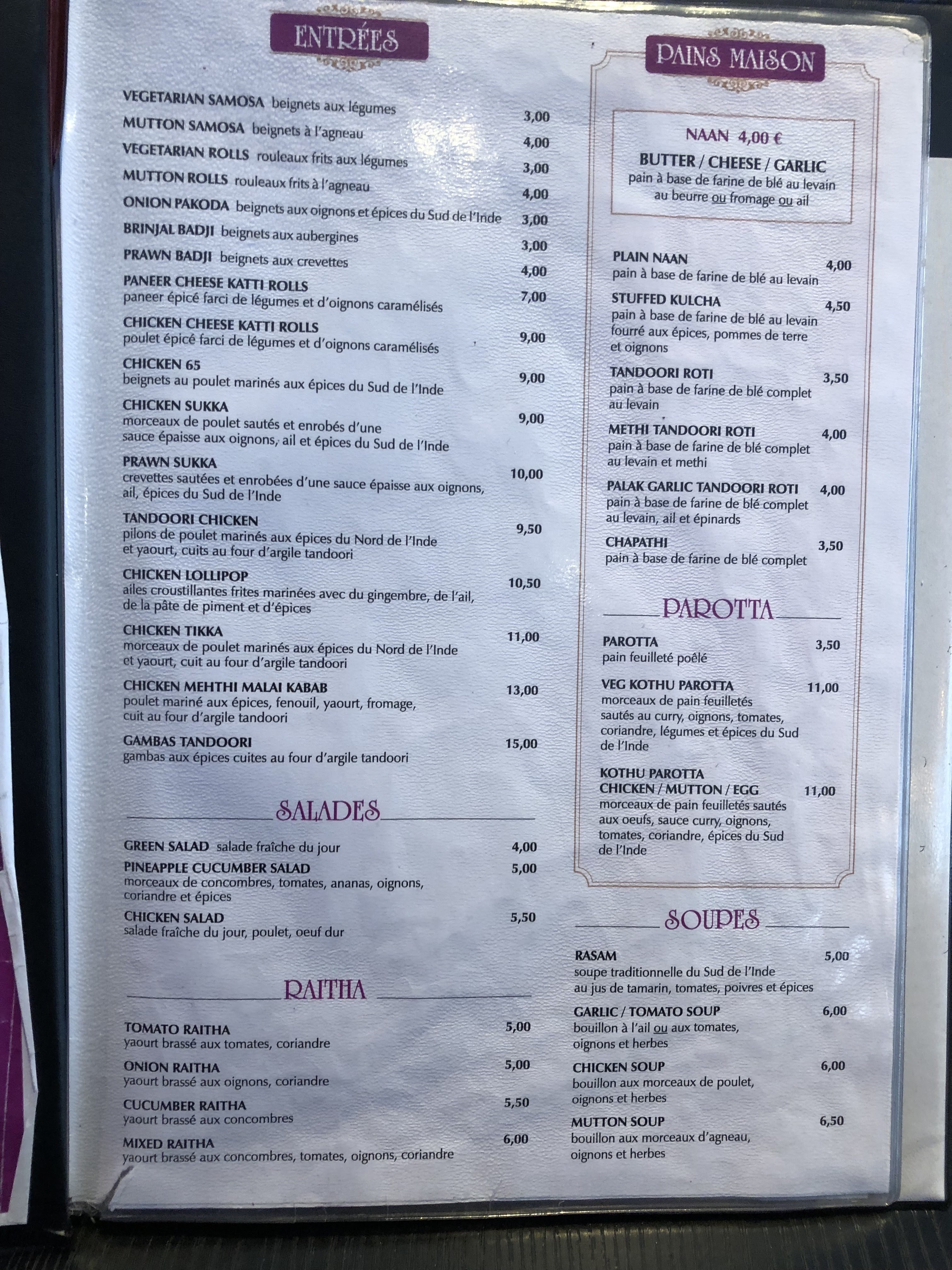 Très bel établissement, situé tout près de la Gare du Nord. Service impeccable: la jeune femme, comme l'ensemble des personnes assurant le service sont discrets et fort souriants. Pas de musique au fond sonore tapageur. On est transporté, par les plats et l'atmosphère qui se dégage de cet établissement, en Inde. Une salle visible de la rue et une arrière-salle plus intimiste au fond de l'établissement. Mon smartphone surchauffait, d'où une piètre qualité de ma photo qui donnera néanmoins un aperçu de ces plats. Accès métro Gare du Nord tout près. Un établissement très réputé à Paris, comme me l'a dit mon voisin de table (qui semblait connaitre toutes les bonnes adresses de restaurants de Paris); une amie connaisseuse de la cuisine indienne authentique, puisqu'originaire de Pondichéry, me l'avait déjà recommandé il y a longtemps. Un seul conseil: allez-y à votre tour !