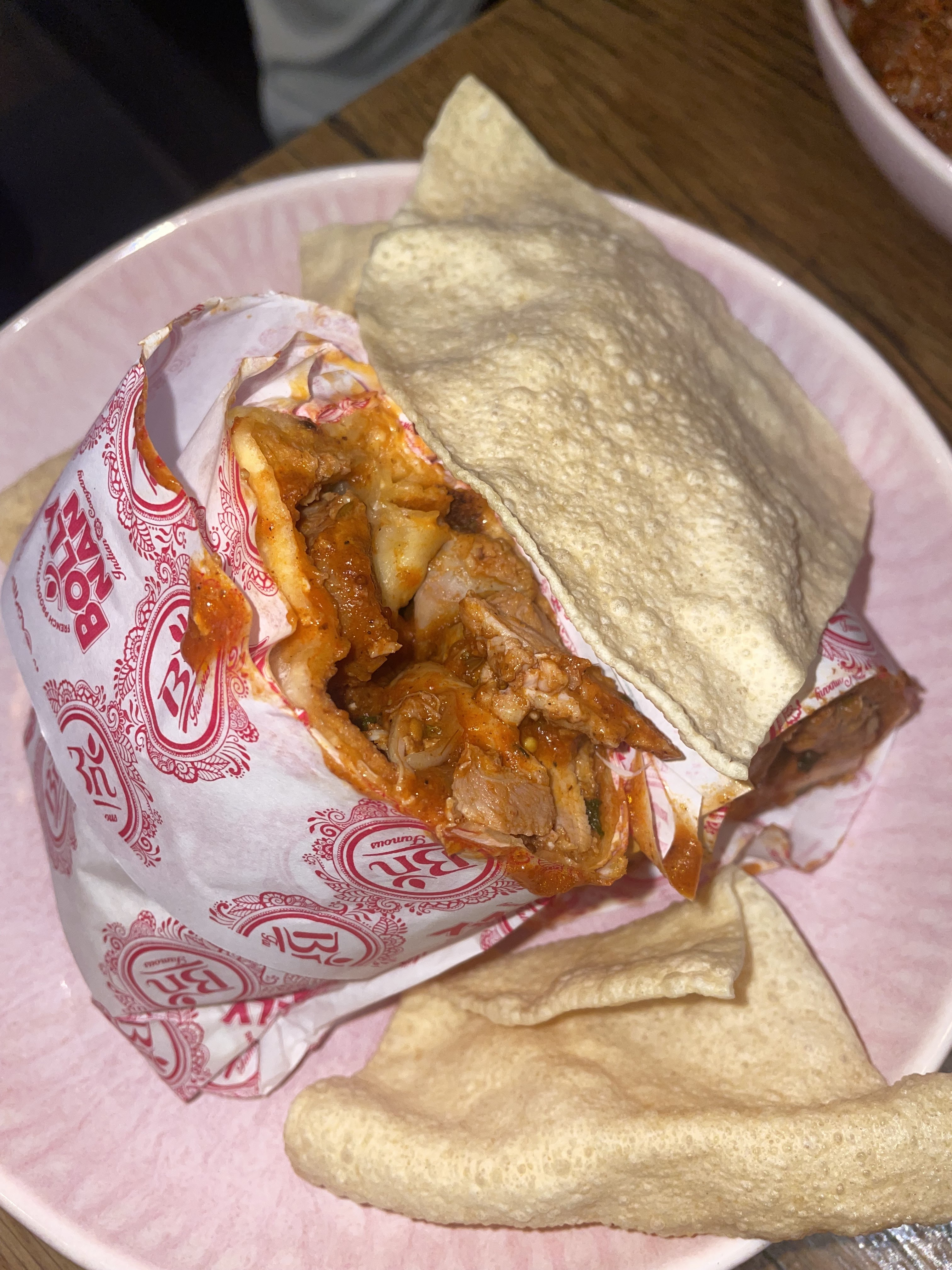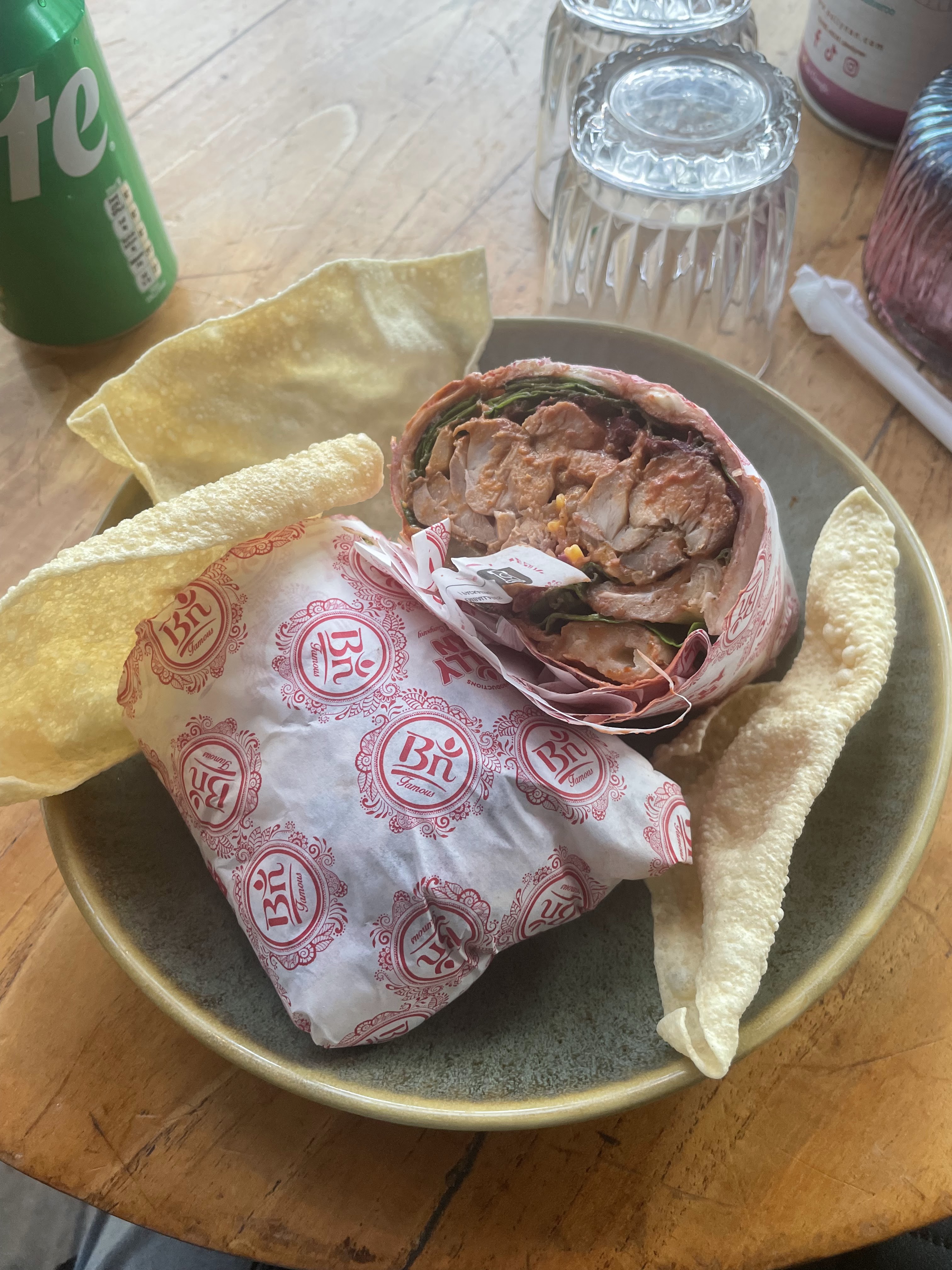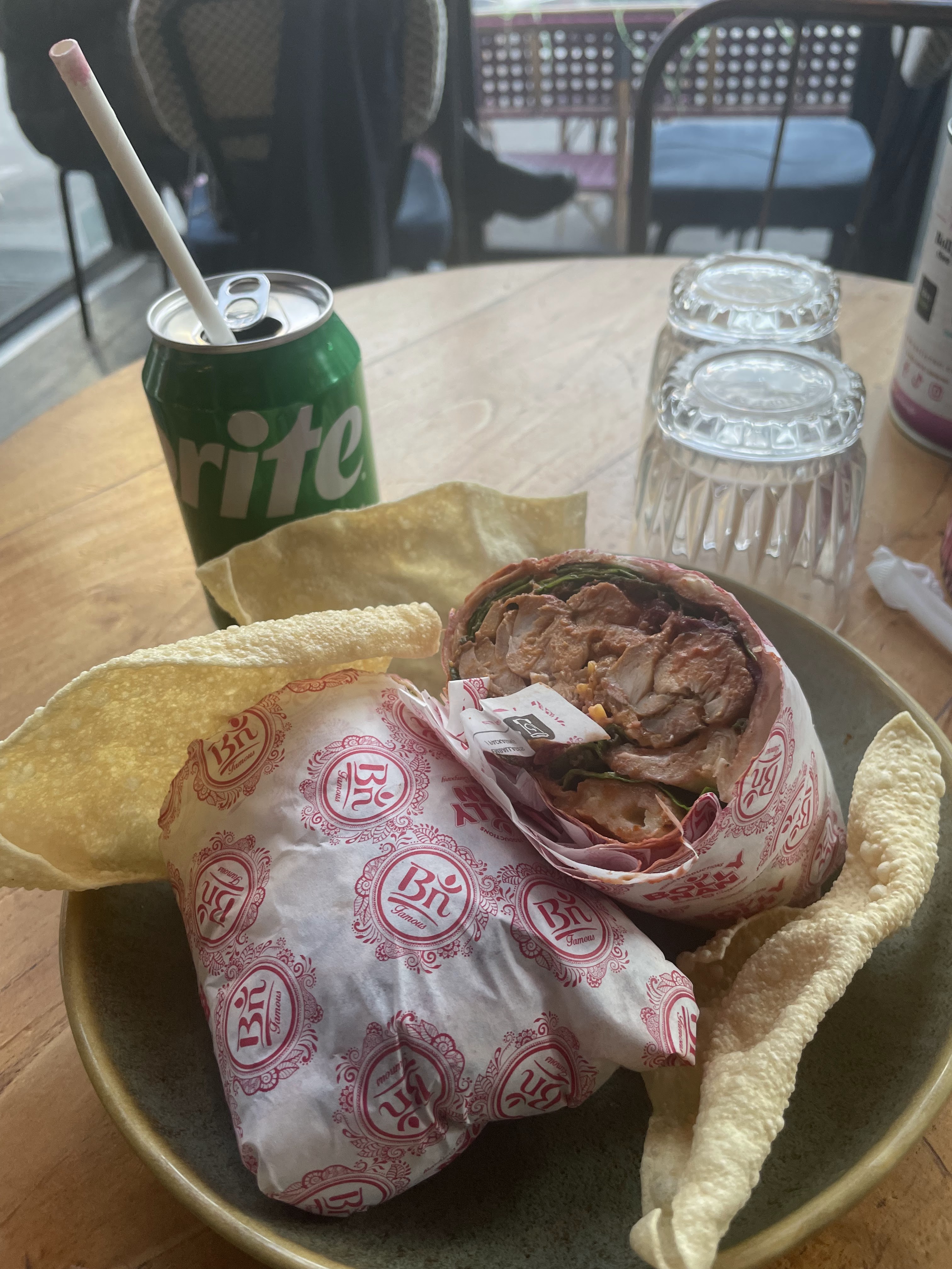 Nous avons opté pour une la restauration rapide avant notre séance de cinéma et nous avons commandé le sandwich « Bollynan » (à emporter), dans le restaurant du même nom. Il y a 3 choix possibles : Viande, poulet ou tofu. Et l’on peut rajouter des ingrédients en payant un surplus. Le sandwich est excellent, élaboré avec des produits frais, suffisamment copieux, et pleins de saveurs ! Le seul bémol, il n’est pas très pratique à manger et j’en avais partout sur mes habits 😩.