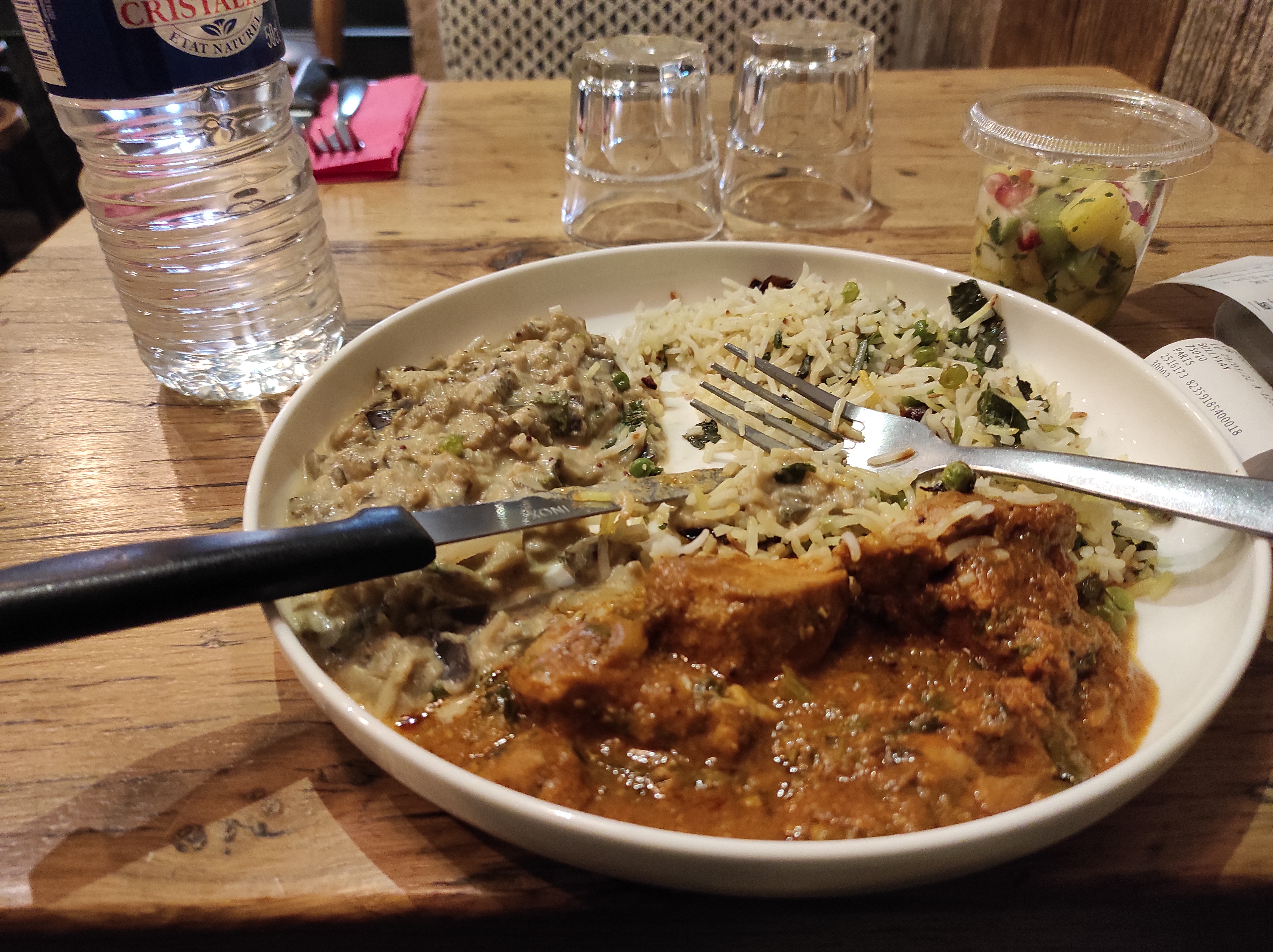 Lieu très sympa, service rapide et cordiale. J’ai pris le saumon avec caviar d’aubergine et riz légumes , et mon copain à pris du chicken butter avec caviar d’aubergine également et du dhal. Tout était très bon niveau goût et assez copieux. Bon rapport qualité prix. Par contre vous utilisez des assiettes en carton même si on mange sur place!! C’est juste pas bien. Pour quoi ne pas utiliser des assiettes en céramique? Dommage. Je mets 3 étoiles pour ça :/