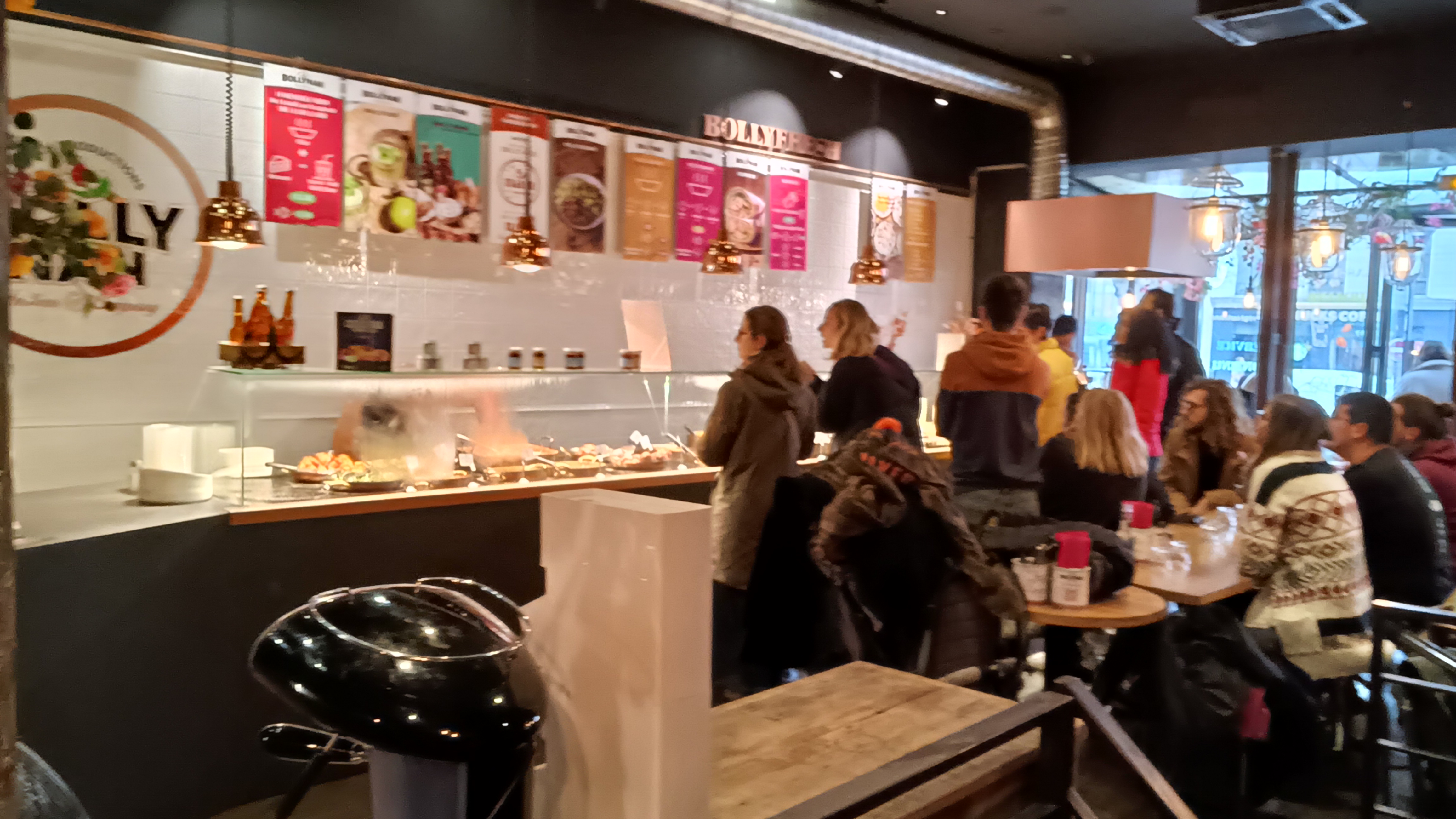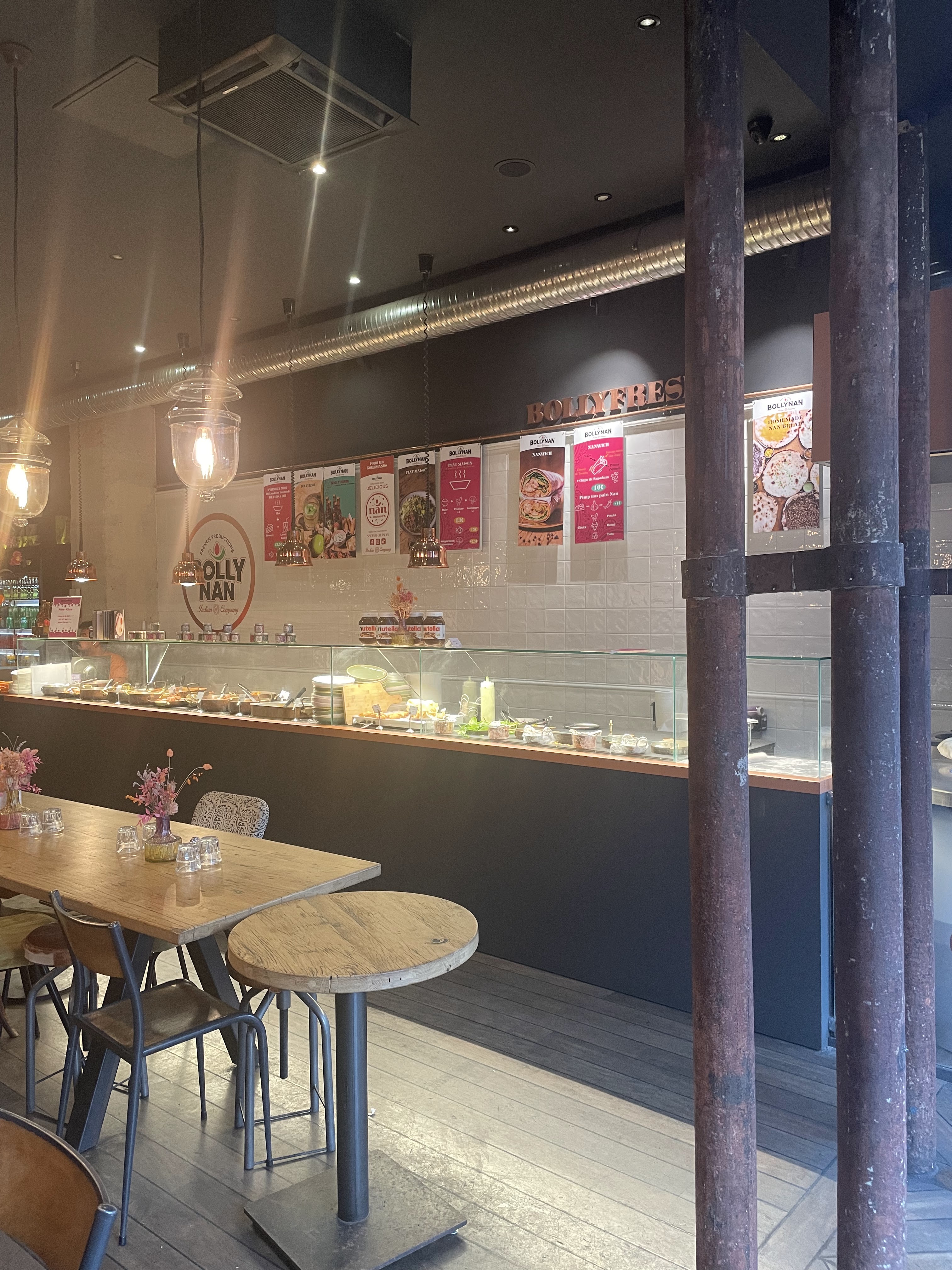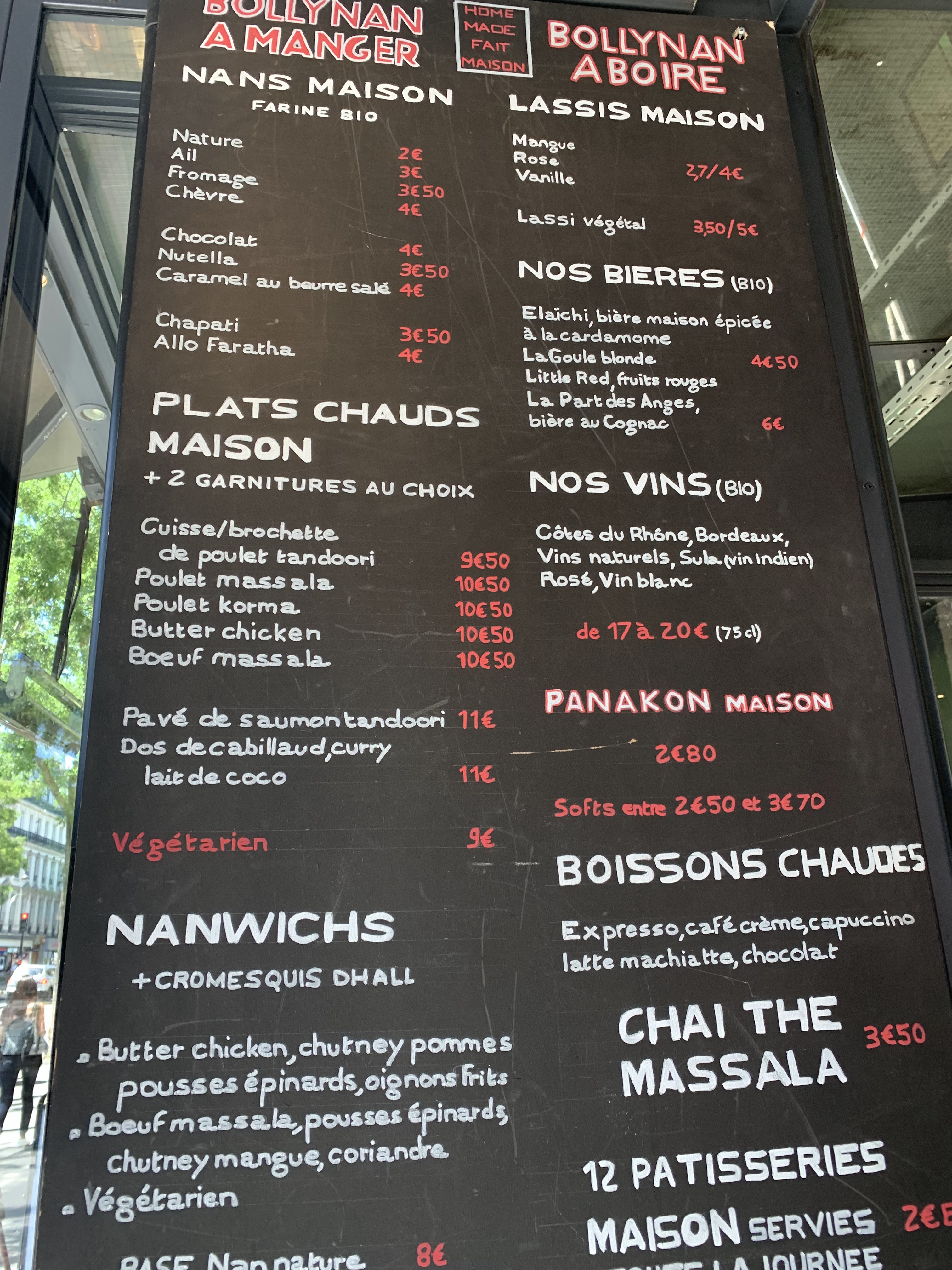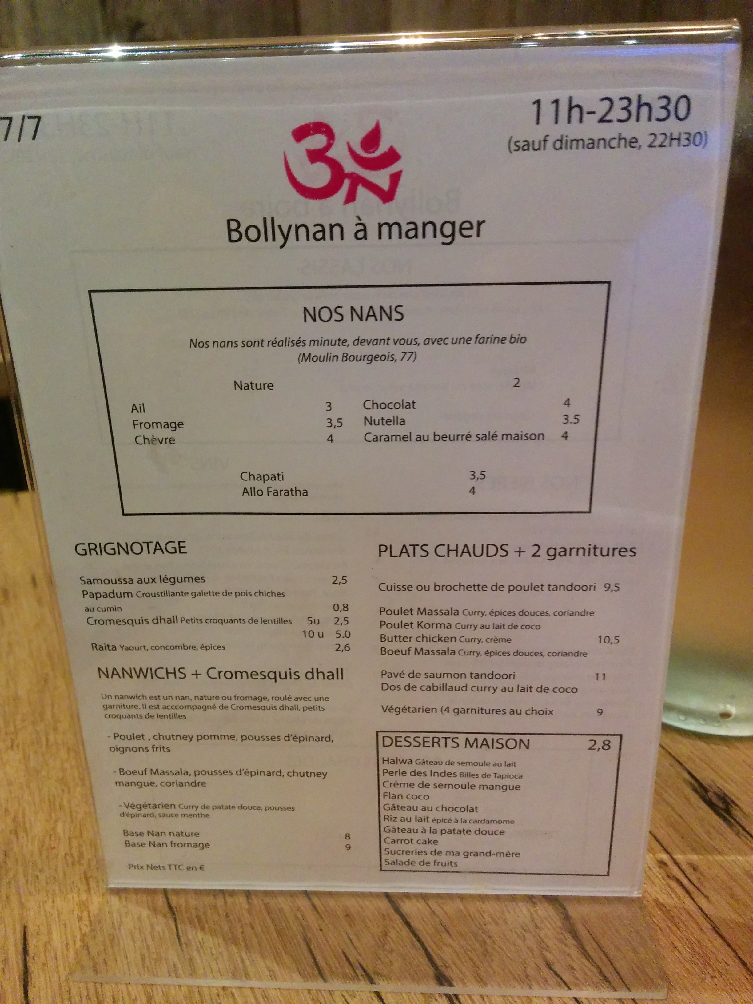 Ouvert toute l'aprem et prix raisonnable (assiette complète au choix riz + protéine + accompagnement = 13€), chauffé au micro-onde comme chez le traiteur. Le nan en revanche est fait minute, est plutôt bon et coûte 2,50€. Bollynan dépanne bien pour manger rapide, coloré et sain dans ce quartier à n'importe quelle heure.