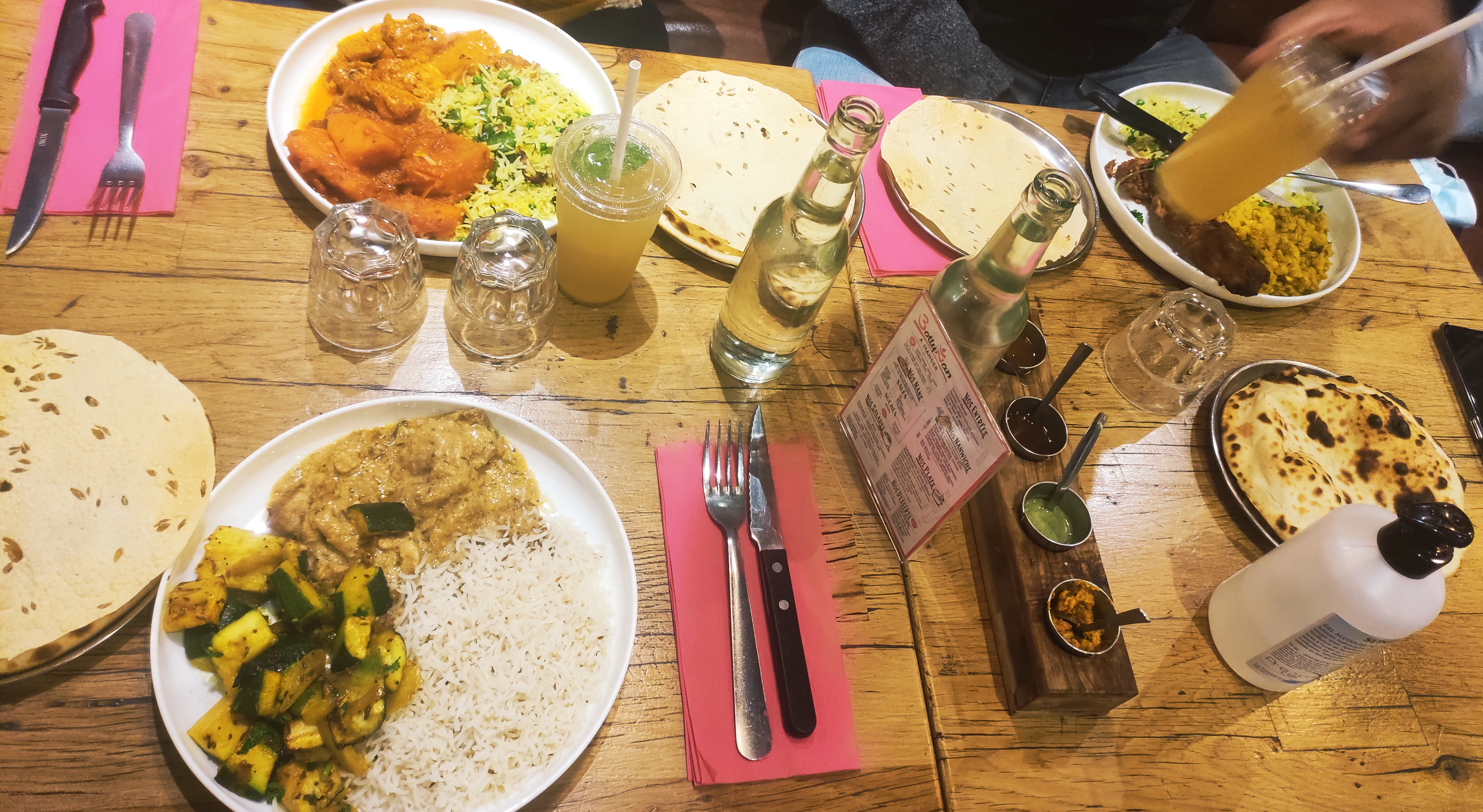 Personnel très accueillant et rapide. Les plats sont bons, le sandwich de naan est original et il y a des options végétariennes. Prix corrects mais quantités assez réduites par rapport à ce qu’on peut avoir l’habitude dans un restaurant indien. Ils proposent des bières indiennes. Nous n’avons pas goûté les desserts proposés.