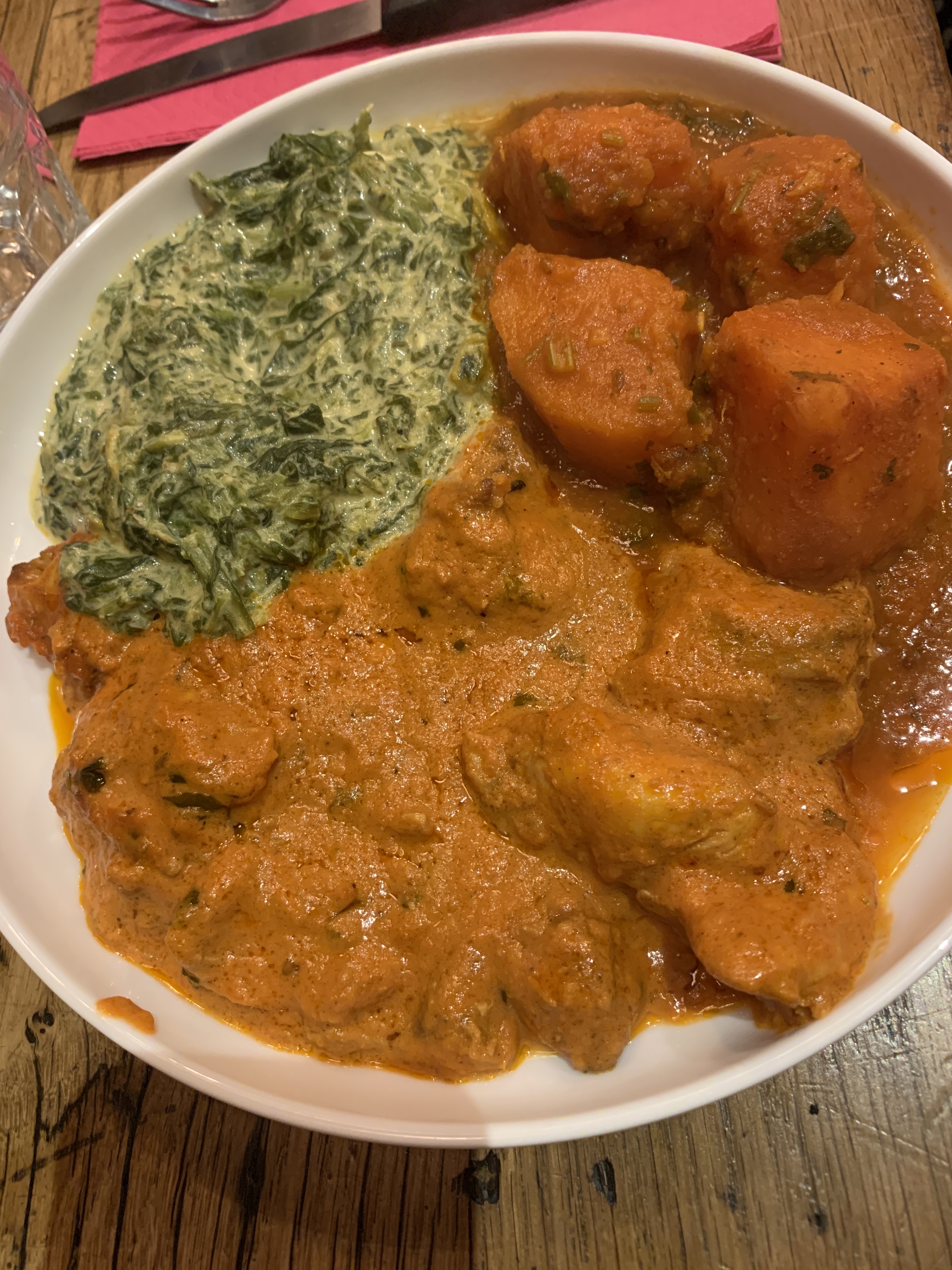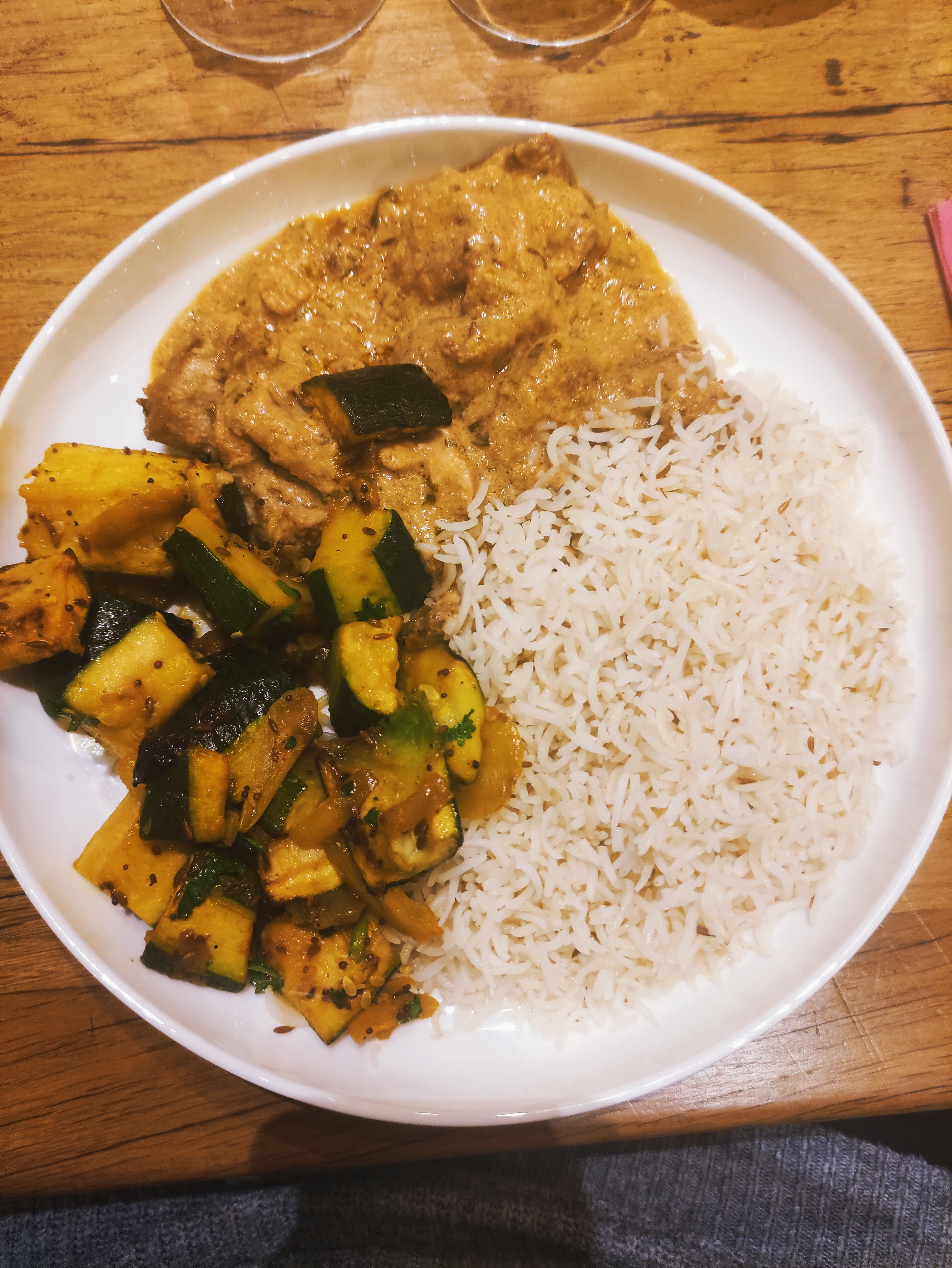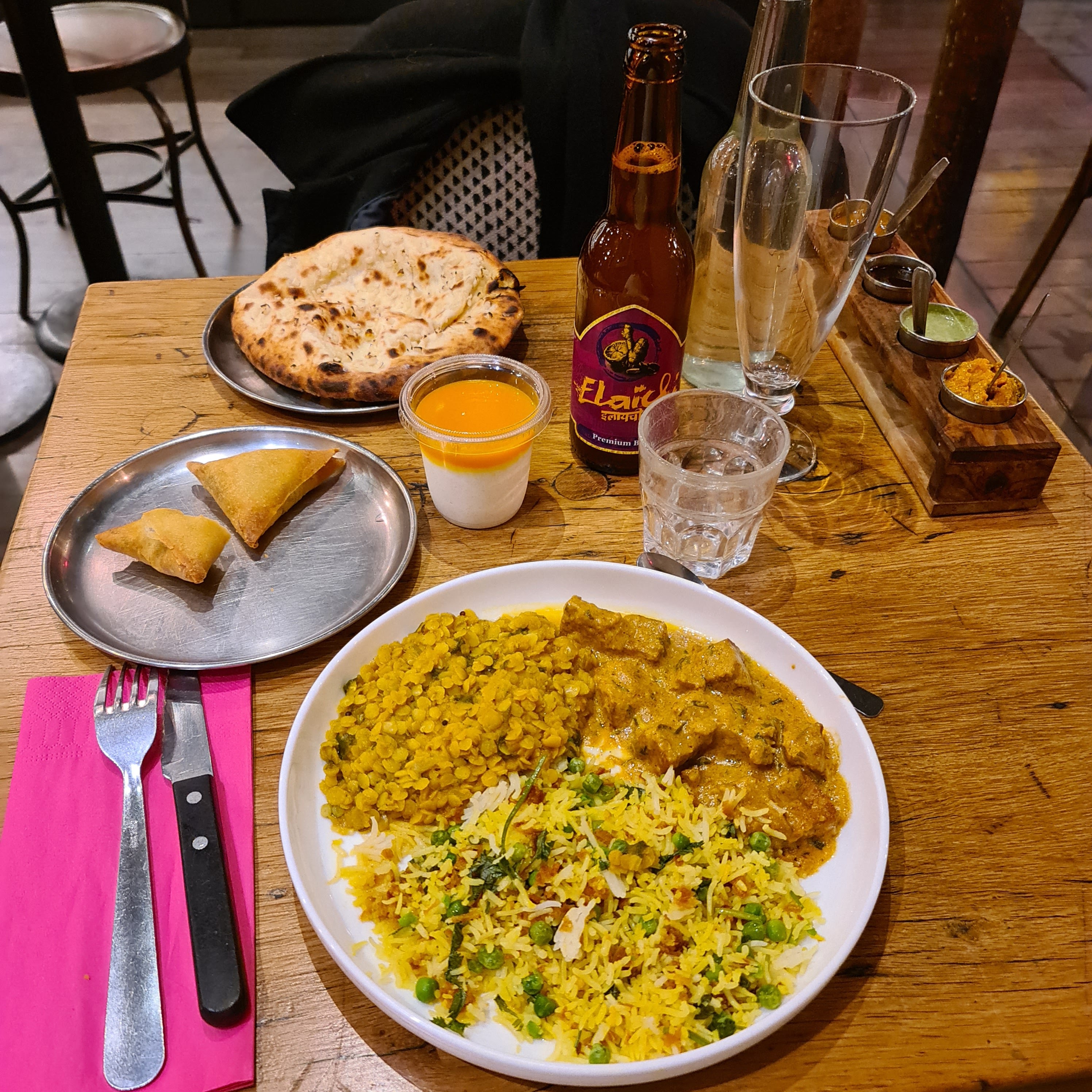 Très bon accueil, les mets sont délicieux. Le service est rapide, le cadre est super. Poulet korma, riz basmati et courgettes au curry, nan au fromage et papadum. Mmmm