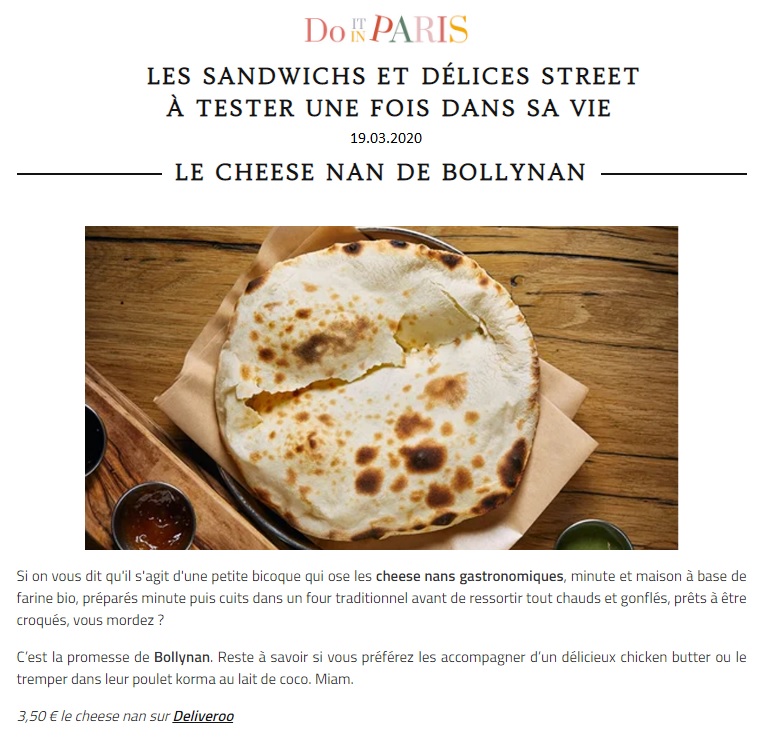Hello Nicolas Davoine, Nous vous remercions grandement d'avoir pris le temps de nous laisser cet avis 😊. Nous sommes très contents que vous ayez aimé notre spécialité cheese naan!🧀 À très vite pour une nouvelle commande ou visite dans notre restaurant à Paris 9 juste en face du Grand Rex pour tester de nouvelles saveurs comme pourquoi pas notre fameux butter chicken et notre nanwich (sandiwich🌯) Team Bollynan Grands Boulevards 🕉️
