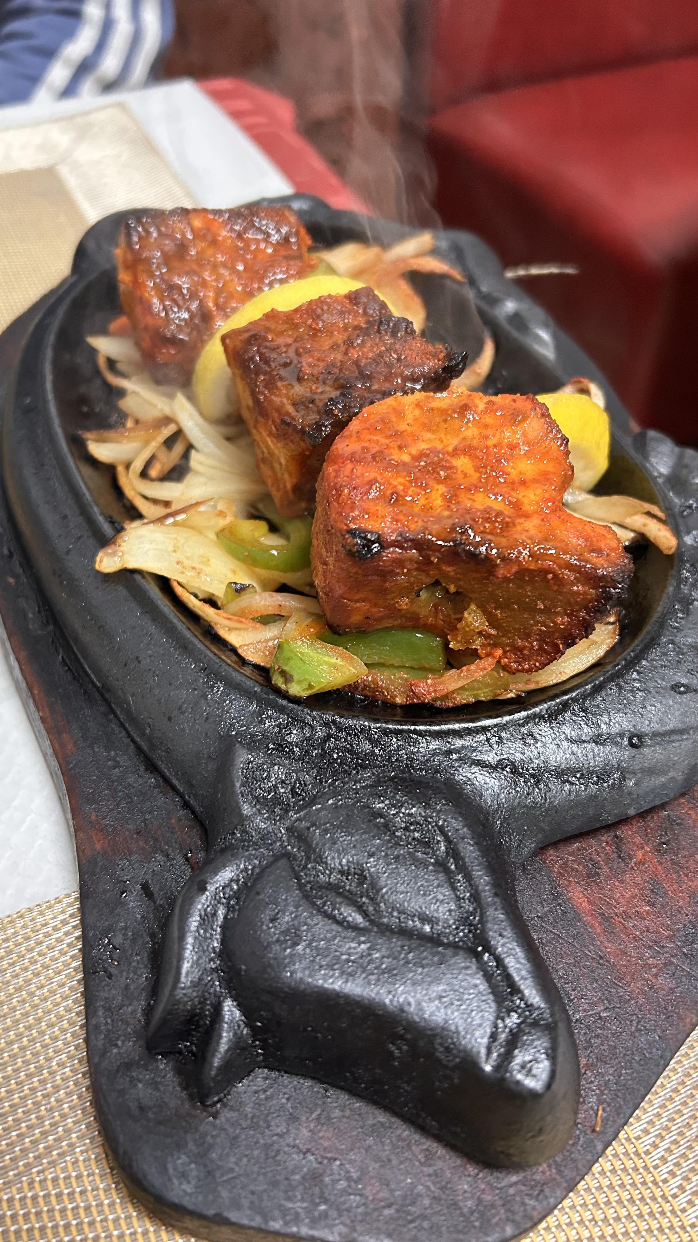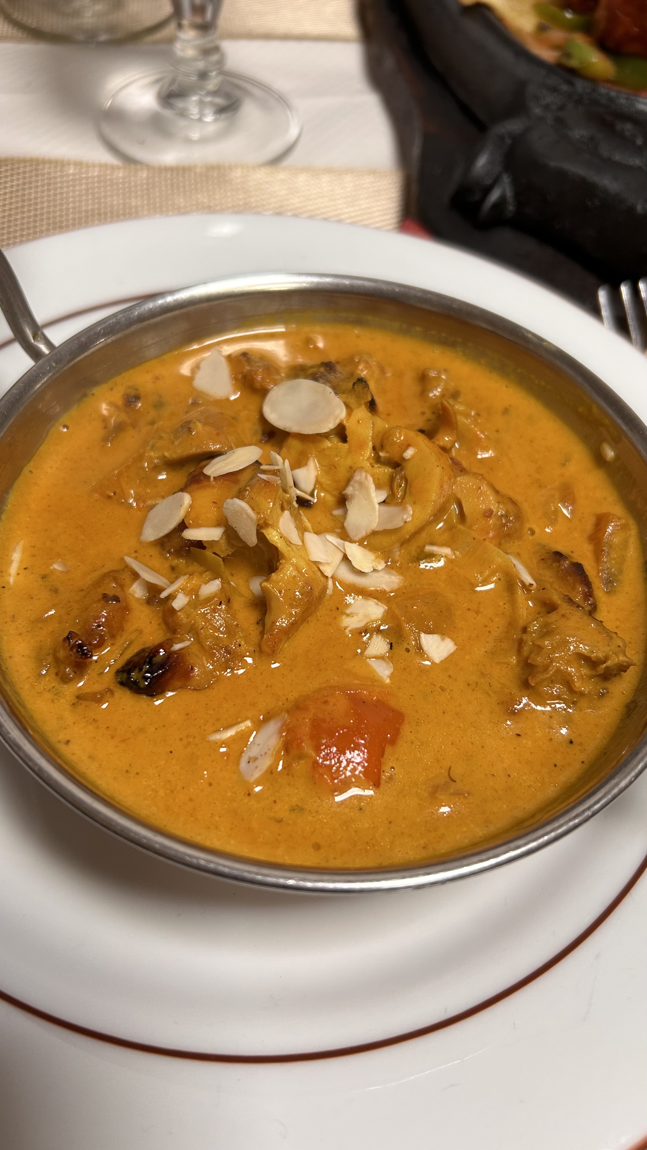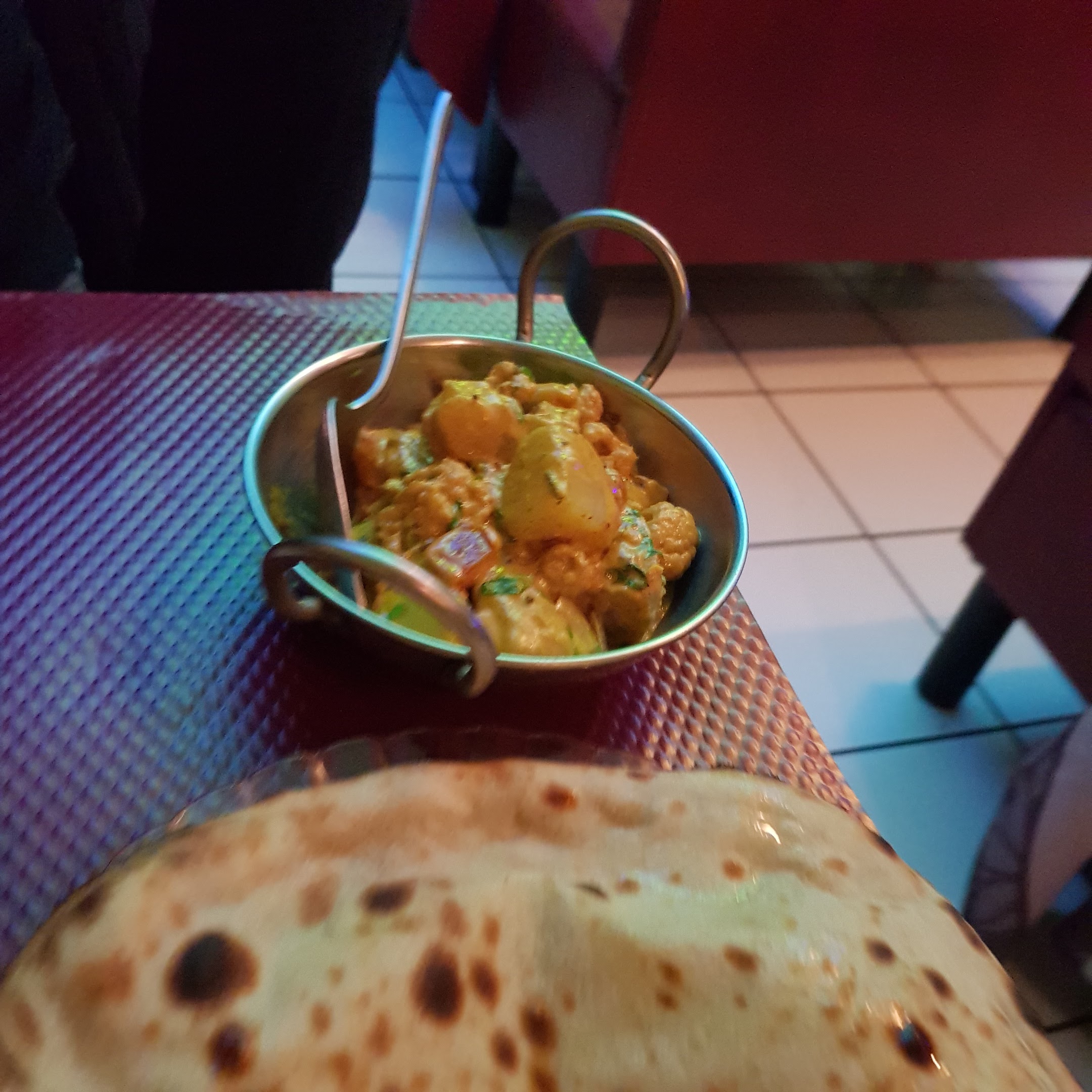 La cuisine était simplement excellente, le plat épicé a la demande avec une parfaite précision. Quantité généreuse et prix raisonnable. J'ai pris un poulet tika massala accompagné d'un Nan garlic. L'ambiance est particulière, certain aimerons d'autre pas mais je recommande vivement ce restaurant si vous aimez ou que vous voulez goûter indien.