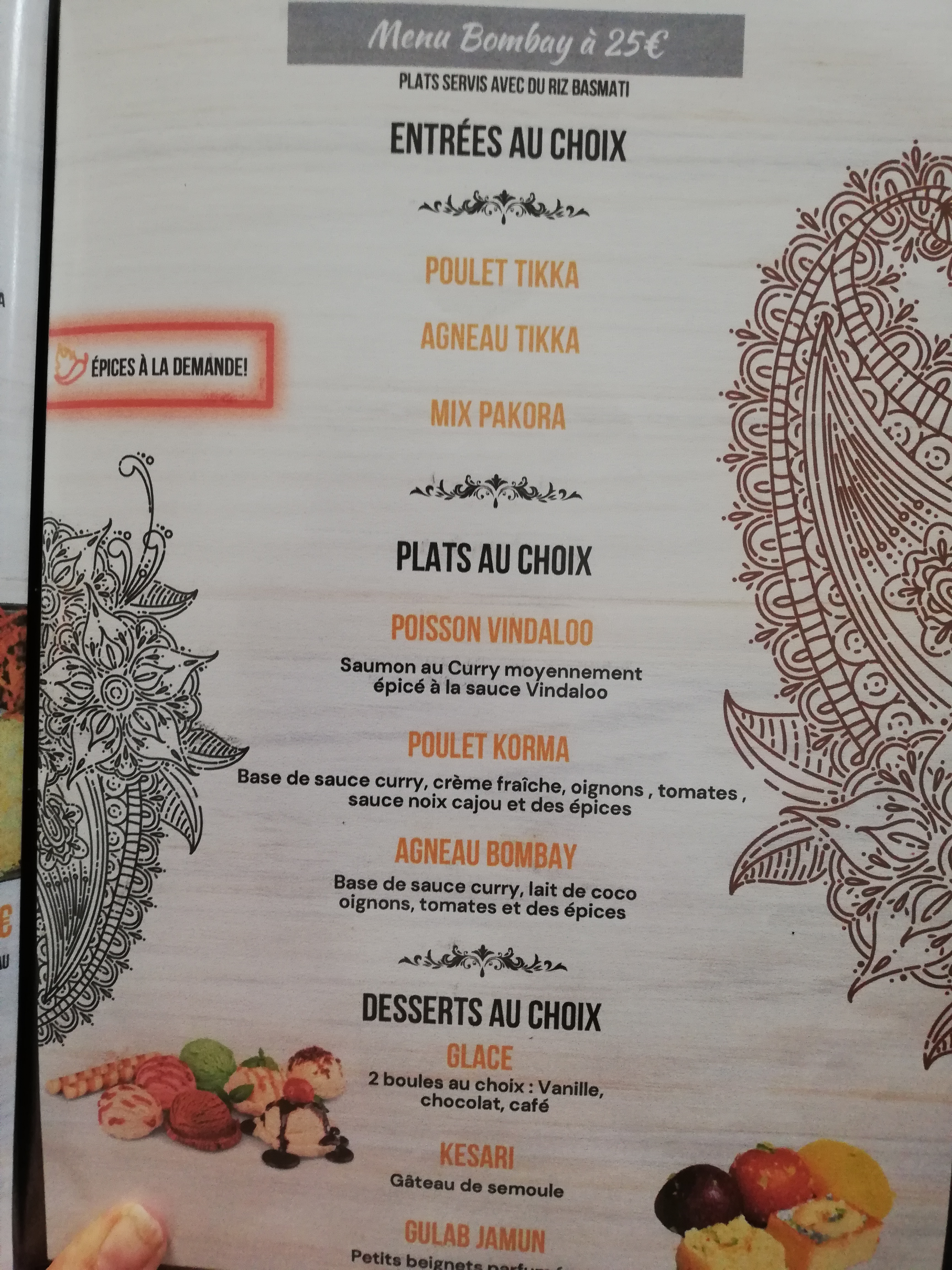 Restaurant indien les personnes sont souriante et à l'écoute bonne ambiance, musique lumière tamisé! Salle pas très grande pensé à réservé! Les plats sont très bon que ce soit du niveau entré plat ou dessert les saveurs sont bien équilibré! Seul point négatif les dessert sont à mon avis un peu chère Mais aller y ils sont bon! Bonne appétit!