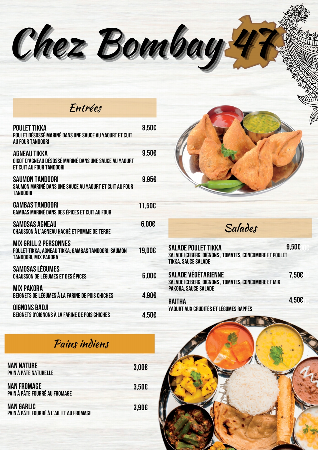 Chez Bombay 47 est un restaurant indien incroyablement délicieux et authentique. J'ai eu la chance de dîner là-bas récemment et j'ai été complètement enchanté par l'expérience culinaire. Dès que vous entrez, l'ambiance chaleureuse et accueillante vous transporte directement en Inde. Le menu propose une large sélection de plats traditionnels indiens, préparés avec des ingrédients frais et de qualité. Chaque bouchée était un véritable festin de saveurs. J'ai particulièrement apprécié leur poulet tikka masala, qui était parfaitement équilibré en termes d'épices et de tendreté de la viande. Le service était exceptionnel, avec un personnel attentionné et amical. Ils étaient prêts à répondre à toutes mes questions sur les plats et à recommander des options en fonction de mes préférences. De plus, le temps d'attente était raisonnable, ce qui est toujours appréciable lorsqu'on a faim ! L'ambiance du restaurant est également très agréable. La décoration rappelle l'Inde avec des touches modernes, et la musique traditionnelle en arrière-plan ajoute une atmosphère festive. Que ce soit pour un dîner en famille, un repas romantique ou une soirée entre amis, Chez Bombay 47 est l'endroit idéal pour savourer de délicieuses spécialités indiennes. En conclusion, je recommande vivement Chez Bombay 47 à tous les amateurs de cuisine indienne ou à ceux qui souhaitent découvrir de nouvelles saveurs exotiques. Vous ne serez pas déçu par la qualité de la nourriture, le service attentionné et l'ambiance charmante de ce restaurant.