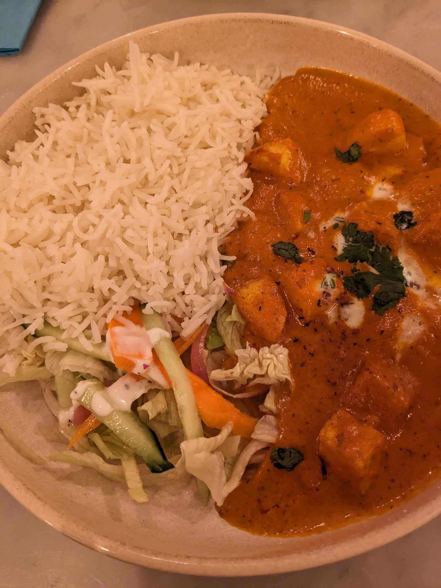 Je recommande vraiment cet endroit car il est incroyable ! J'ai eu le paneer masala avec du riz et un naan à l'ail et au fromage. Tout ce que j'ai commandé était délicieux, les portions étaient excellentes et les prix sont abordables. L'endroit a aussi l'air vraiment sympa, il y avait de la bonne musique et le personnel était super gentil et sympathique ! J’aime aussi le fait qu’il existe de nombreuses options végétariennes et végétaliennes différentes ! J'y retournerai certainement pour essayer plus de choses !
