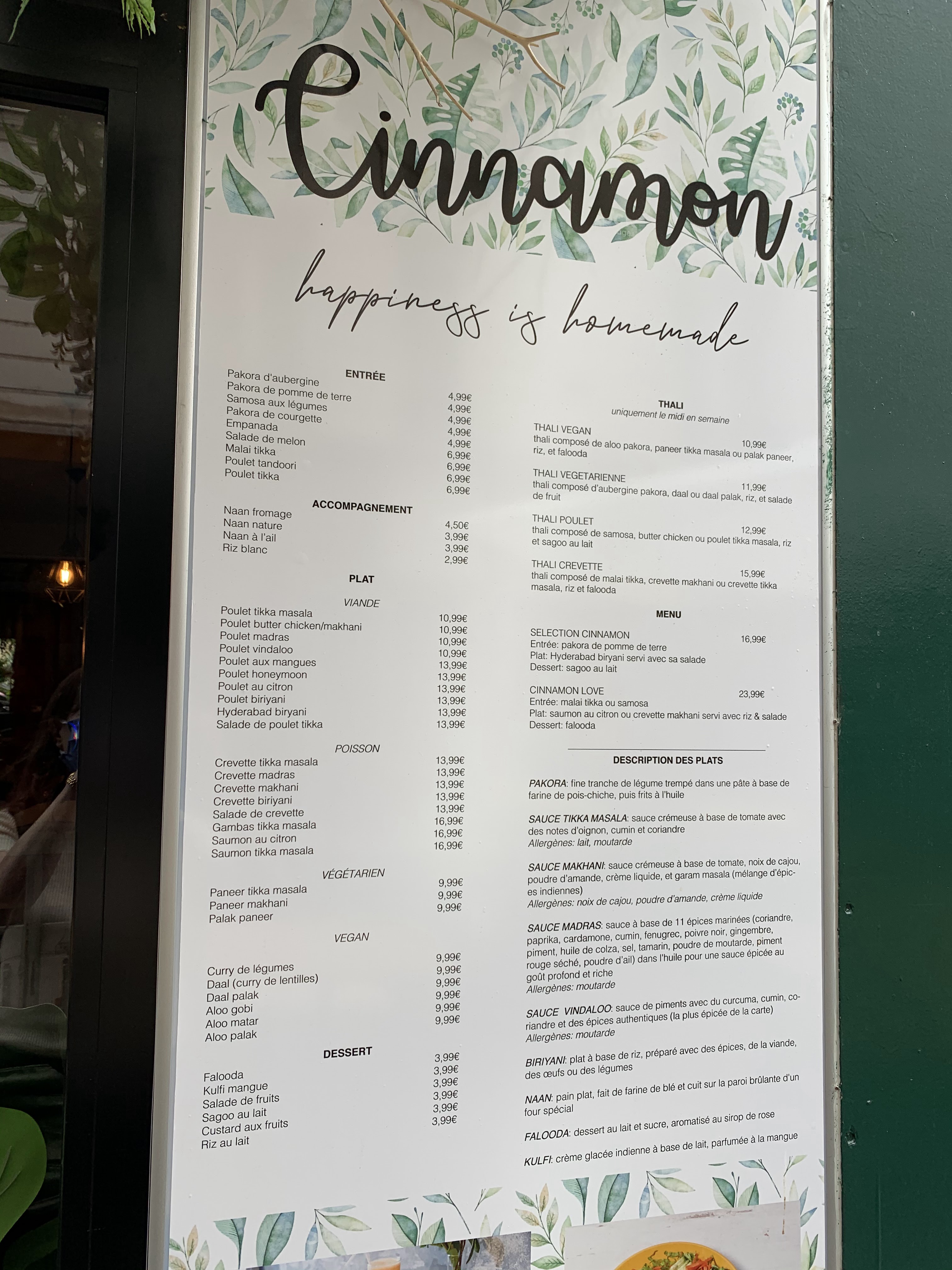 Cuisine délicieuse dans un restaurant charmant, élégant et paisible. Super hôte. Quel joyau au milieu de la ville ! Si vous vous dirigez vers le Louvre ou si vous venez de terminer et que vous souhaitez un bon repas, passez au Cinnamon. J'ai eu les Poulets Korma et c'était divin. Mon seul regret est de ne pas habiter à Paris donc de pouvoir venir souvent. 10 sur 10!