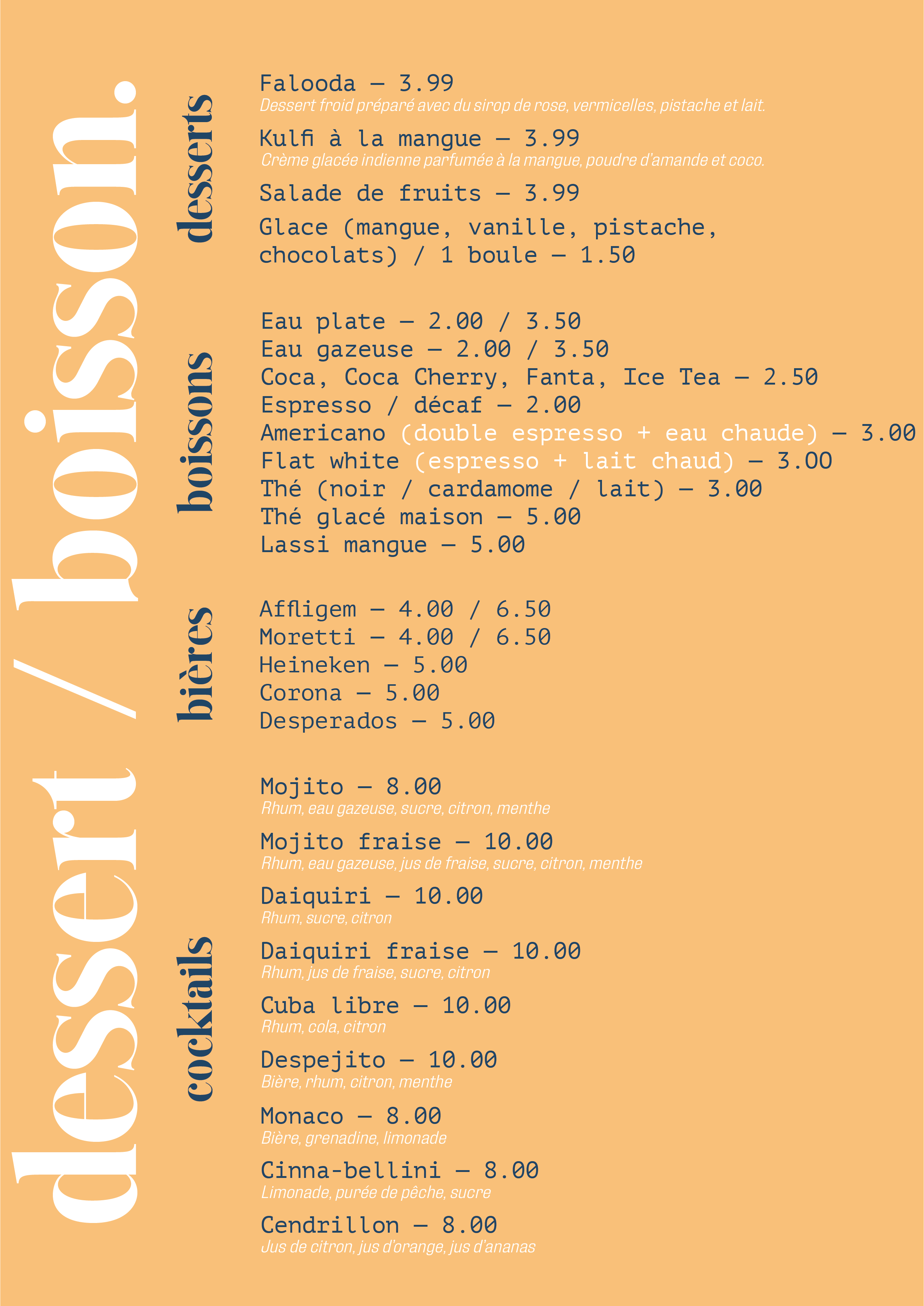 Nous sommes venus pour un Anniversaire et il n'était pas possible de commander les cocktails proposés sur la carte car ça prend trop de temps à faire et il y a beaucoup de monde. Bon on va prendre une bouteille de vin blanc, un Sancerre. Pas possible non plus il n'y en a plus. Un autre vin blanc ? Ah nan il n'y a plus une seule bouteille de blanc ! Alors un vin rouge ? Il faut aller à l'étage pour choisir une des bouteilles disposé sur le comptoir. Une carafe d'eau donc. Et pour manger ? Les plats sont arrivés au compte-gouttes, froids pour la plupart, sec aussi et avec très peu de sauce. J'ai commandé un poulet korma cuisiné sans amandes et sans noix de coco. Un des plats n'était pas celui commandé (une sorte de poulet curry au lieu d'un poulet korma). Nous n'avons même pas réclamé le plat demandé à l'origine, nous avions faim. Les naans, habituellement en accompagnement des plats, ont été servis dans un second temps. Et cerise sur le gâteau, une souris venue des cuisines nous a rendu visite.