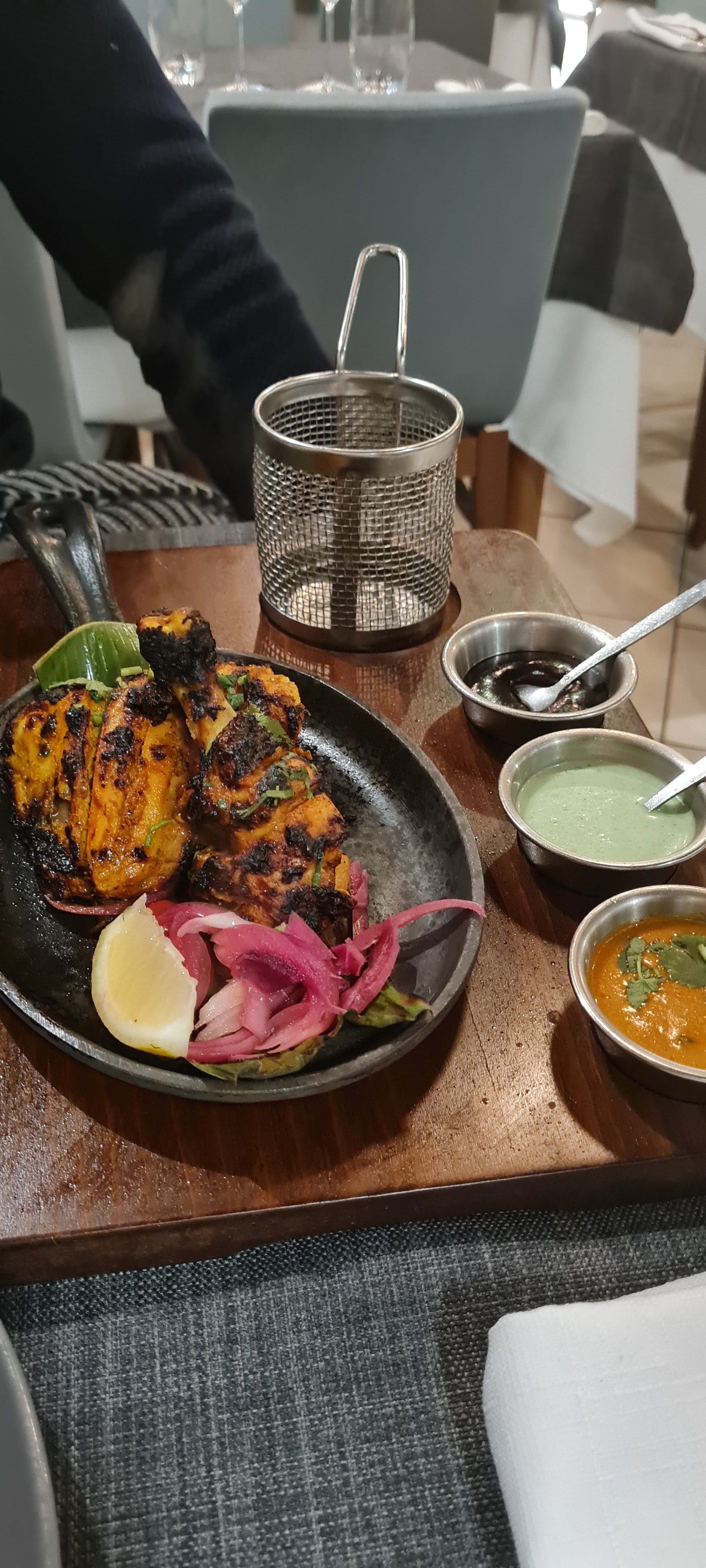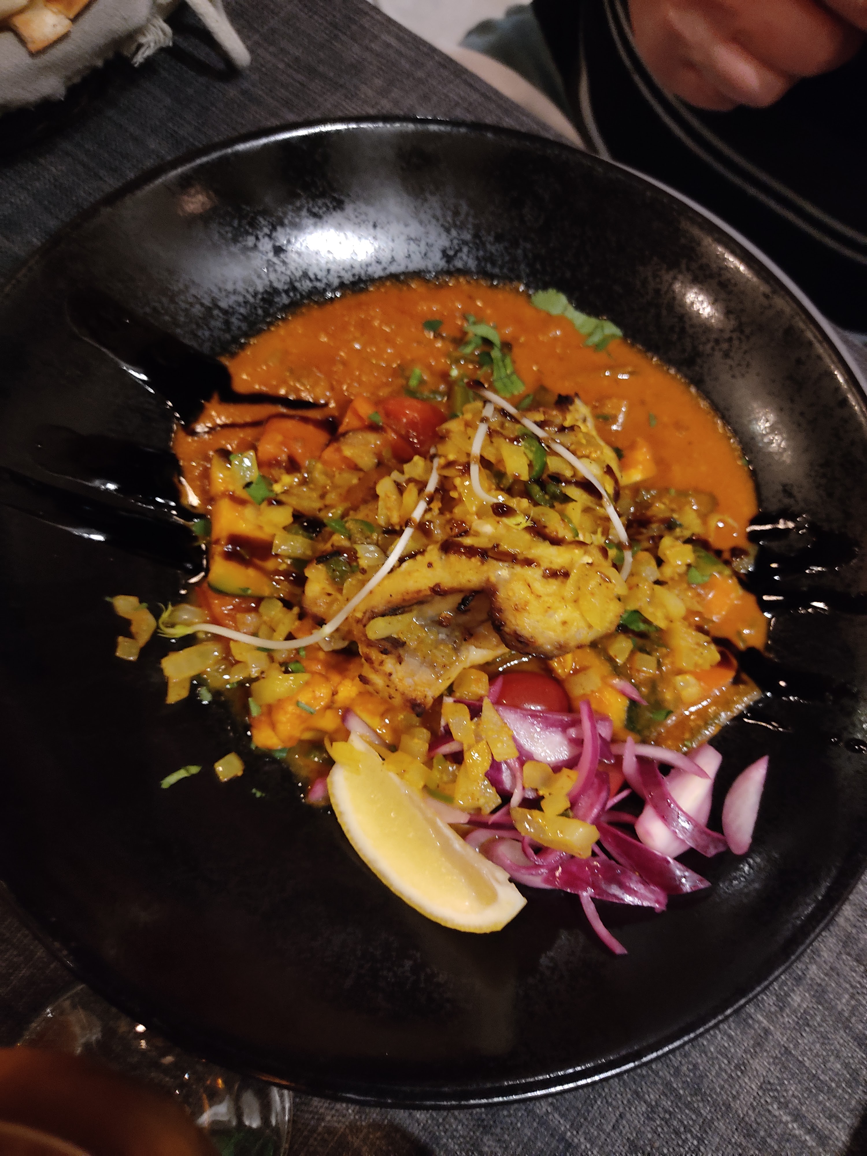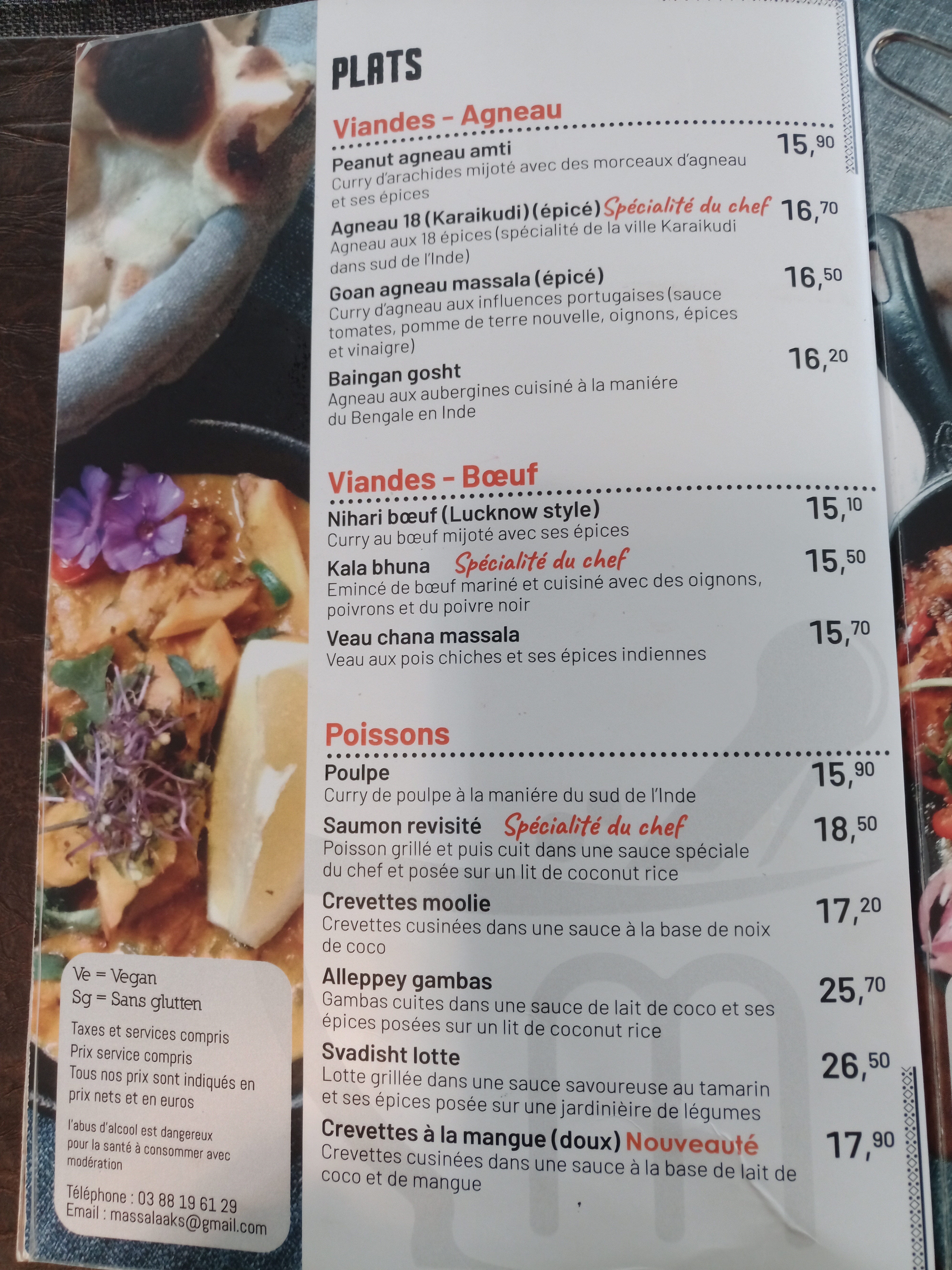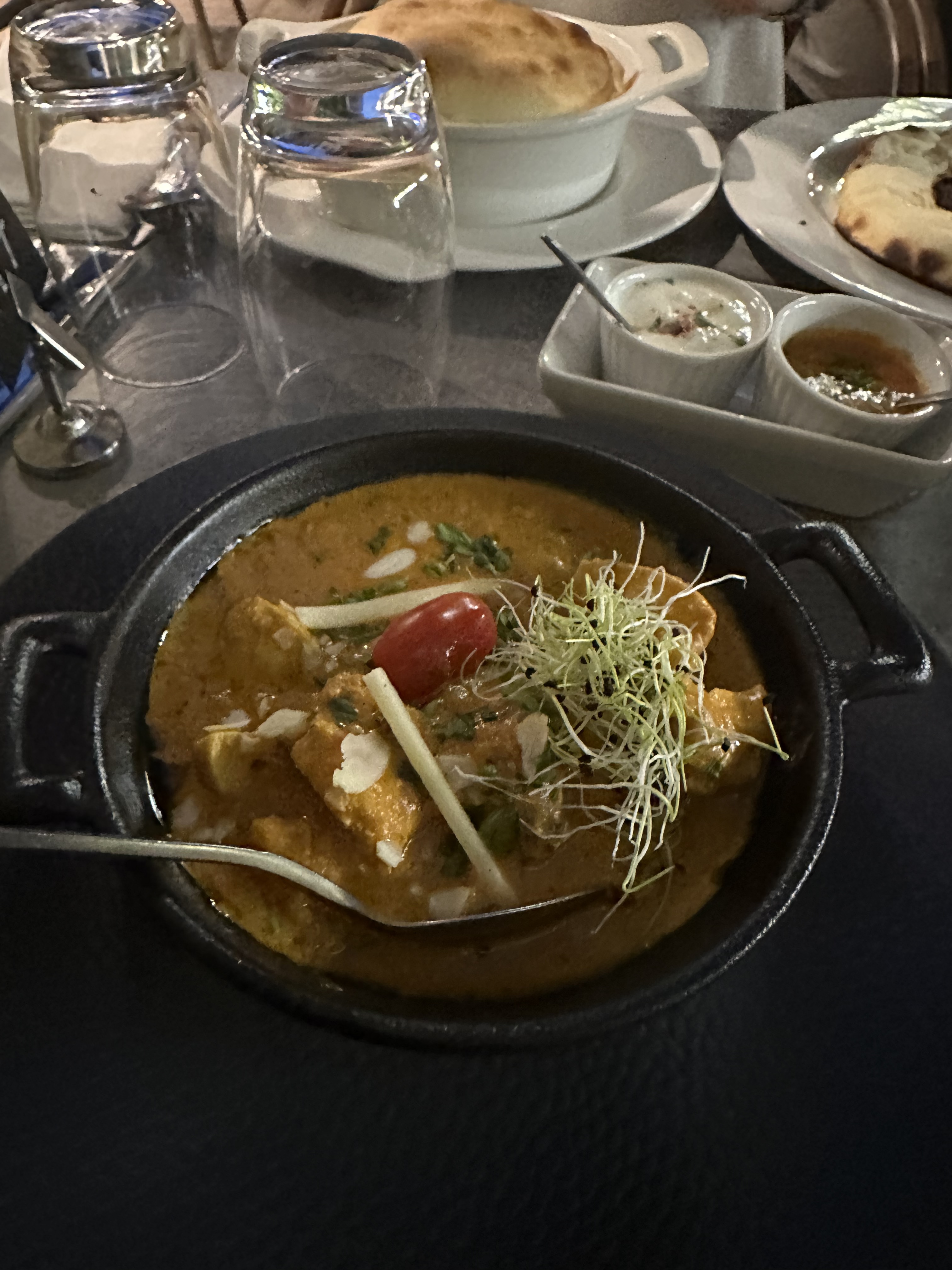 Le personnel est accueillant et sympathique, le cadre aussi. En terrasse, c'était super agréable. J'ai beaucoup appréciée le fait qu'il y ait plusieurs cocktails sans alcool, en général, on a que du virgin Mojito. Le plat de lotte et légumes était super bon, très bien assaisonné. Par contre le goan agneau, je n'ai pas vraiment apprécié et pour le reste ( poulet grillé , nan ail et nan fromage 🧀) c'était correct.