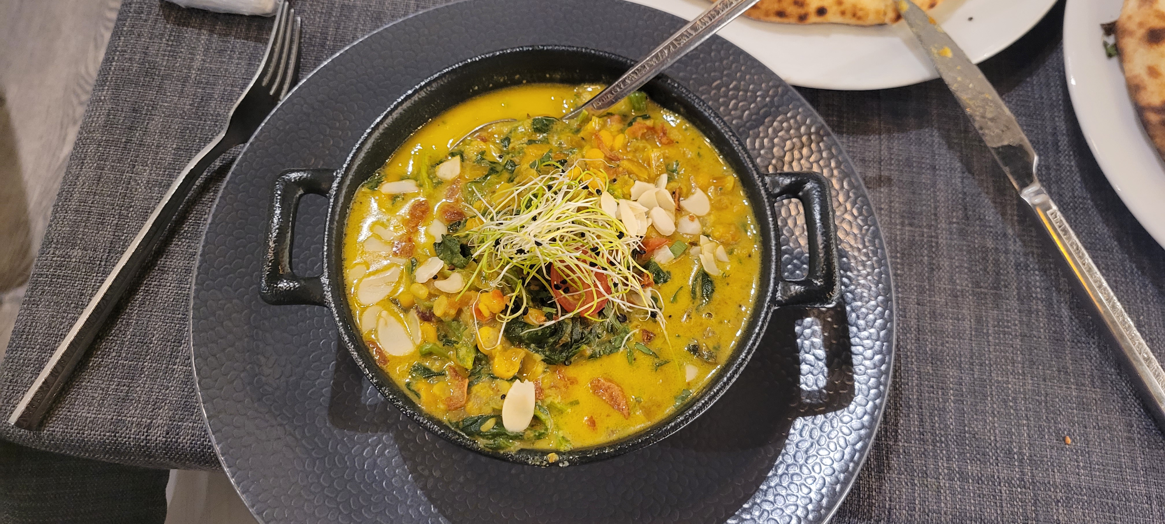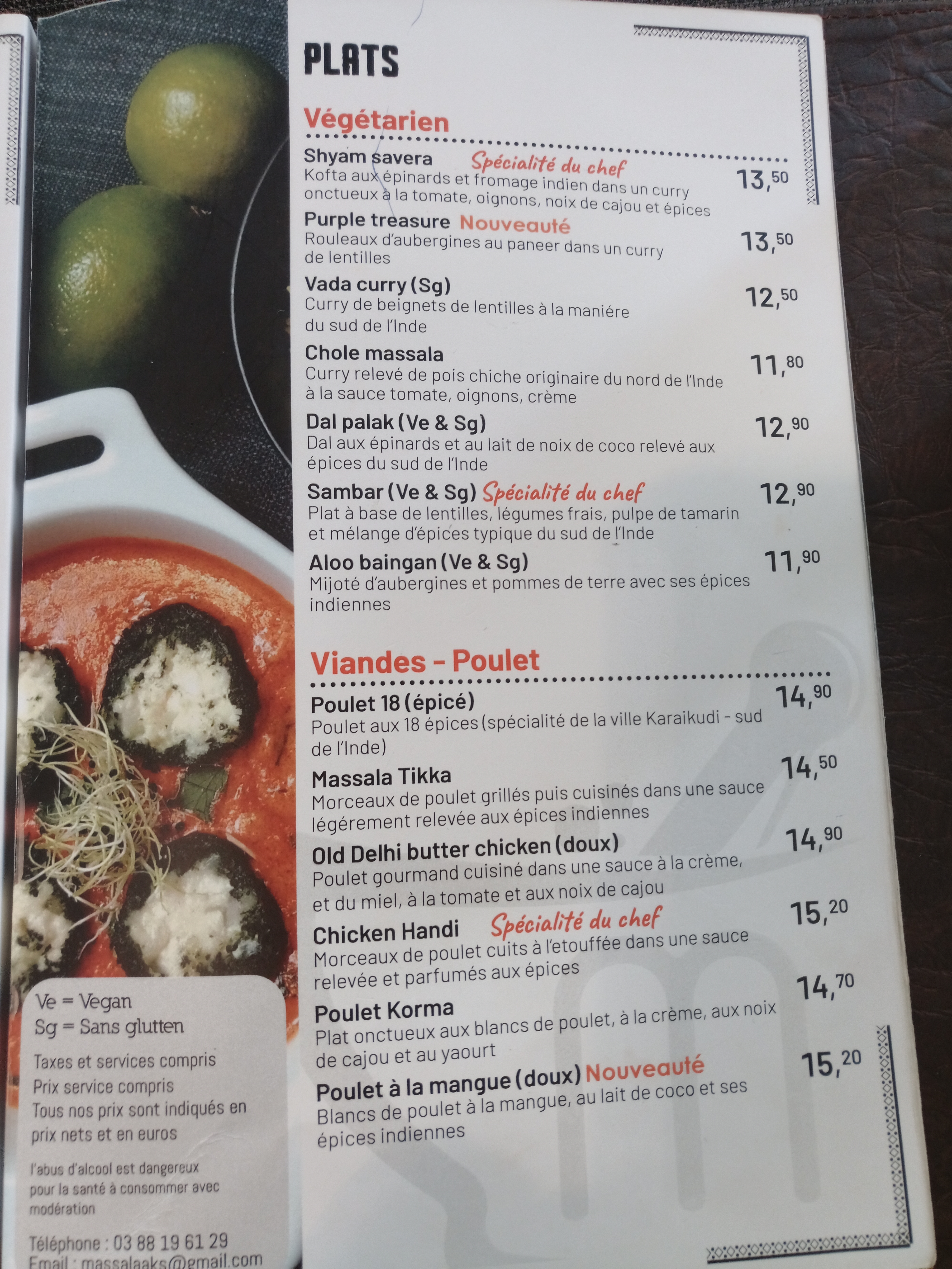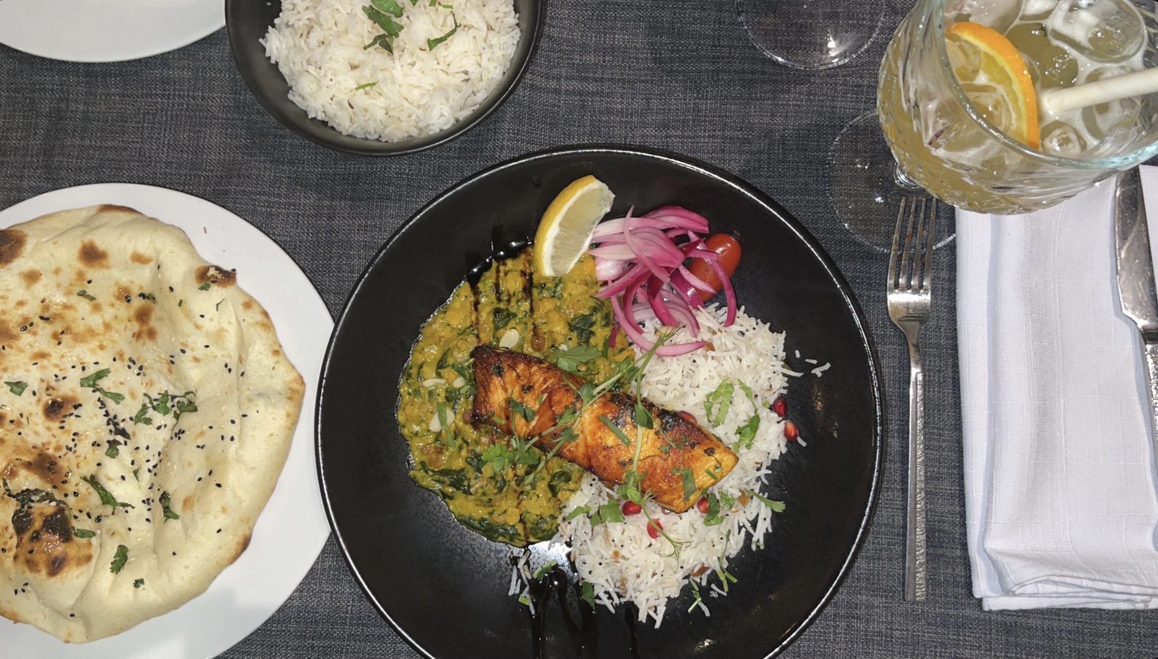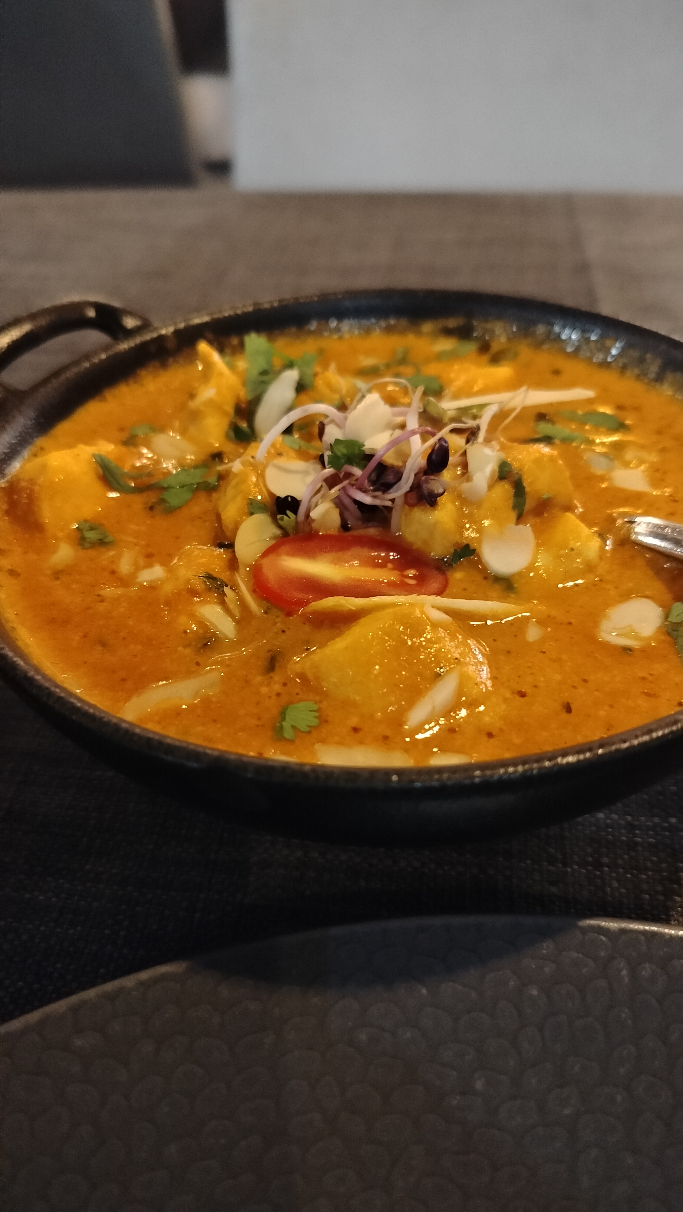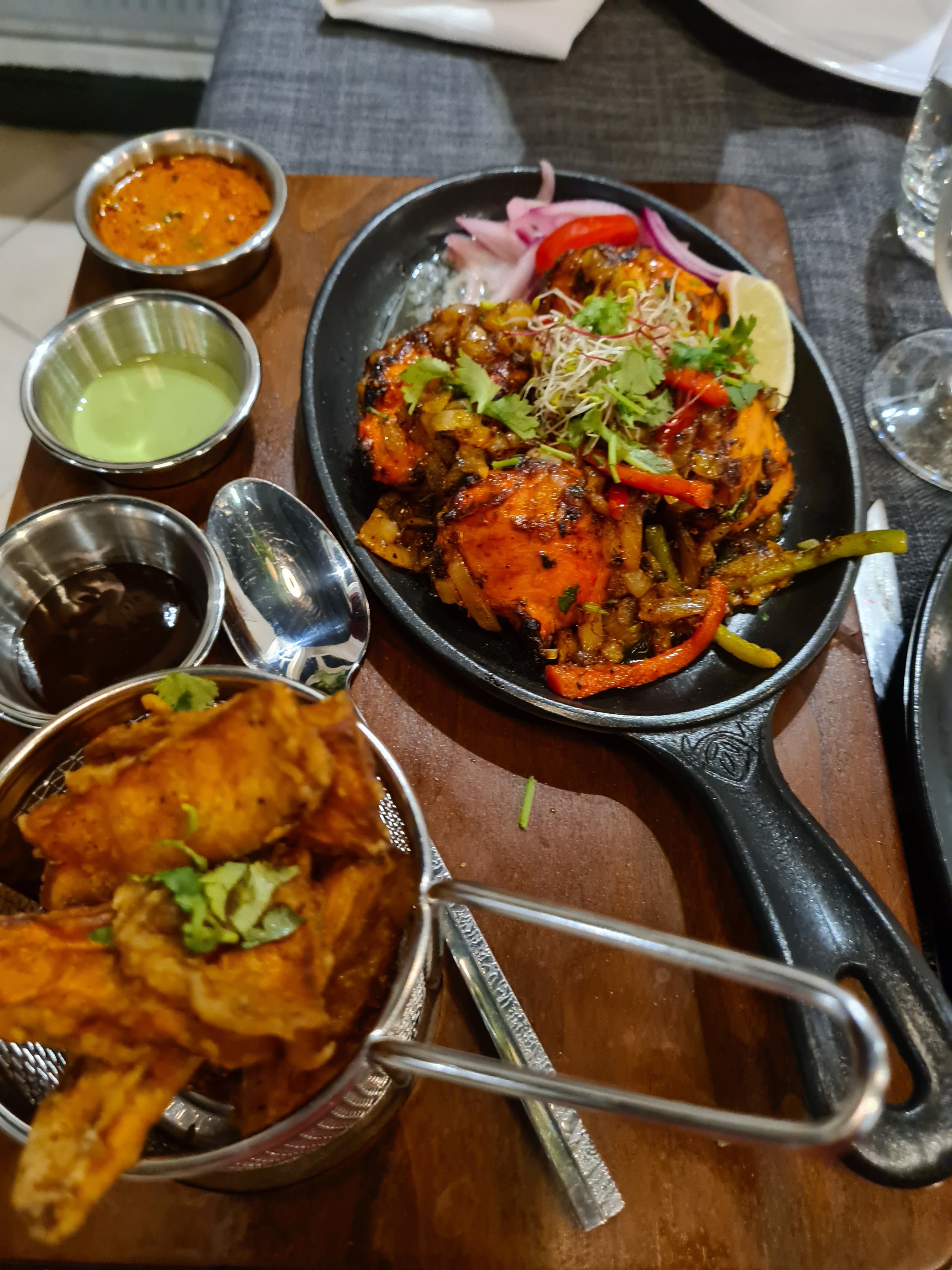 Le personnel est accueillant et sympathique, le cadre aussi. En terrasse, c'était super agréable. J'ai beaucoup appréciée le fait qu'il y ait plusieurs cocktails sans alcool, en général, on a que du virgin Mojito. Le plat de lotte et légumes était super bon, très bien assaisonné. Par contre le goan agneau, je n'ai pas vraiment apprécié et pour le reste ( poulet grillé , nan ail et nan fromage 🧀) c'était correct.