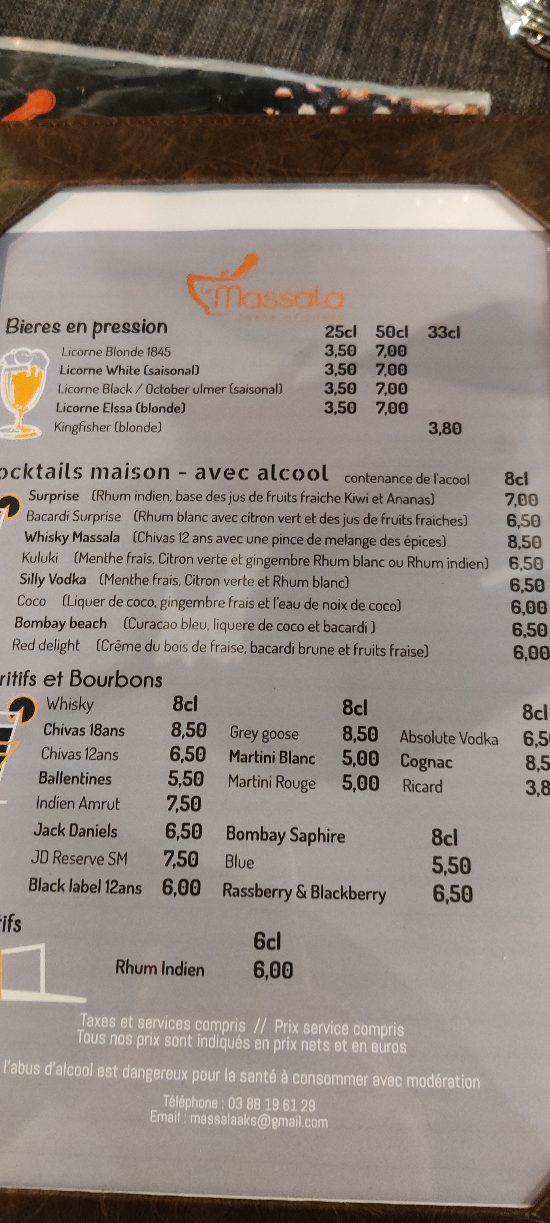 Bonjour je vous remercie pour votre avis et vos commentaires. Nous avons bien pris en compte vos suggestions. Effectivement le prix du sirop à l’eau était mal saisi dans la caisse et nous sommes désolés pour les inconvénients. Concernant le service en salle, effectivement nous sommes débutants et nous allons nous améliorer. Nos vins sont choisis avec soin et les prix sont exacts. À partir de ce soir vous avez la possibilité de consulter notre carte de vins au restaurant. En vous remerciant bonne journée. Cordialement Le Massala