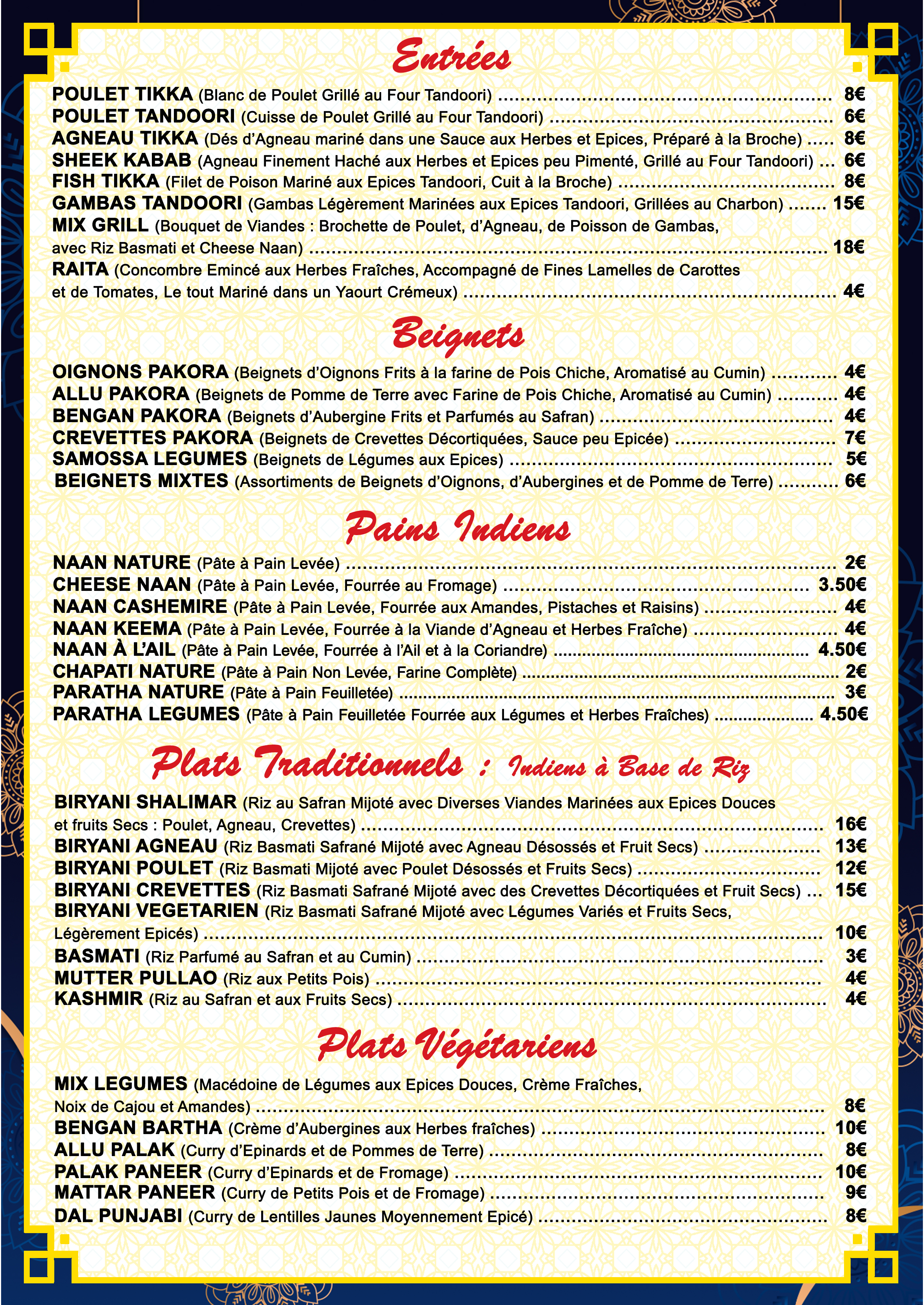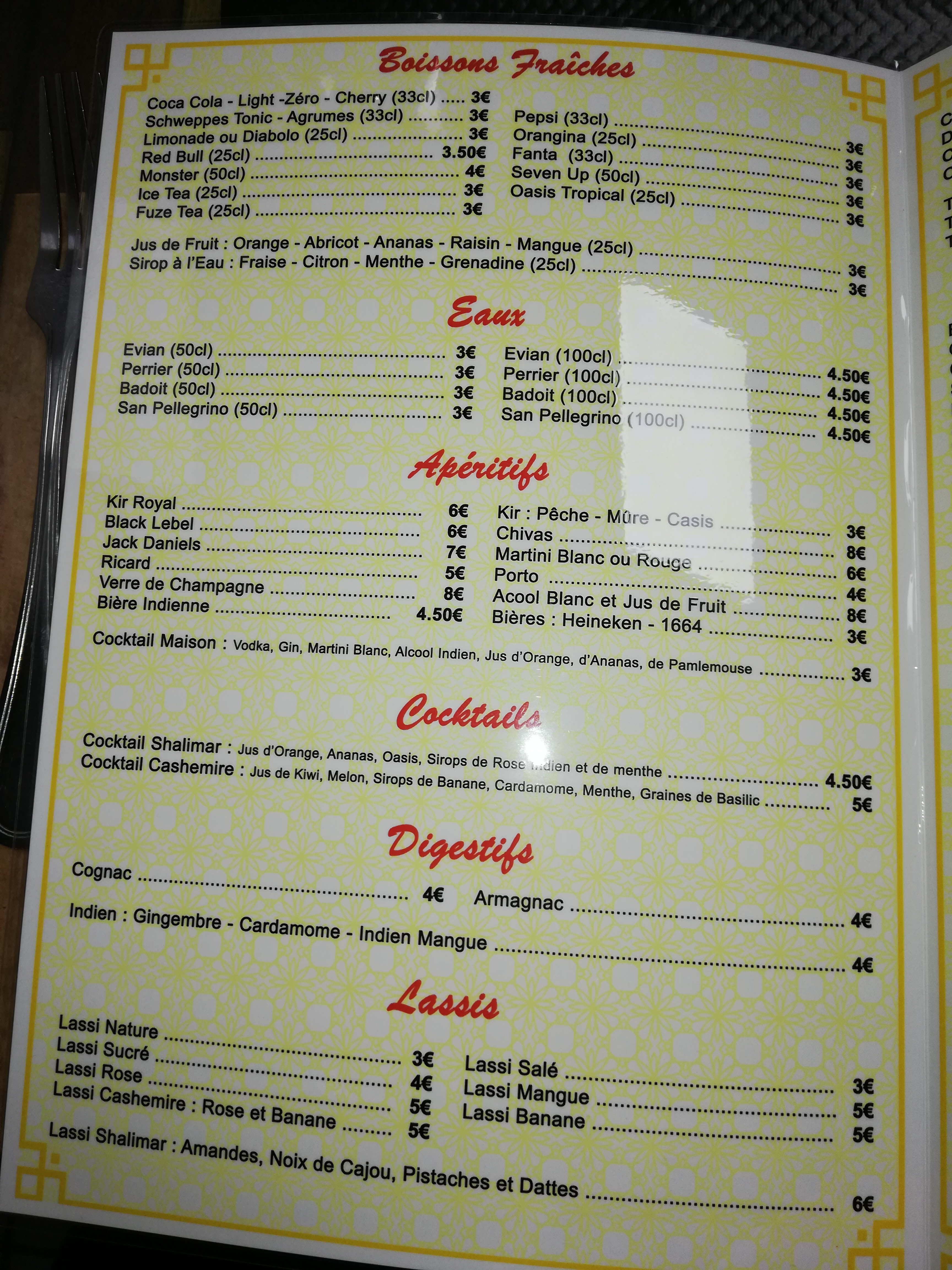 Carte variée entre Inde et Pakistan. Très bien mangé, ouvert un jour férié, serveur sympathique, tarifs raisonnables , le nom a changé par contre, le restaurant s'appelle Le Shalimar.