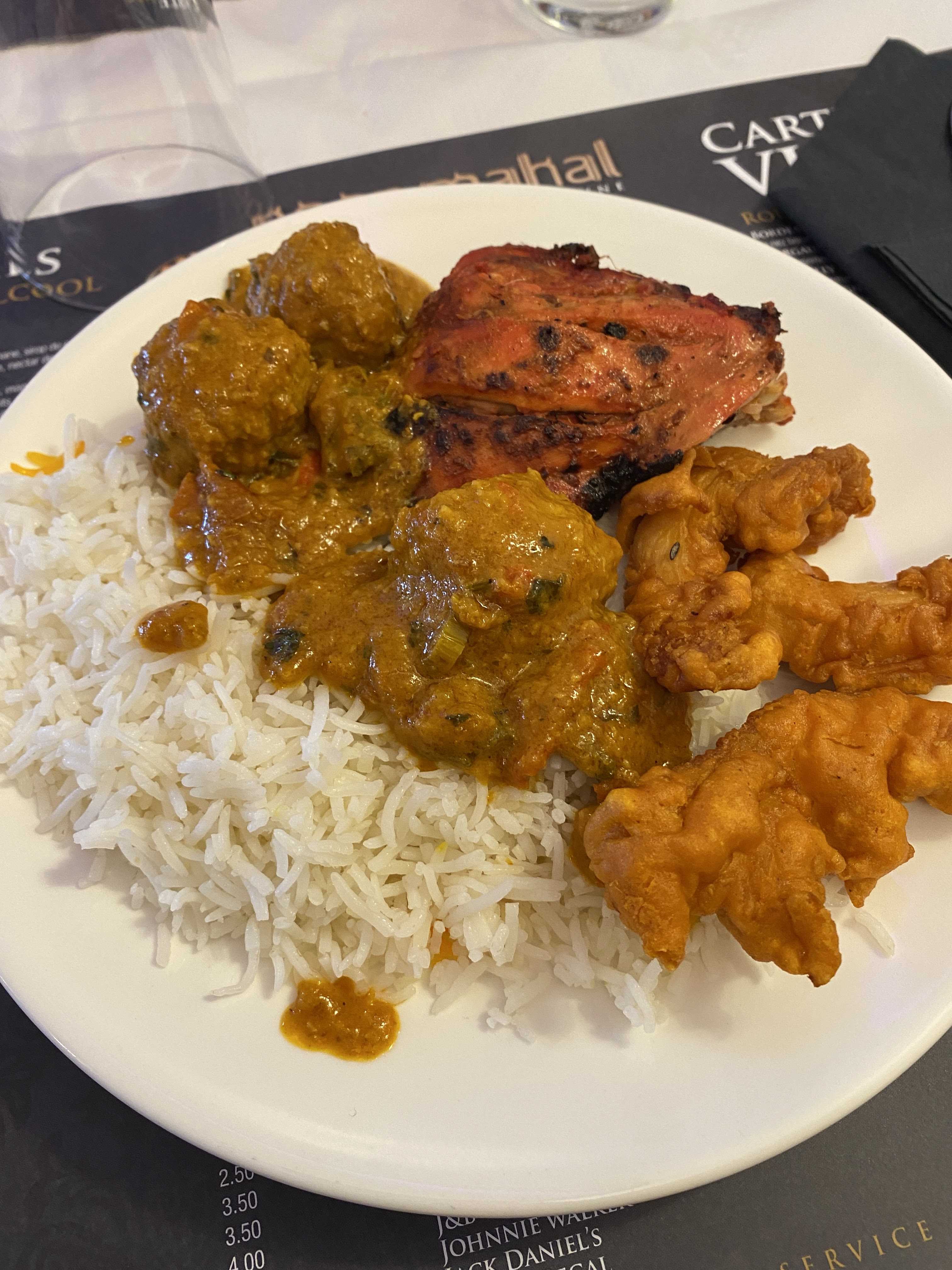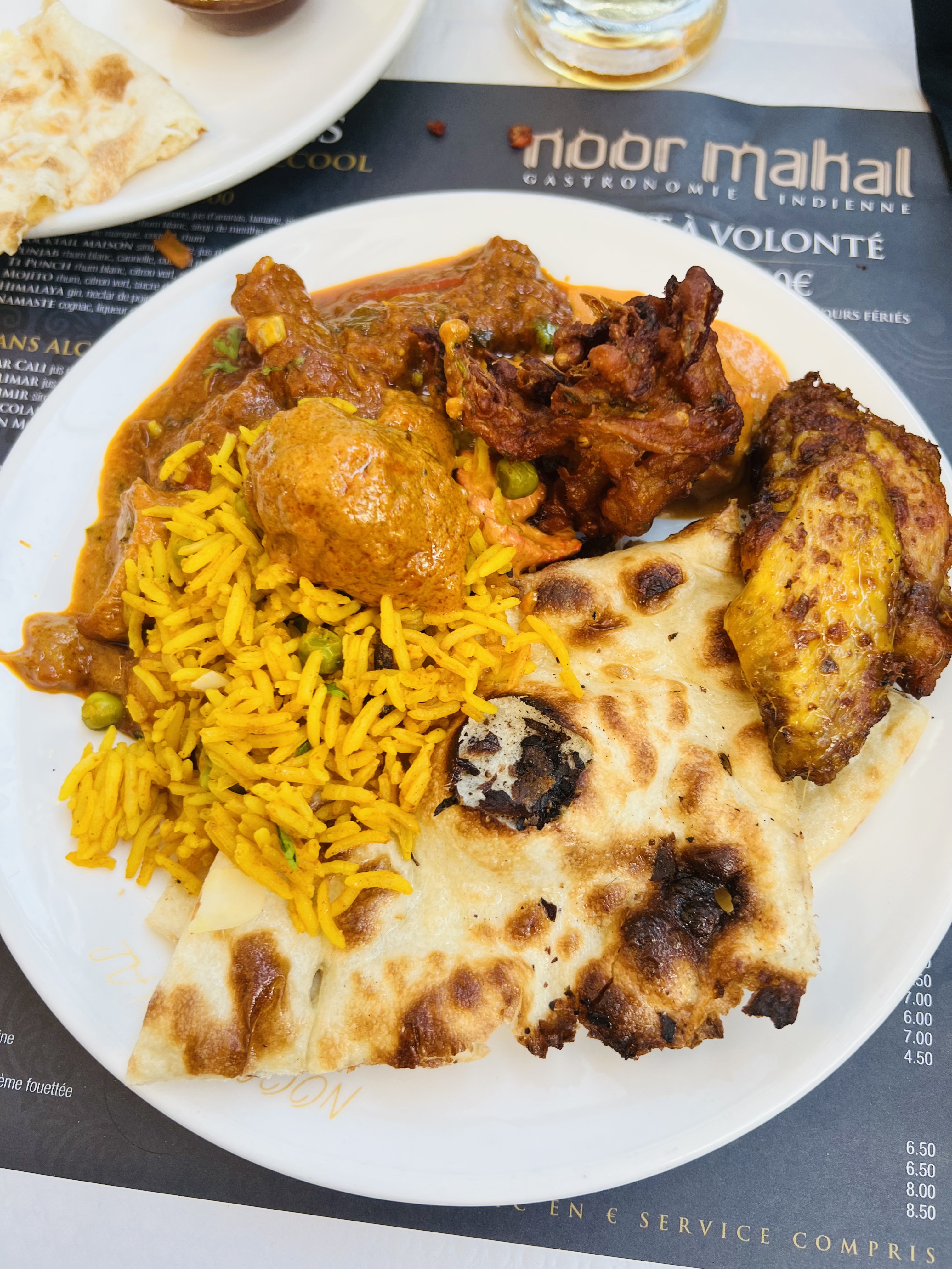 Chiken madras : 11€ , 6 morceaux de poulet dont 2 miniscules, le poulet est très sec vraiment Riz safran:3,90€, riz blanc sans une goute de safran et barquette très petite Cheese nan: 3,90€, très sec et les cotés sont. Dur Je susi très déçue, car je suis cliente de taj mahal à pontoise et je pensais que ce restaurant (noor mahal) sera aussi bon que l’autre mais pas du tout La 1ere et la dernière commande