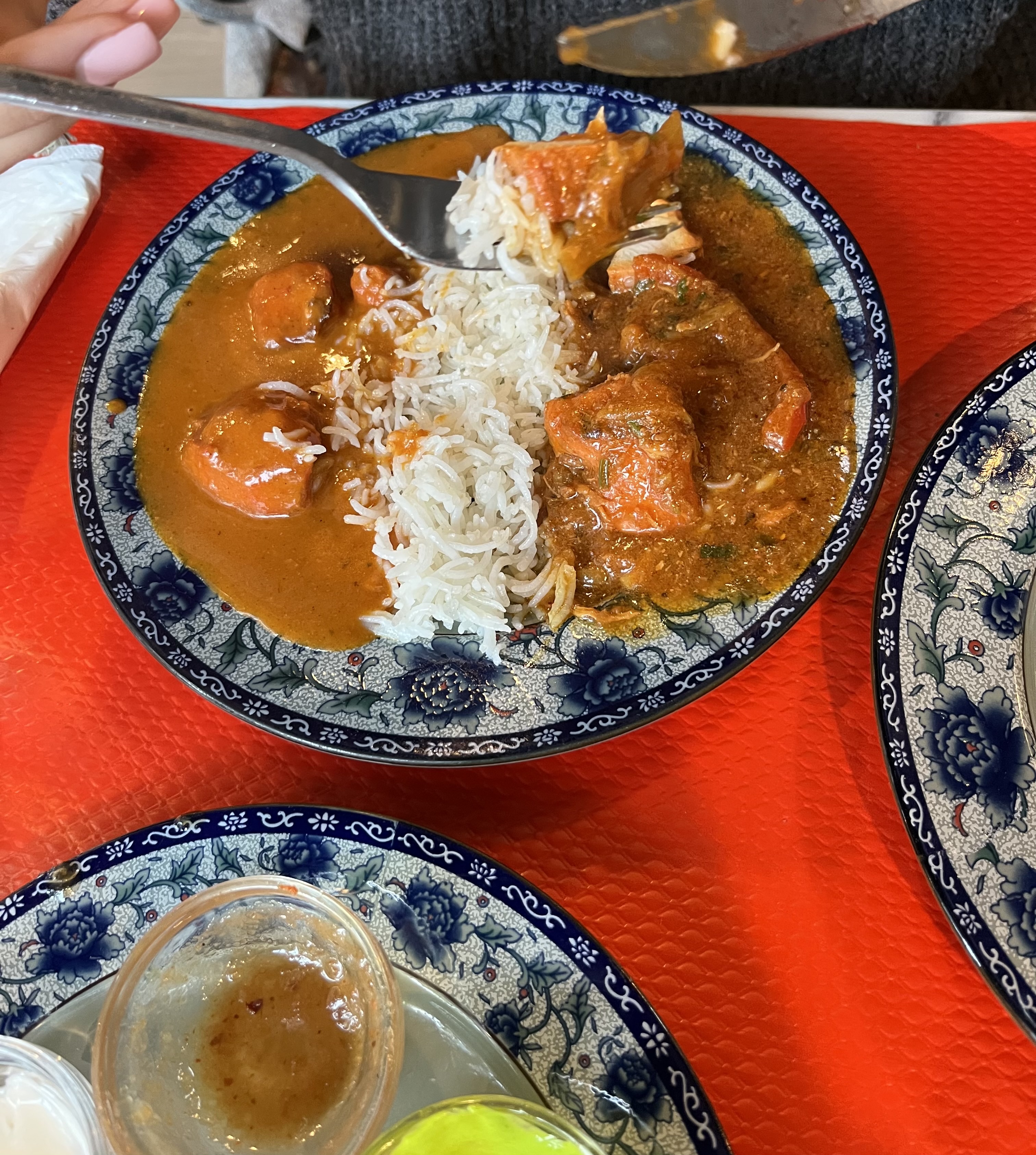 Sol ultra glissant sûrement gras Serveuse qui nous tousse dessus et renifle en prenant la commande Pas beaucoup de choix et qualité pas terrible des bout dos de poulet dans la sauce butter chiken Pas d'essuie main ou de sèche main qui fonctionne aux WC Murs sales et humides. Butter chiken sucré avec un goût de porc au caramel et aya Nakamura en fond nous ne reviendrons pas.
