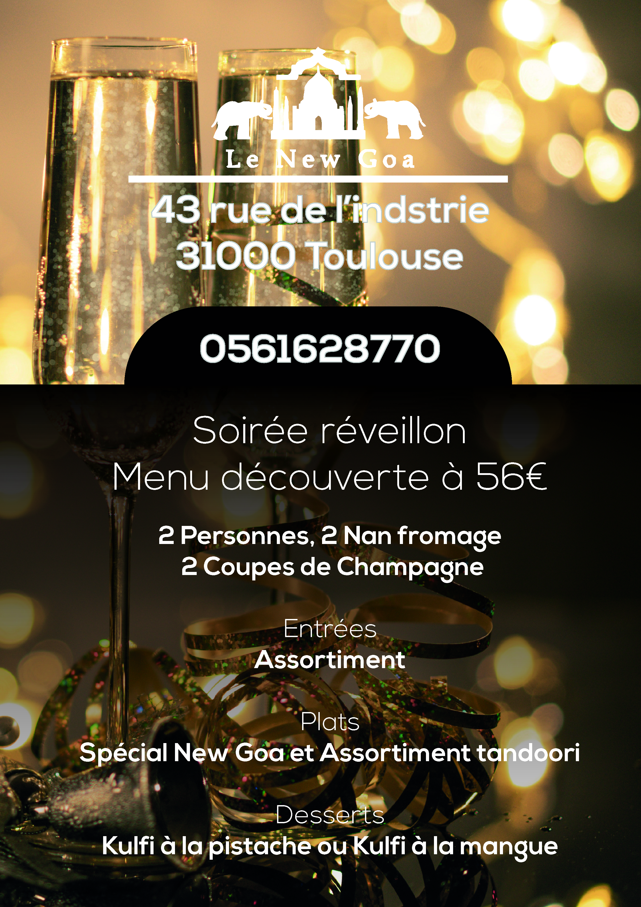Nous avons diné au New Goa un samedi soir, l'accueil est chaleureux et la cuisine très bonne. Cependant il est indiqué sur la promo La Fourchette : 40% de réduction sur la carte... ce n'est pas exact ! La promo de 40% est uniquement sur le plat principal pris à la carte !?!? De plus, beaucoup des réservations étaient faites par La Fourchette, il y avait un surbooking et le service s'en est fortement ressenti... les plats servis très très rapidement et l'addition est arrivée tout de suite après le dessert sans aucune proposition de café ou thé puisque des gens attendaient sur le trottoir pour avoir une table. C'est dommage, mais cela n'enlève rien à la qualité de la cuisine du restaurant, nous avons très bien diner, il faudra revenir en semaine pour profiter du digestif éventuellement offert !!!