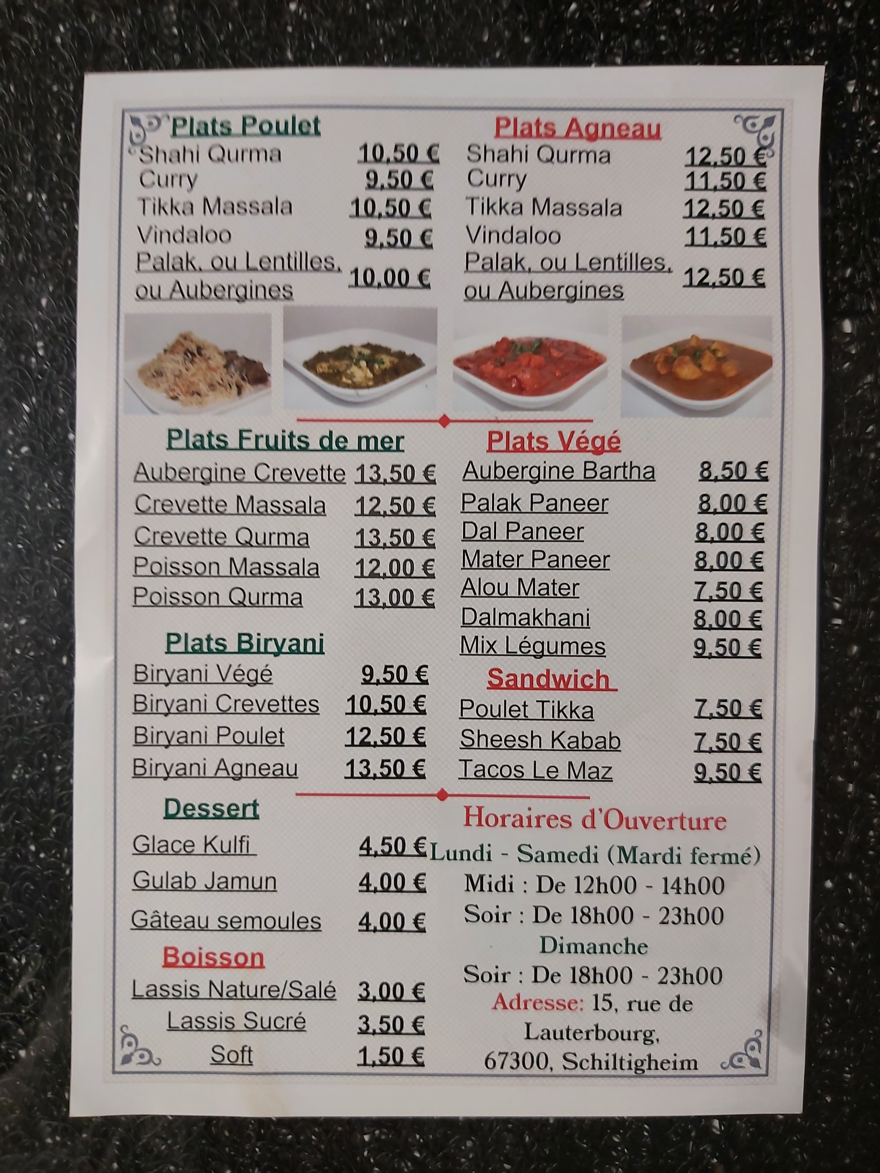 Je suis venu en Mai dernier. J'avais pris un poulet Tikka massala avec du riz et un cheeese naan. Le poulet Tikka massala était très bon et bien épicé comme il faut. Le cheese naan aussi était très bon. Le temps de préparation était long. Sinon j'ai rien à redire