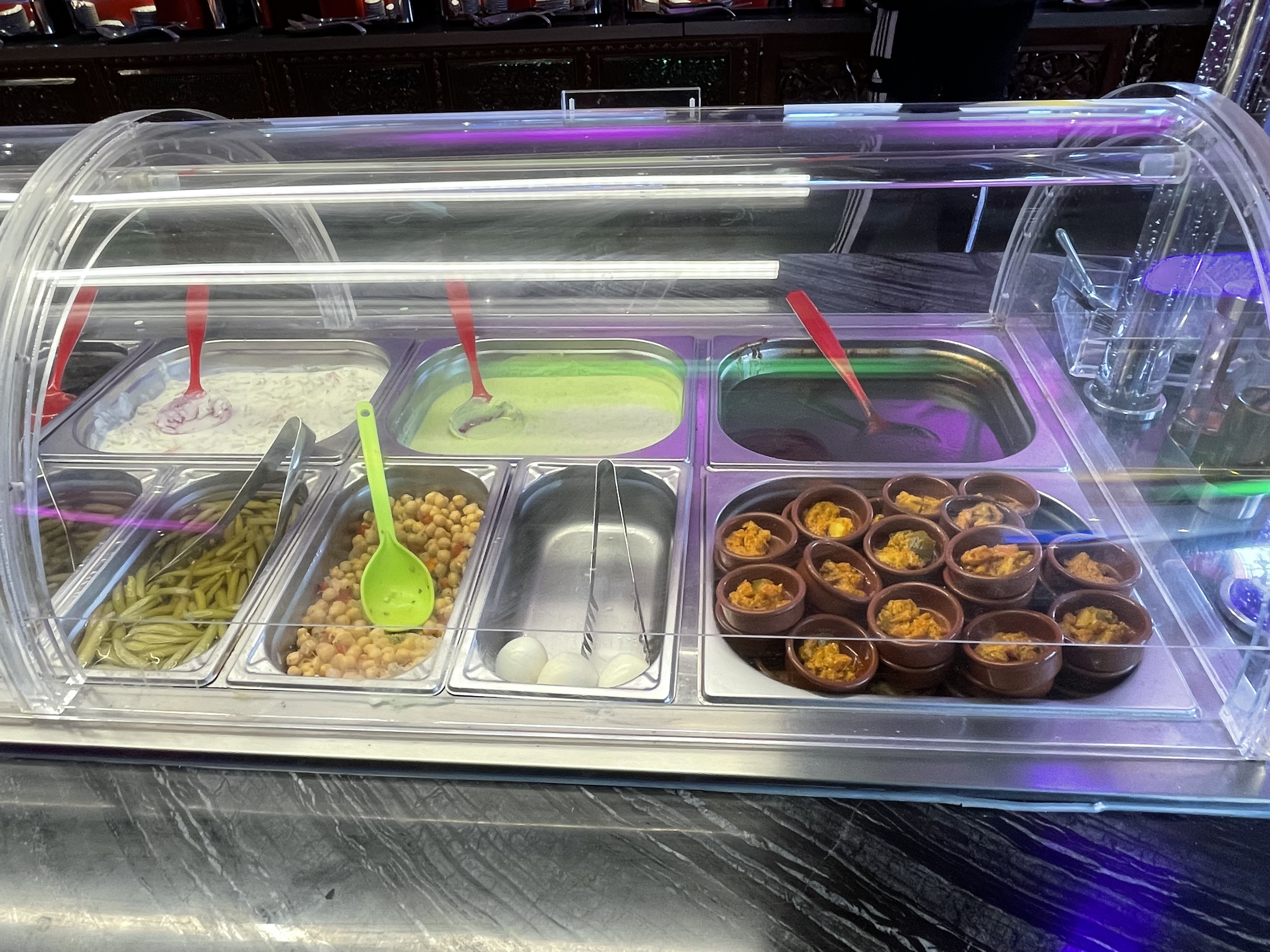 Personnel attentif ...pas beaucoup de choix relativement bon cuisine coloré et parfumé Les desserts sont très décevant comparé au reste Le lassi mangue est une merveille