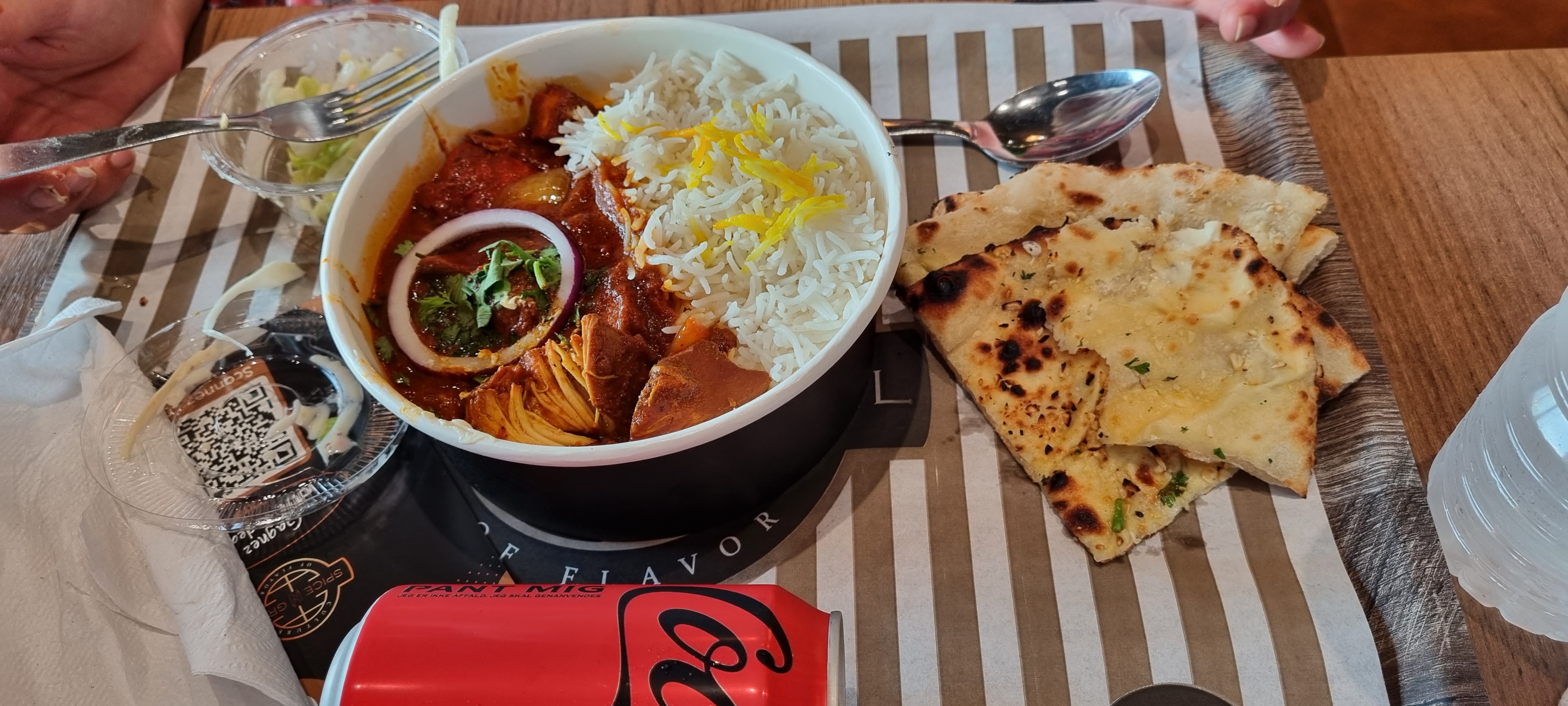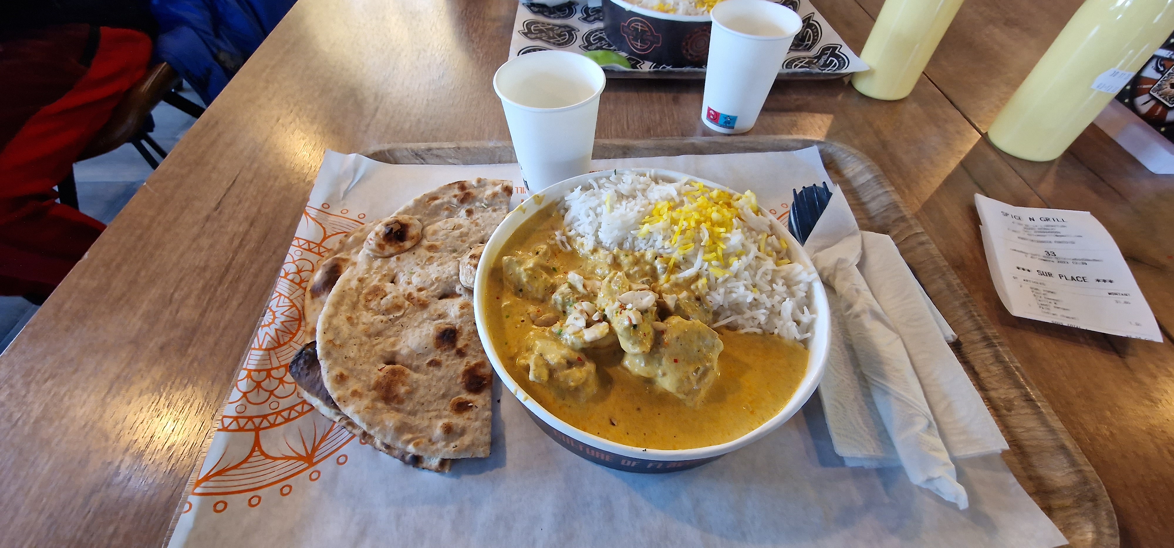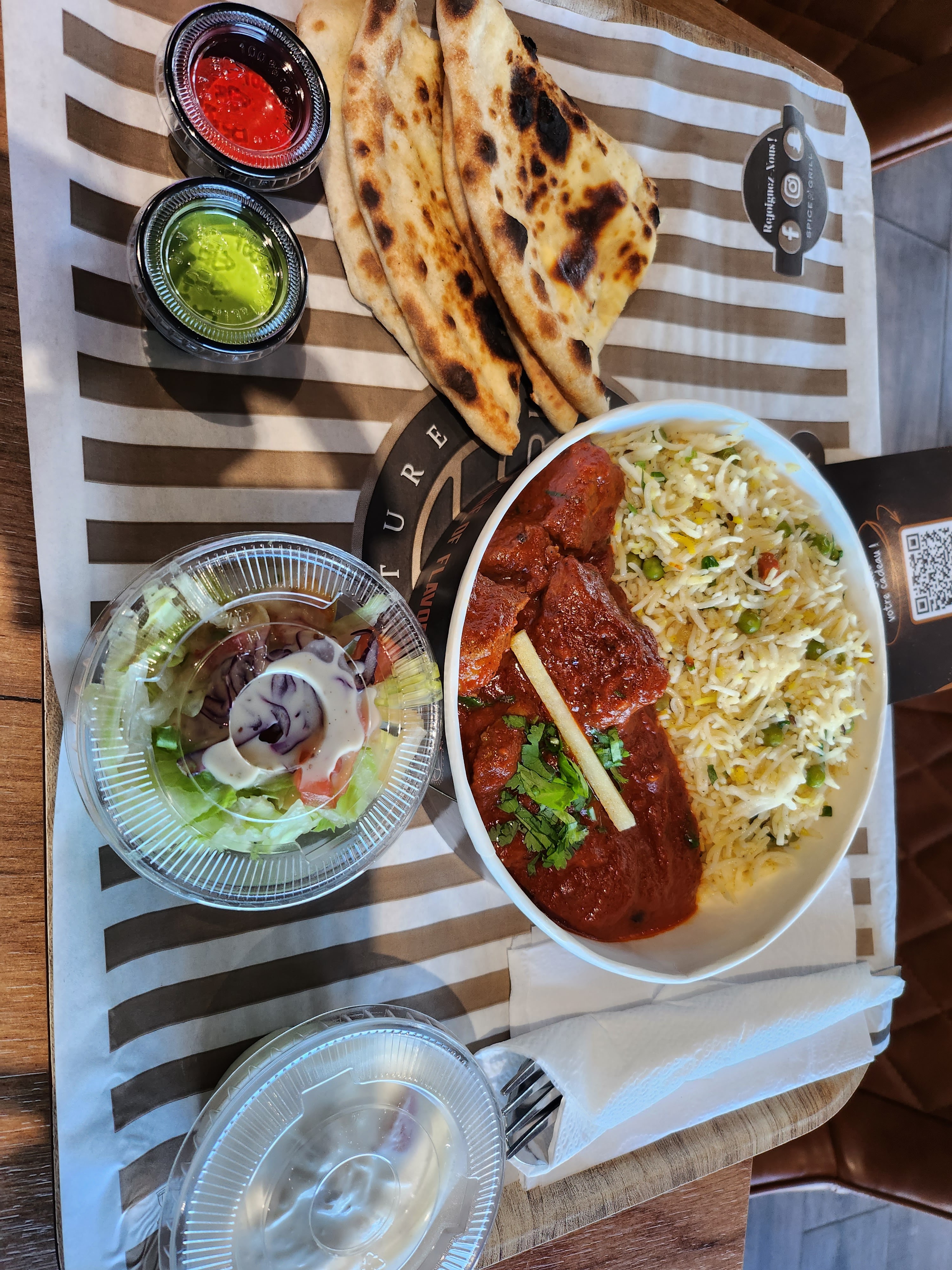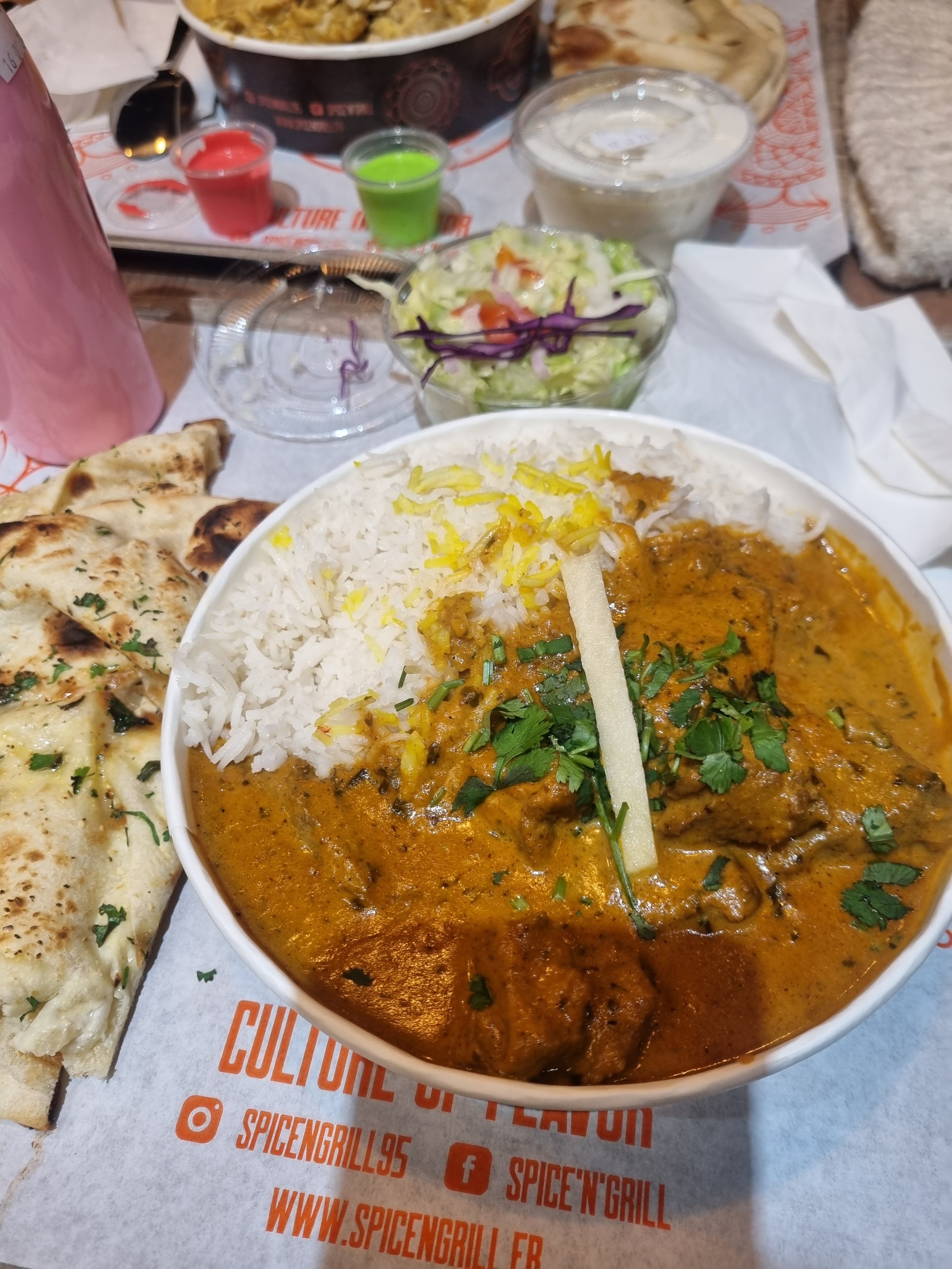 Le cadre est sympa, local neuf et propre. Concernant le plat, j’ai pris un butter chicken, le riz était bon mais je n’ai pas retrouvé le goût initial du butter chicken. Pour finir j’ai pris un lassi mangue qui était plutôt bon 👍🏻 Le parking est très petit, c’est dommage …