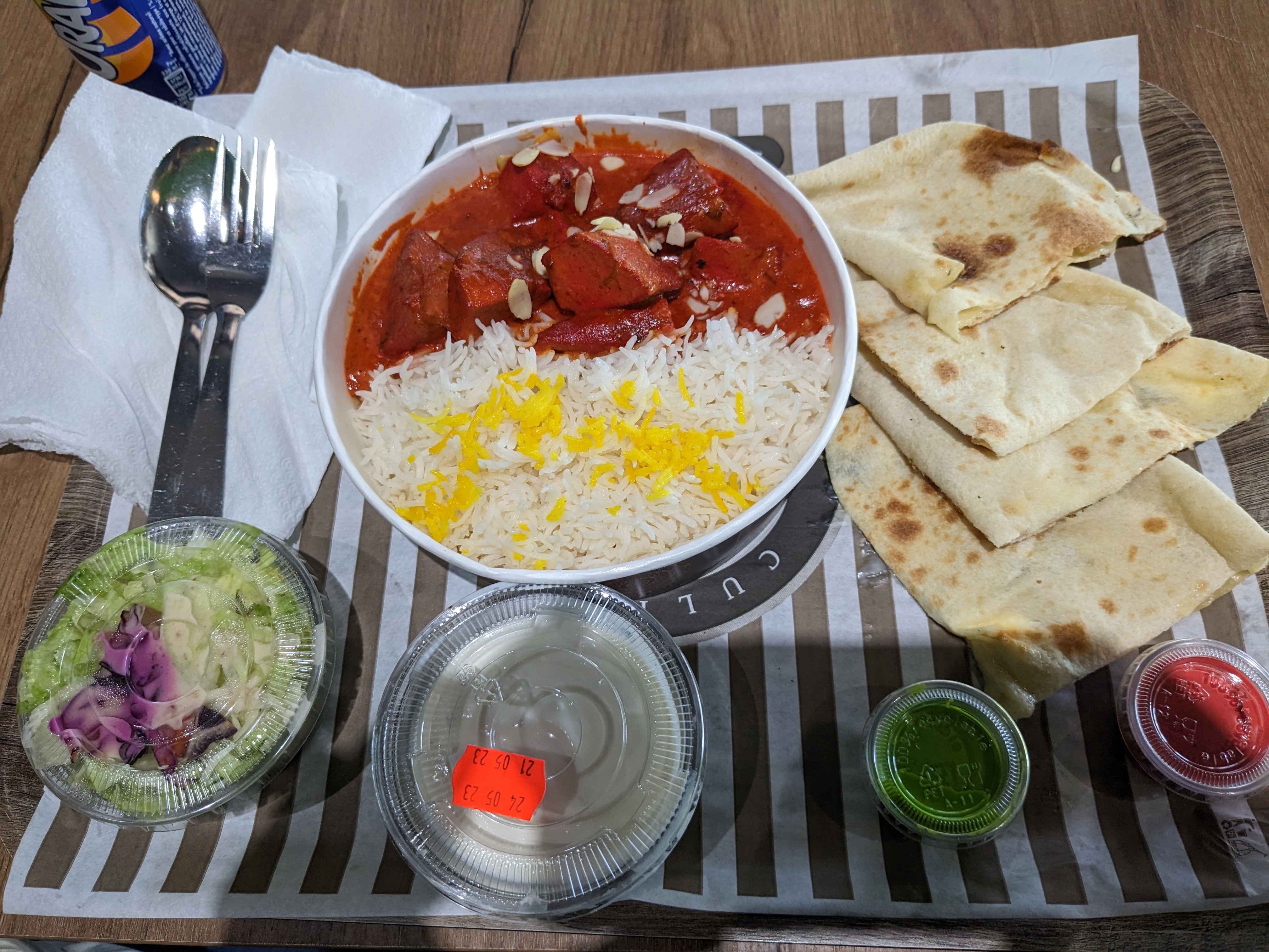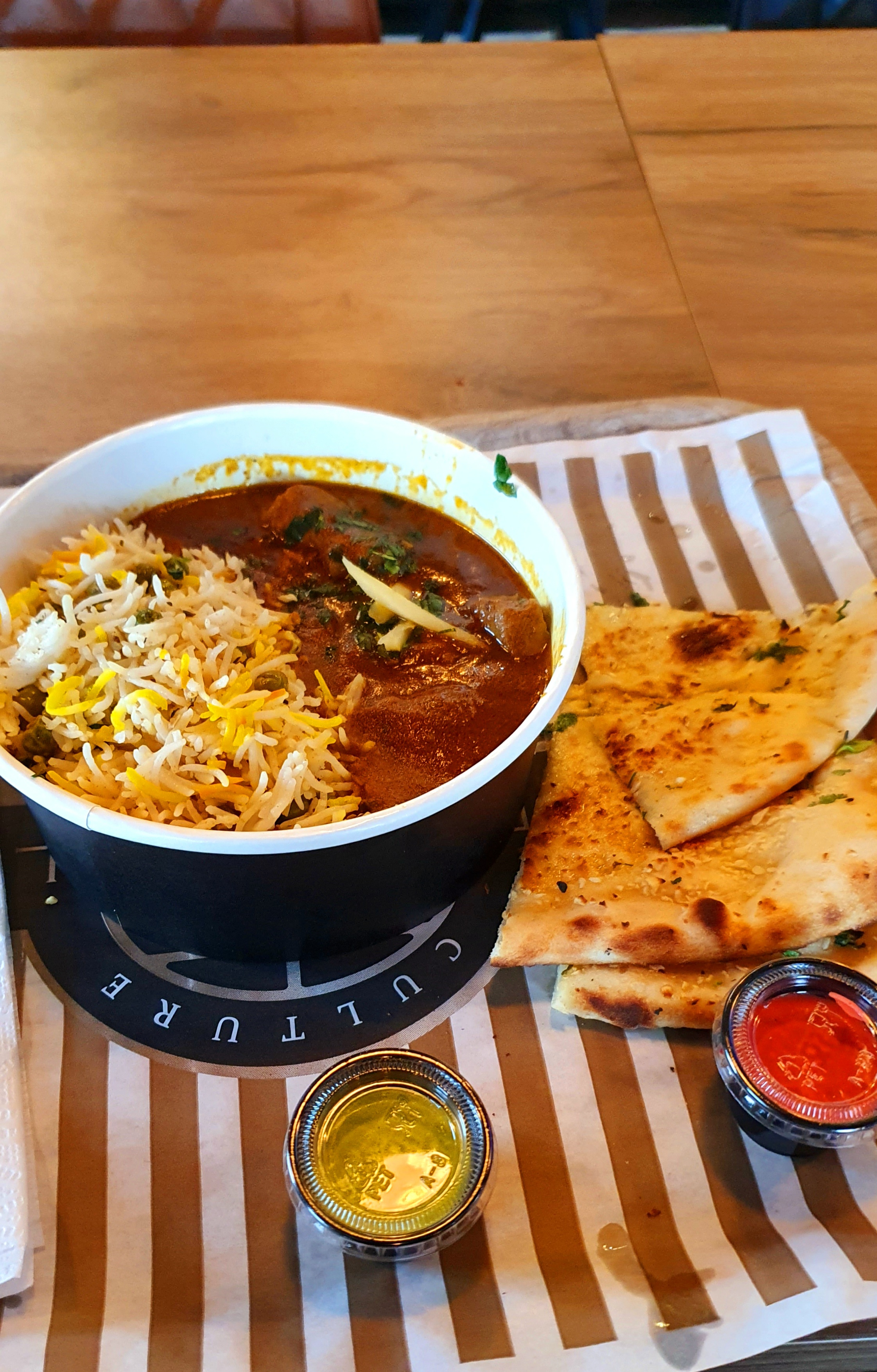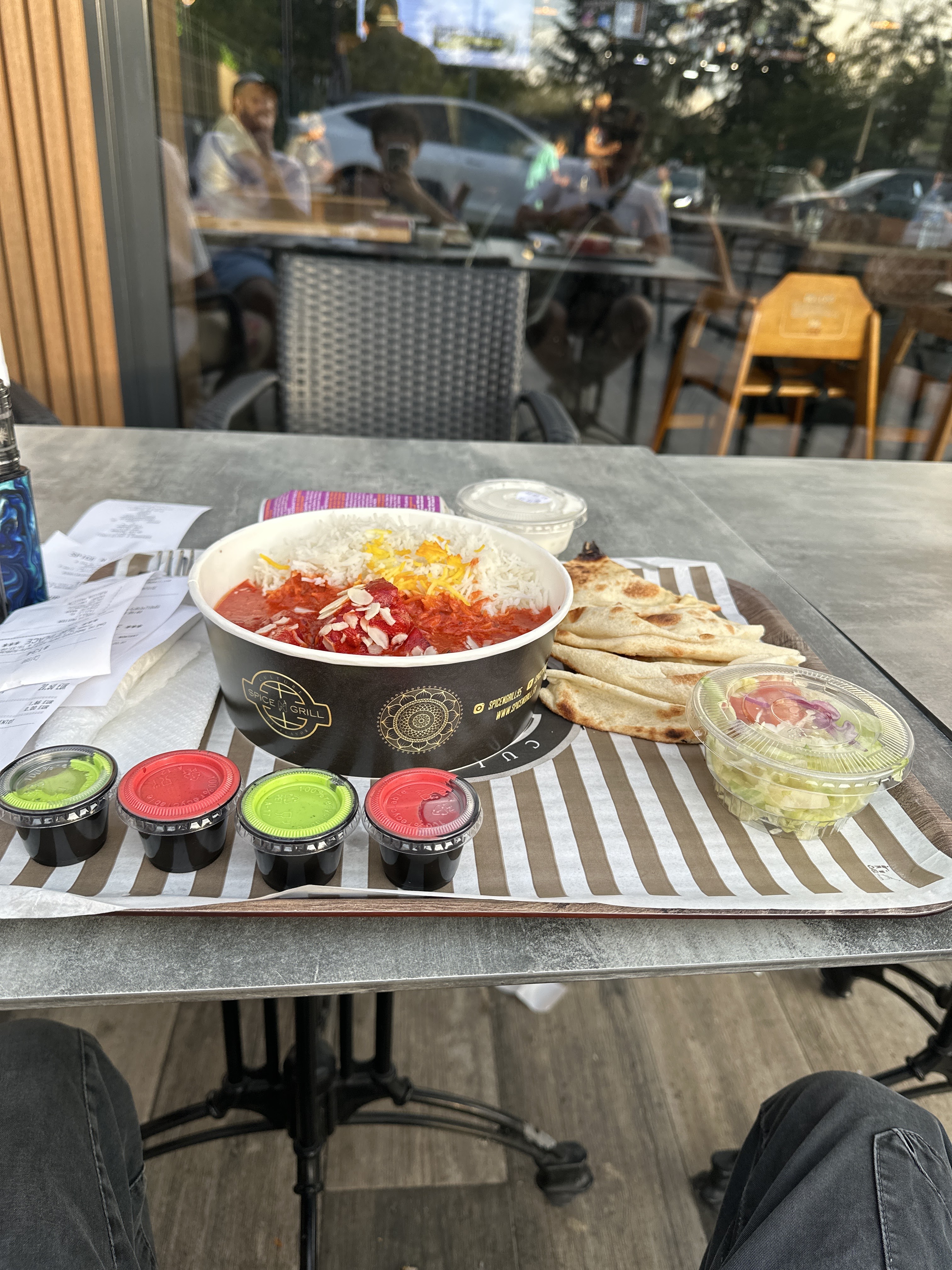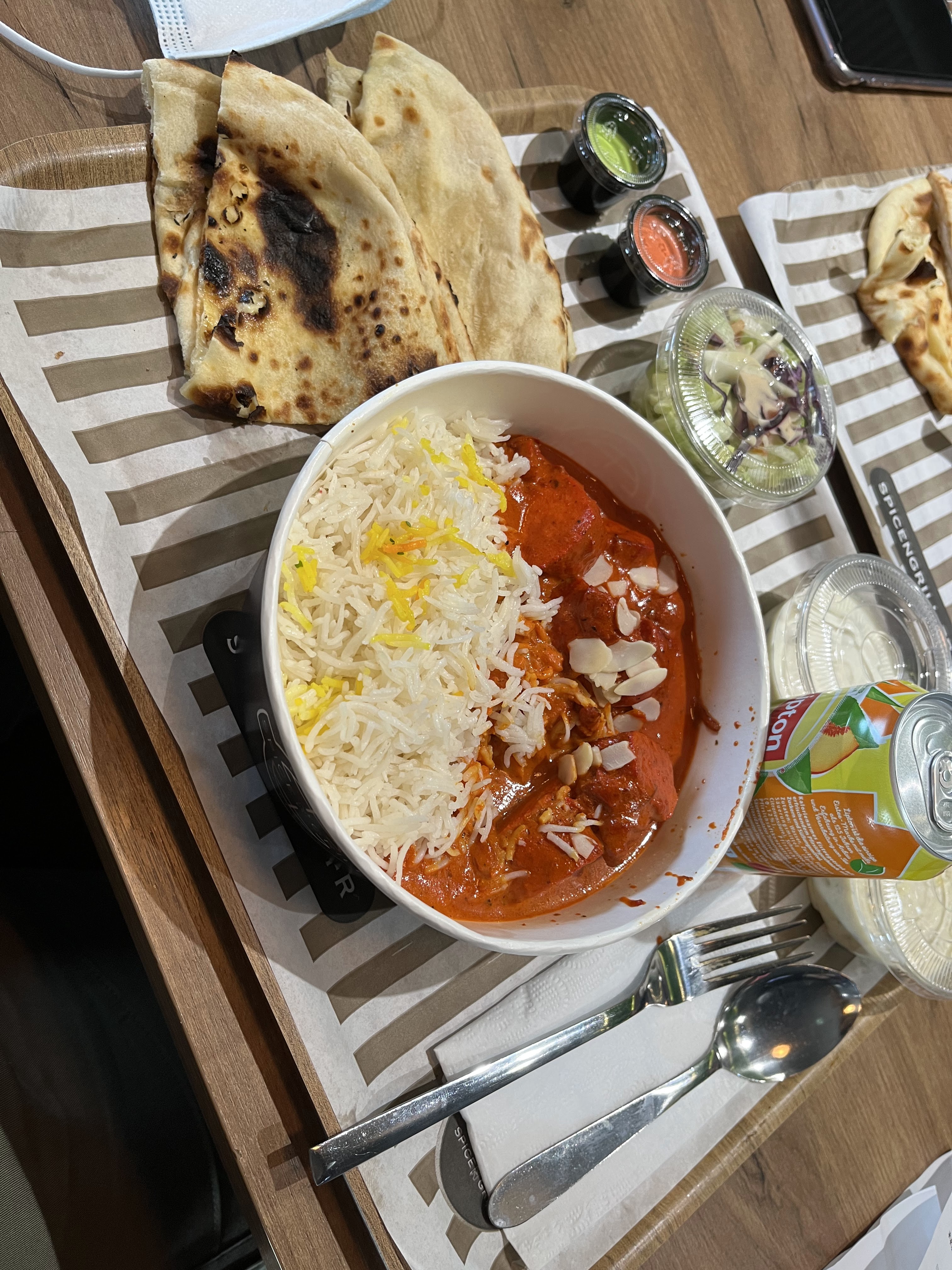 Le cadre est sympa, local neuf et propre. Concernant le plat, j’ai pris un butter chicken, le riz était bon mais je n’ai pas retrouvé le goût initial du butter chicken. Pour finir j’ai pris un lassi mangue qui était plutôt bon 👍🏻 Le parking est très petit, c’est dommage …