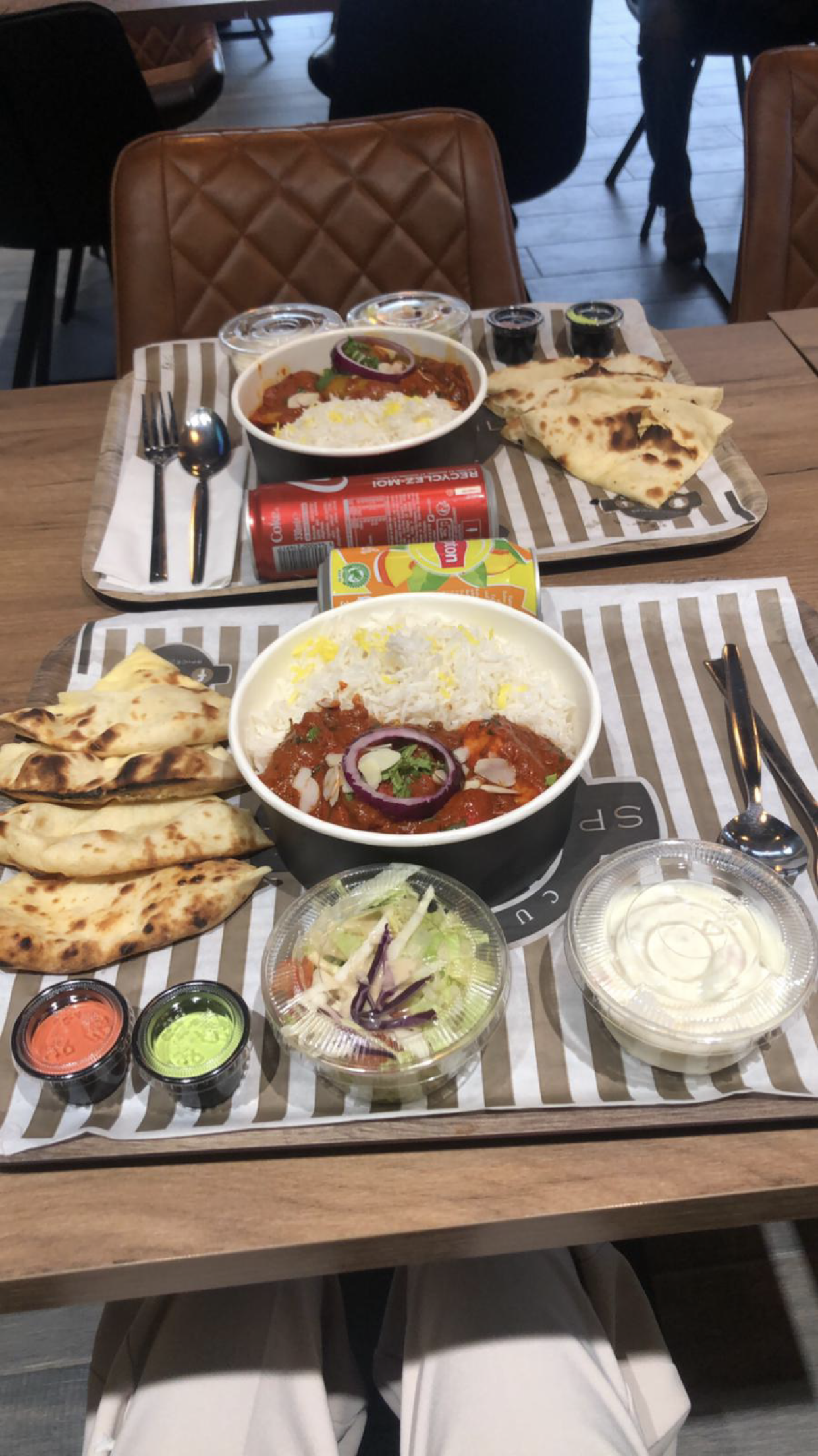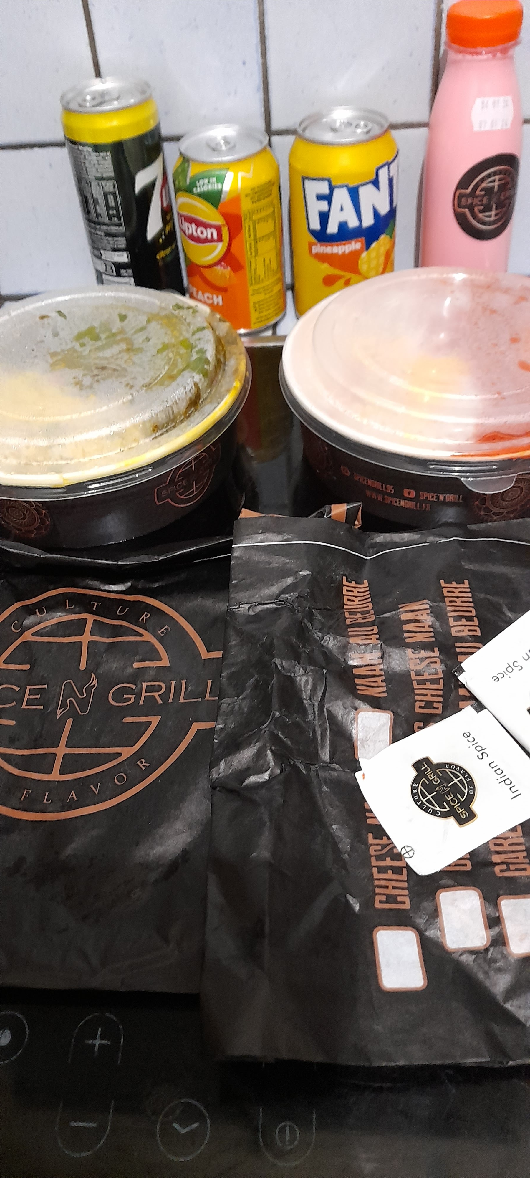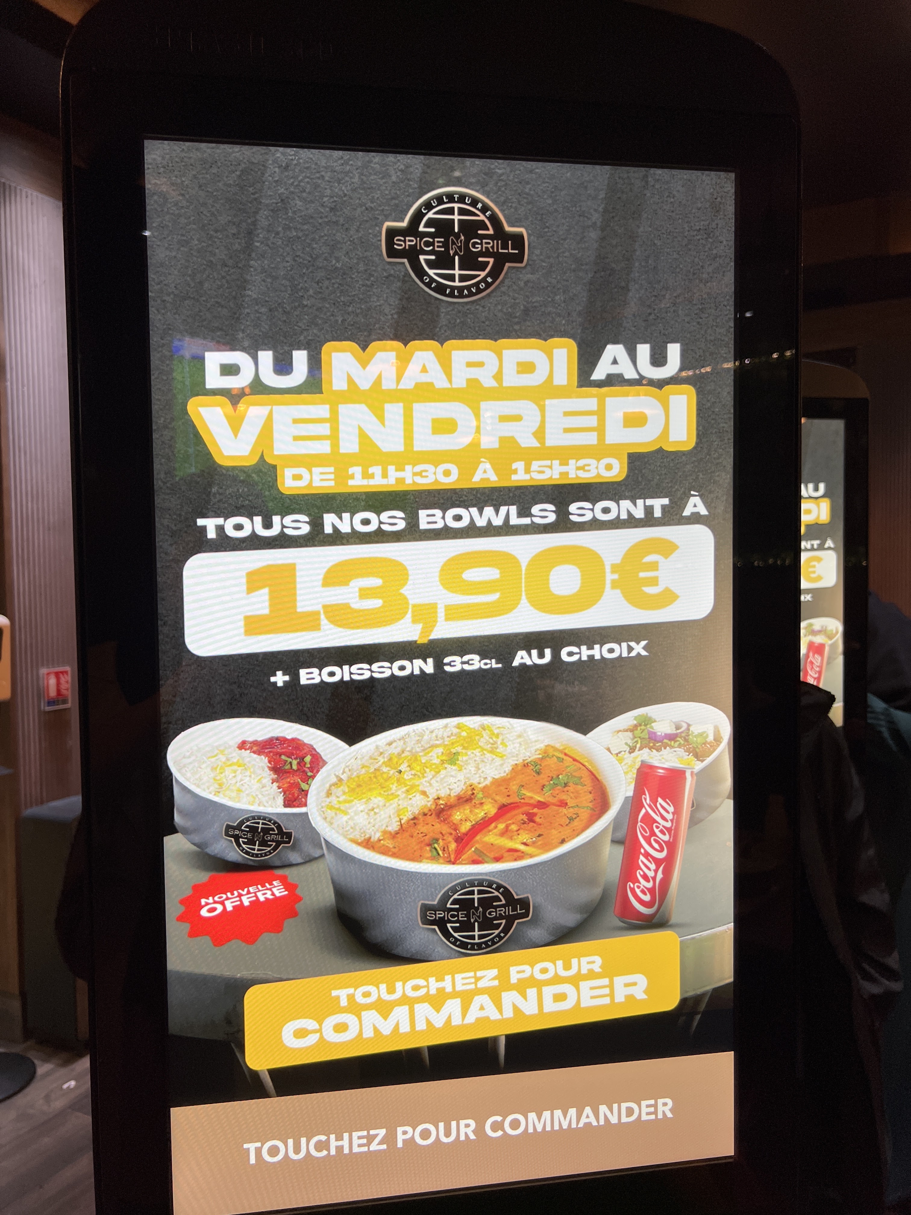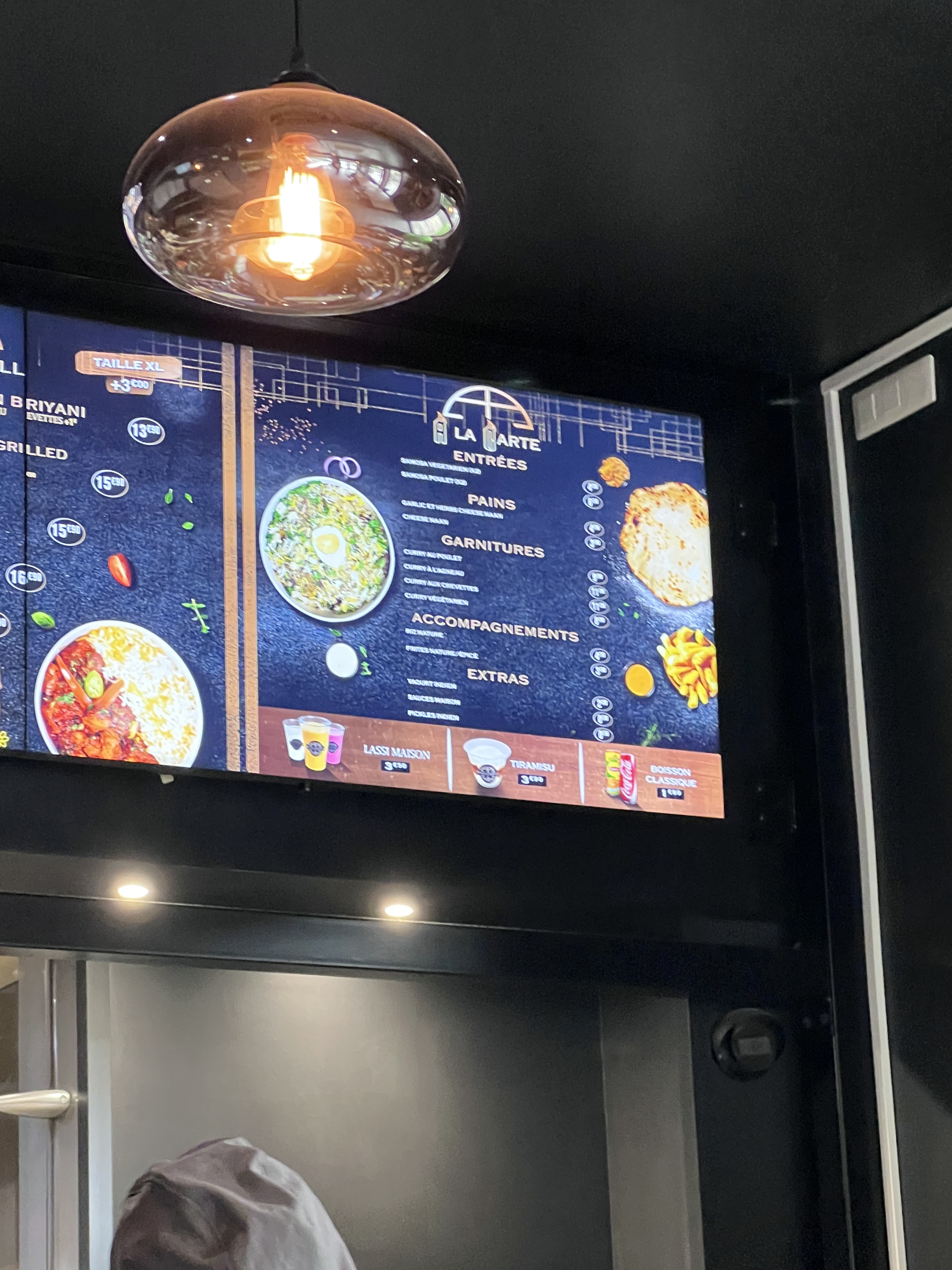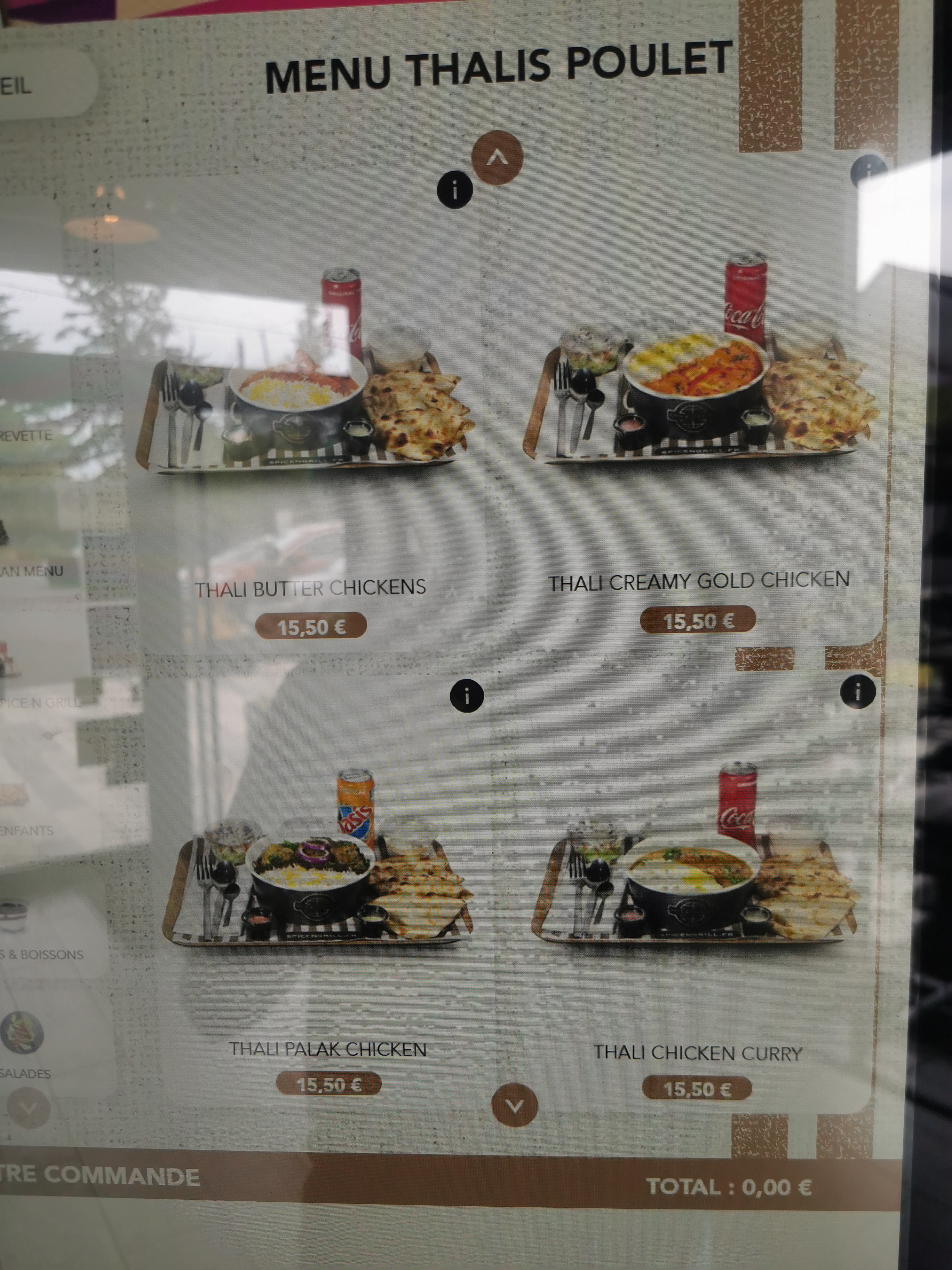 Commande un peu compliquée car les bornes sont pas si bien faîtes que ça ! Dans le menu vous avez le droit à un naan fromage sauf qu'il faut rajouter 0,60 € pour l'avoir ! Les boissons comprises dans le menu sont tout en bas des boissons. Sinon les plats sont bons mais peut être qu'il manque un peu de sel ! Dommage qu'il n'y ait pas de piment