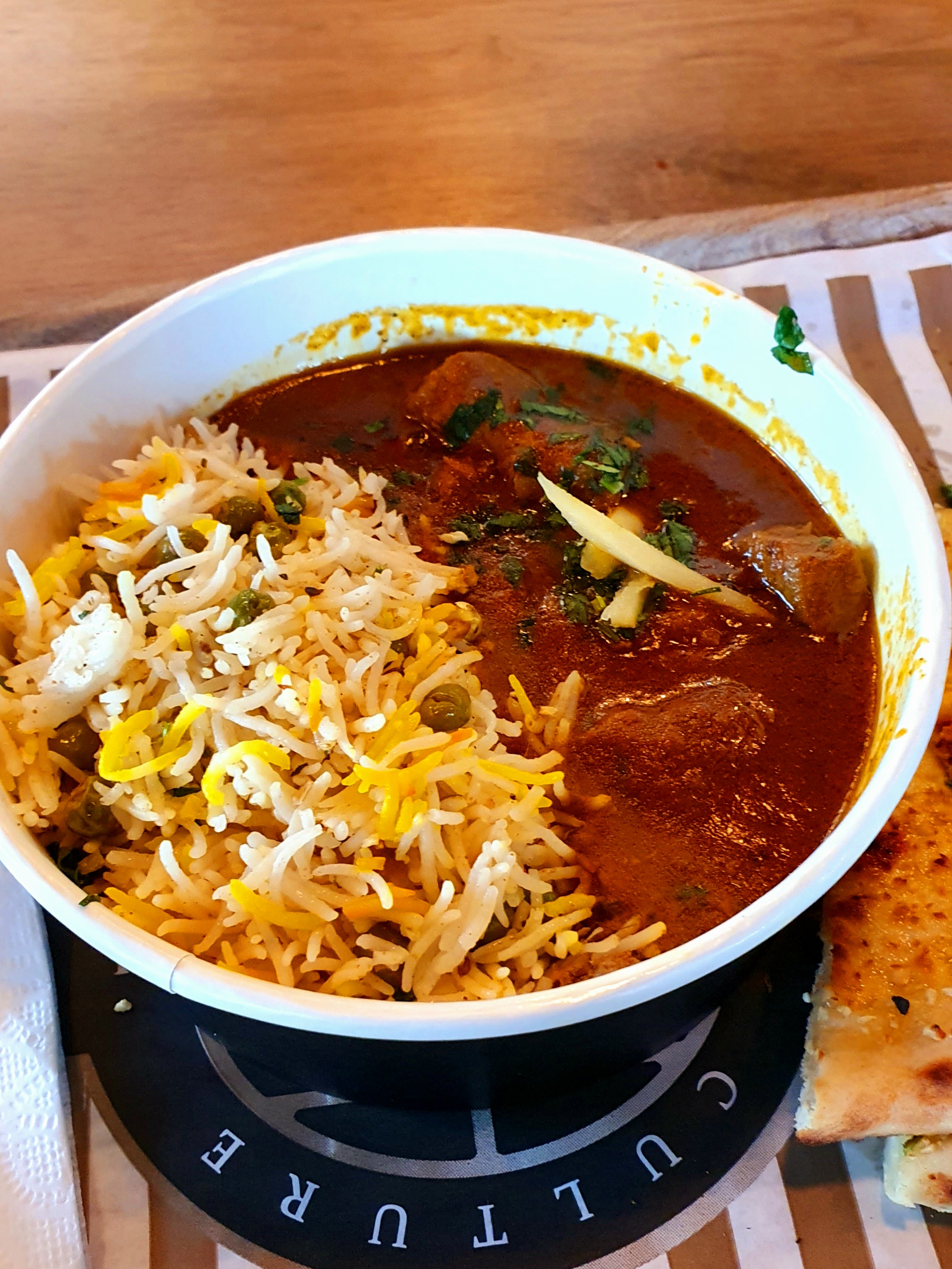 Petit fast food indien sans prétention mais gustativement parfait. Venue manger trois fois avant de me faire un avis définitif... 1ère fois : l'extase. Découverte d'une carte assez variée avec l'essentiel de la cuisine indienne pour des tarifs très attractifs sans que cela n'altère le goût et la qualité dans nos assiettes. Je repars conquise. 2ème fois : assez mécontente. Je n'ai pas reconnu mon expérience de la première fois, la sauce tikka massala était coupée avec de la crème fraîche, le tout était insipide, le personnel était débordé de commandes c'était en soirée, donc pas mal d'oublis (boissons, serviettes, sauces...). 3ème fois : parfait. Les plats étaient suffisamment épicés (j'ai dû quand même le préciser au comptoir), les portions toujours aussi GÉNÉREUSES... Les points forts : la cuisine, c'est bien relevé, bien épicé sans faire trop, les lassis sont bons, byrianis bien parfumés, les naans croustillants et tendres, gros coup de coeur pour la naanizza qui est une bonne idée... Attention à éviter de manger sur place en soirée, c'est très très bruyant, on a du mal à trouver une place assise. C'est également la cata pour se garer, le parking est ridiculeusement minuscule. Je reviendrai aussi souvent que je le peux/passe dans les environs.